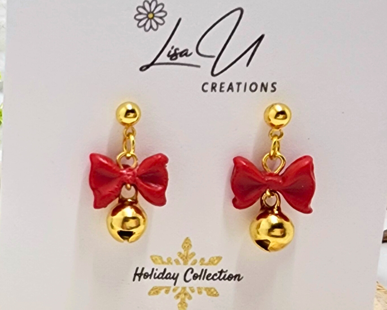 Get ready to sleigh the holiday season with these adorable Red Bow and Gold Christmas Bell Dangle Earrings from the Lisa U Creations Holiday Collection!