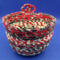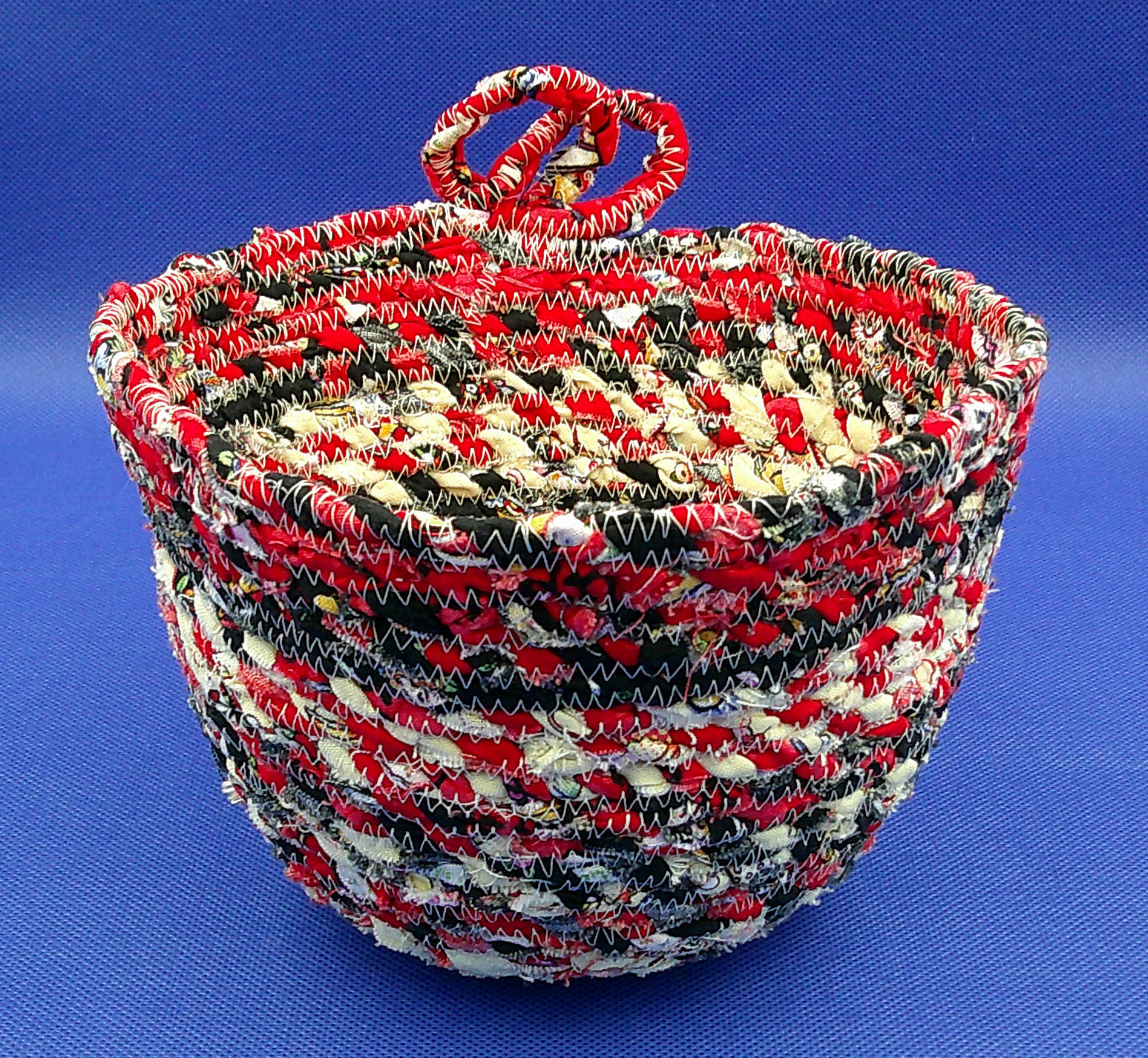It takes hours and hours to make fabric rope. Once you have all of your scraps ready and your scissors, you can get into a rhythm and it's not so bad. The edges are raw, so that is why you'll sometimes see loose threads. I hadn't tried red, cream, and black before. I'm very pleased with how it turned out. When I start making the bowls, I let it evolve and just go with the flow. As it turned out, by making loops as the final detail, this particular bowl can even be used as a knitting bowl.