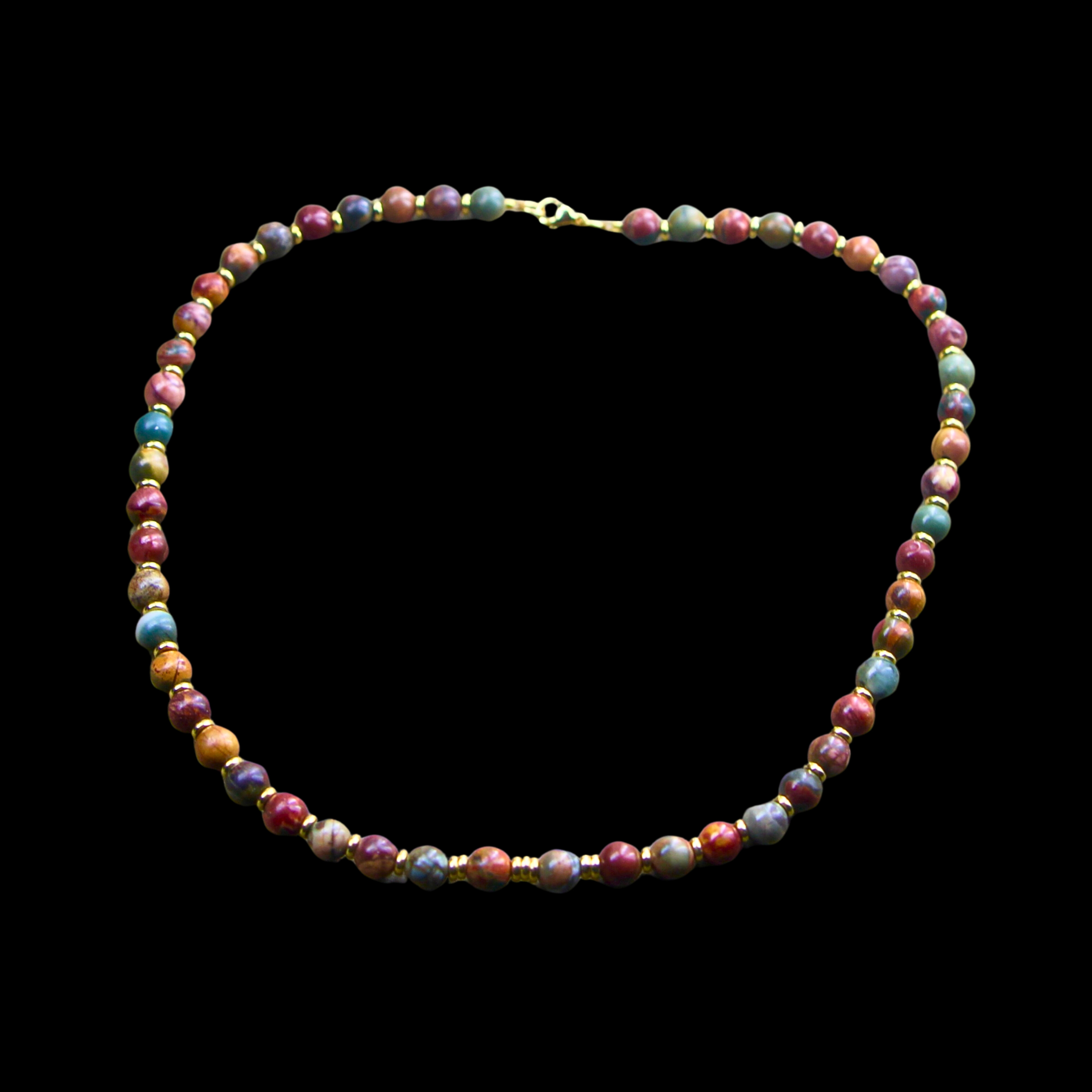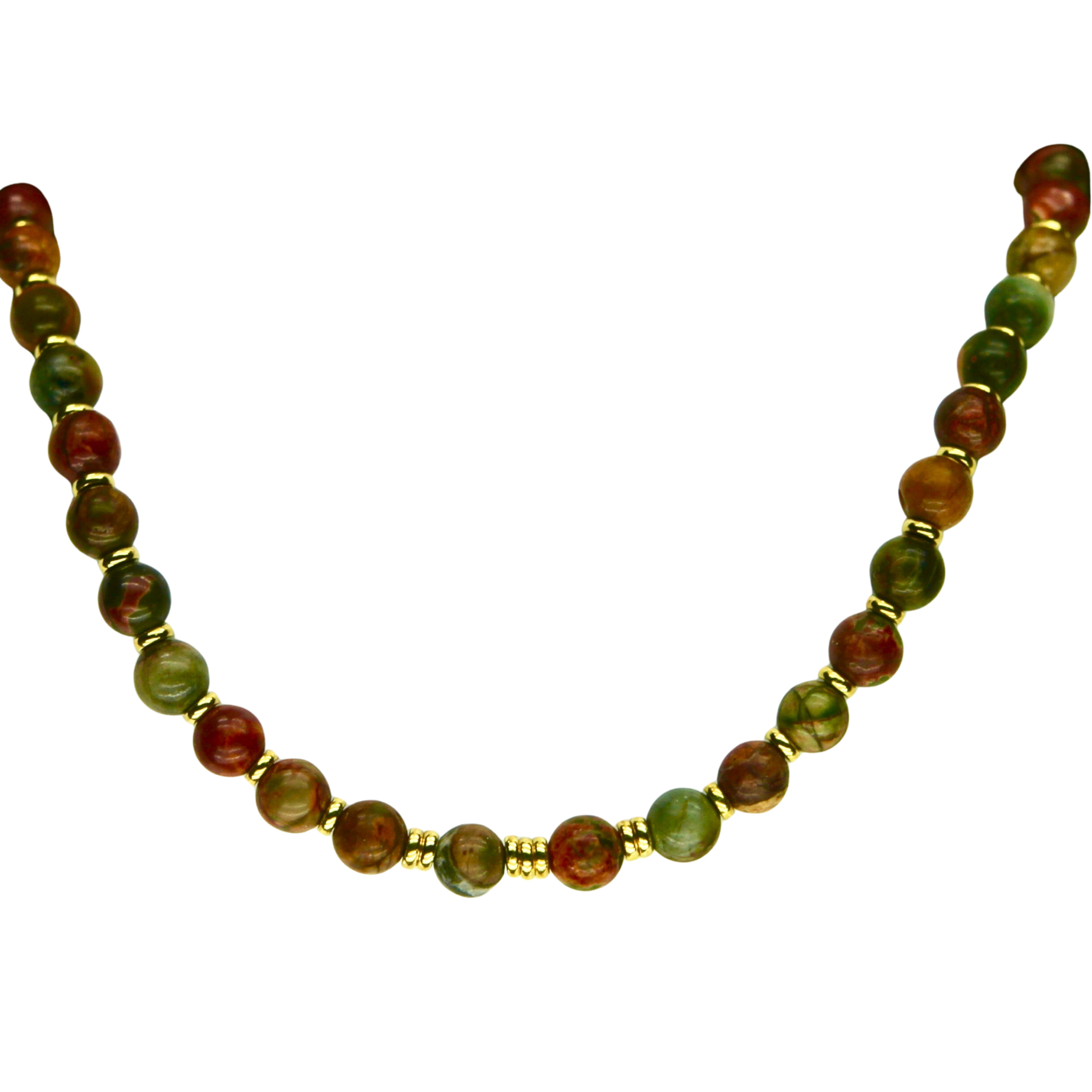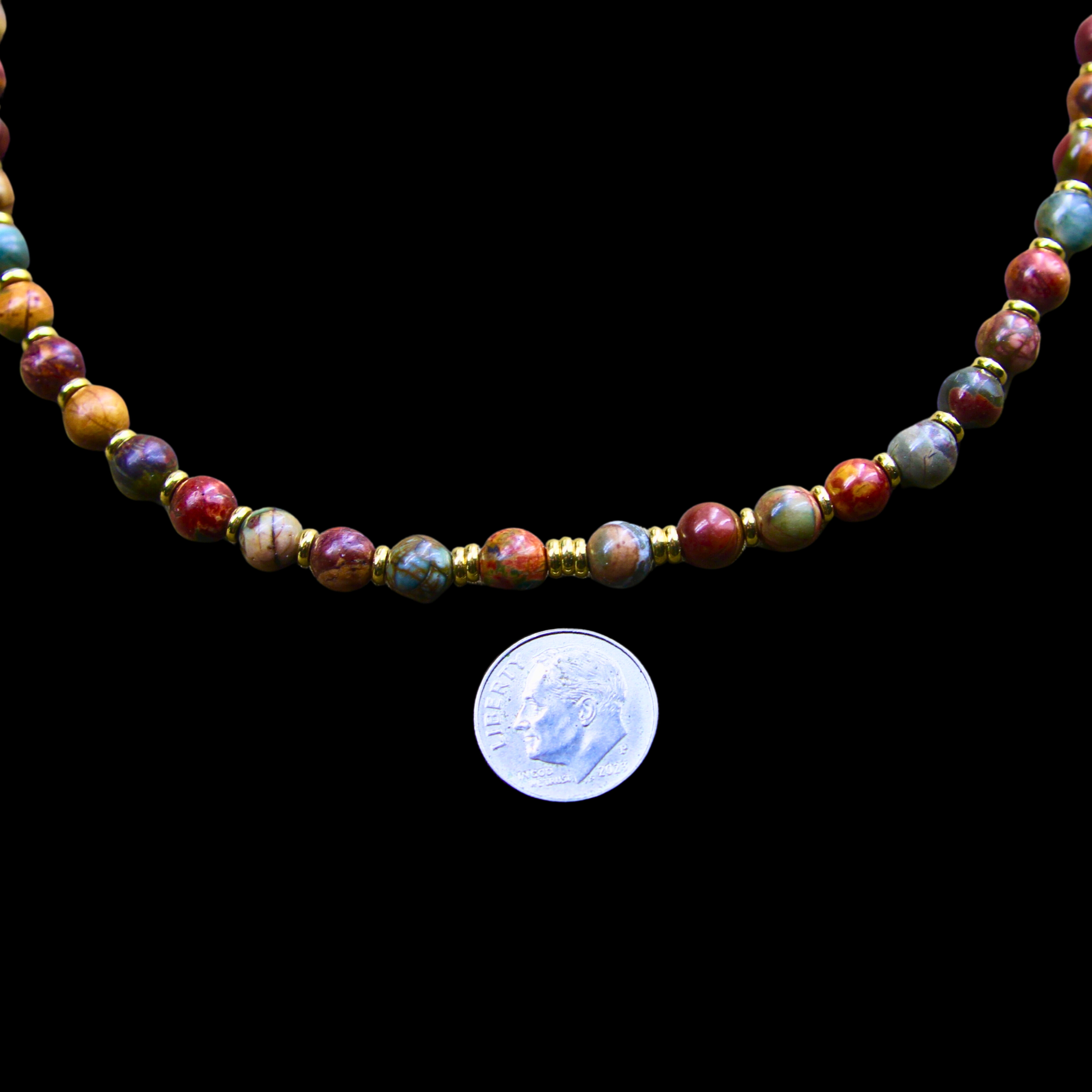 Each necklace is made to order and sized to your specific needs. I select and arrange my Red Creek Jasper gemstones. I then string them alternating with my alternating gold accent beads. I finish the necklace with a gold plated surgical stainless steel lobster claw clasp.