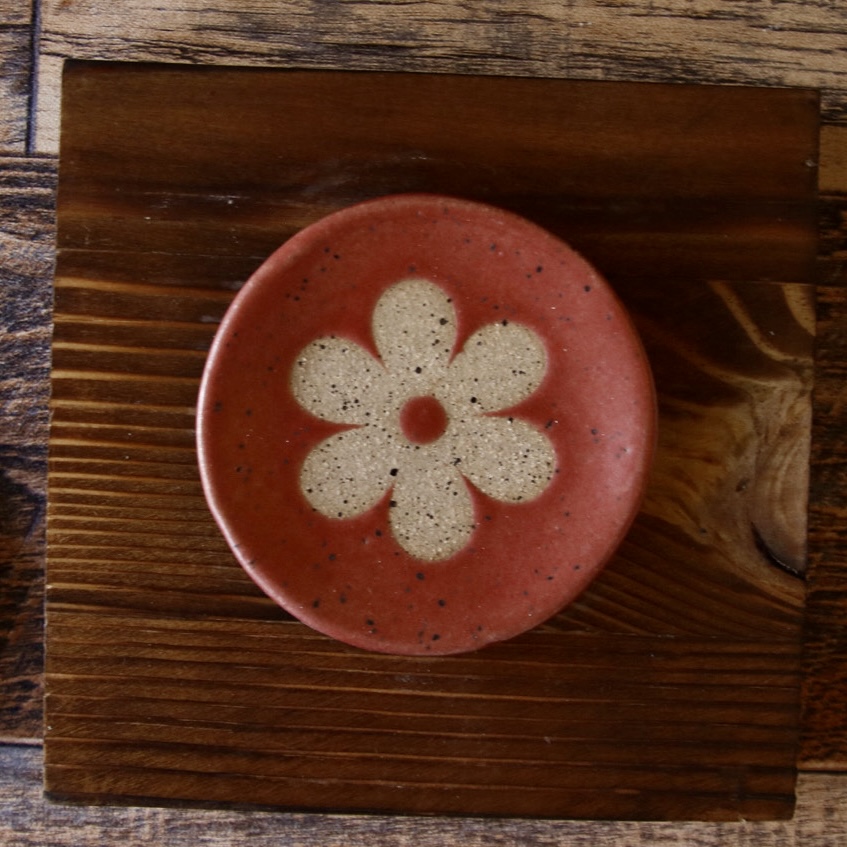 These sweet retro looking flower plates are perfect for use as trinket dishes, tea bag holders, or to hold your coffee spoon. They measure about 3 inches across. The glaze is satiny smooth, with the unglazed flower in brown contrast. It is microwave and dishwasher safe, and the unglazed portion is perfectly safe to rest a spoon. These match the Retro Green Flower Mug.