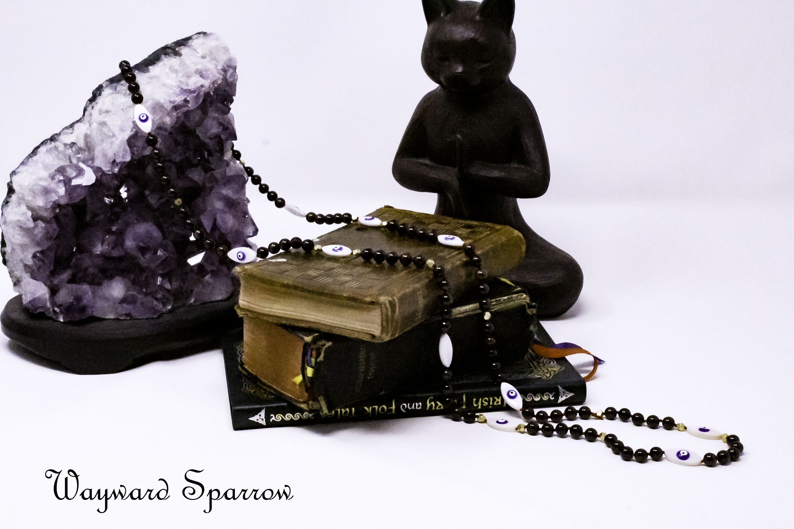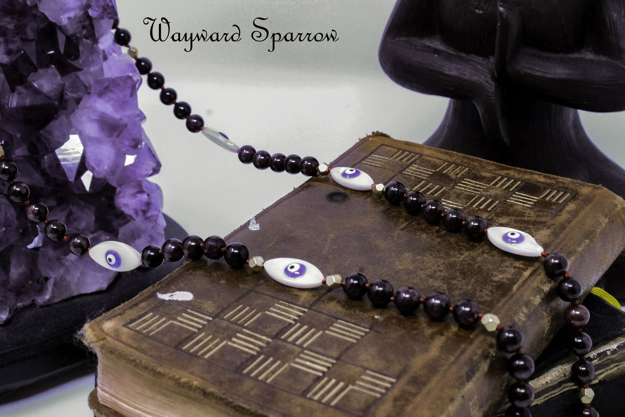 Garnet is known as the stone of passion and strength, believed to inspire courage and positive energy. The mother of pearl evil eye acts as a guardian symbol, reflecting away negativity and inviting peace and balance.