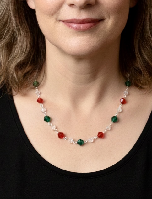 Each piece is meticulously handcrafted with shimmering red and green bicone crystals, interspersed with clear bicone beads for added sparkle and elegance.
