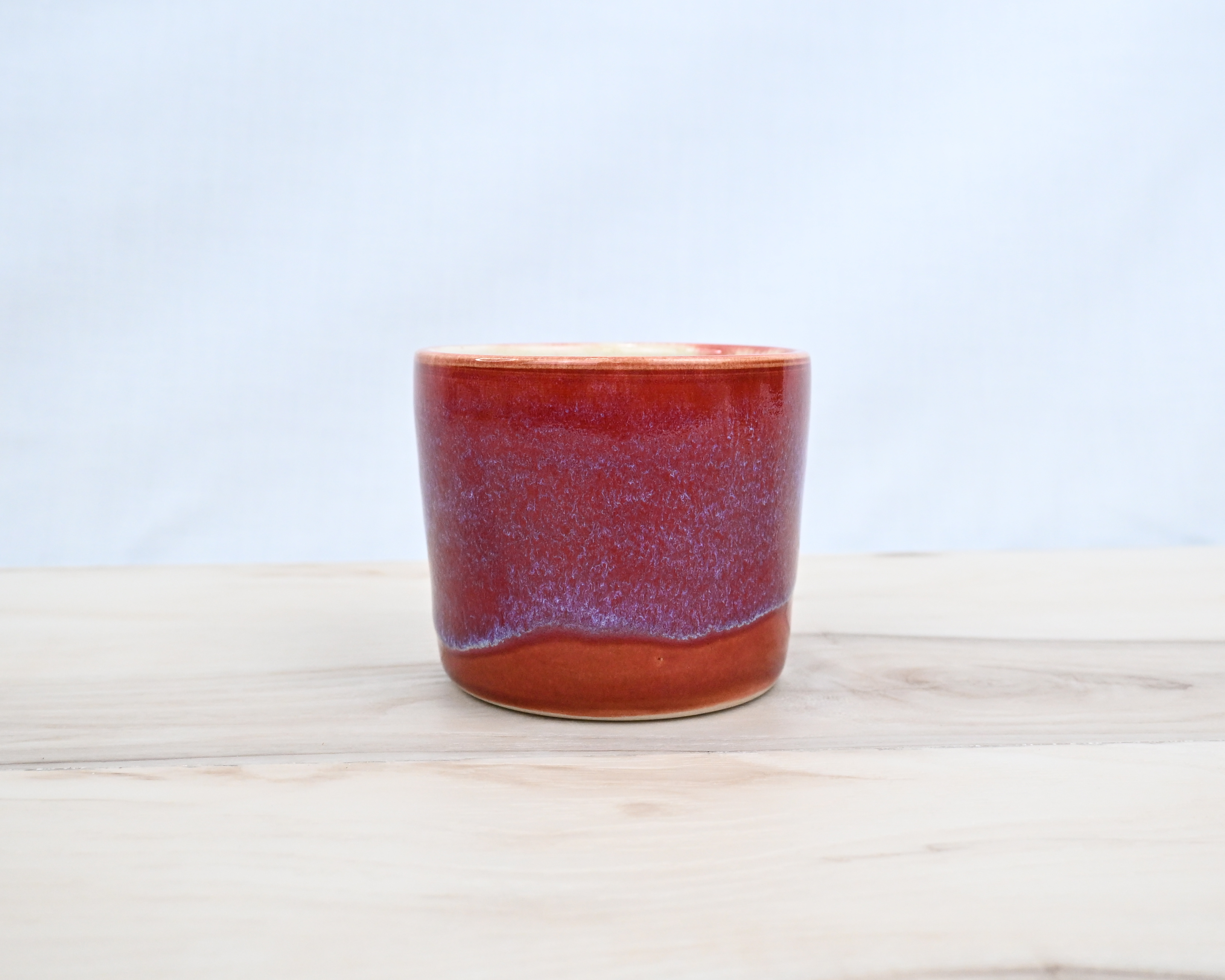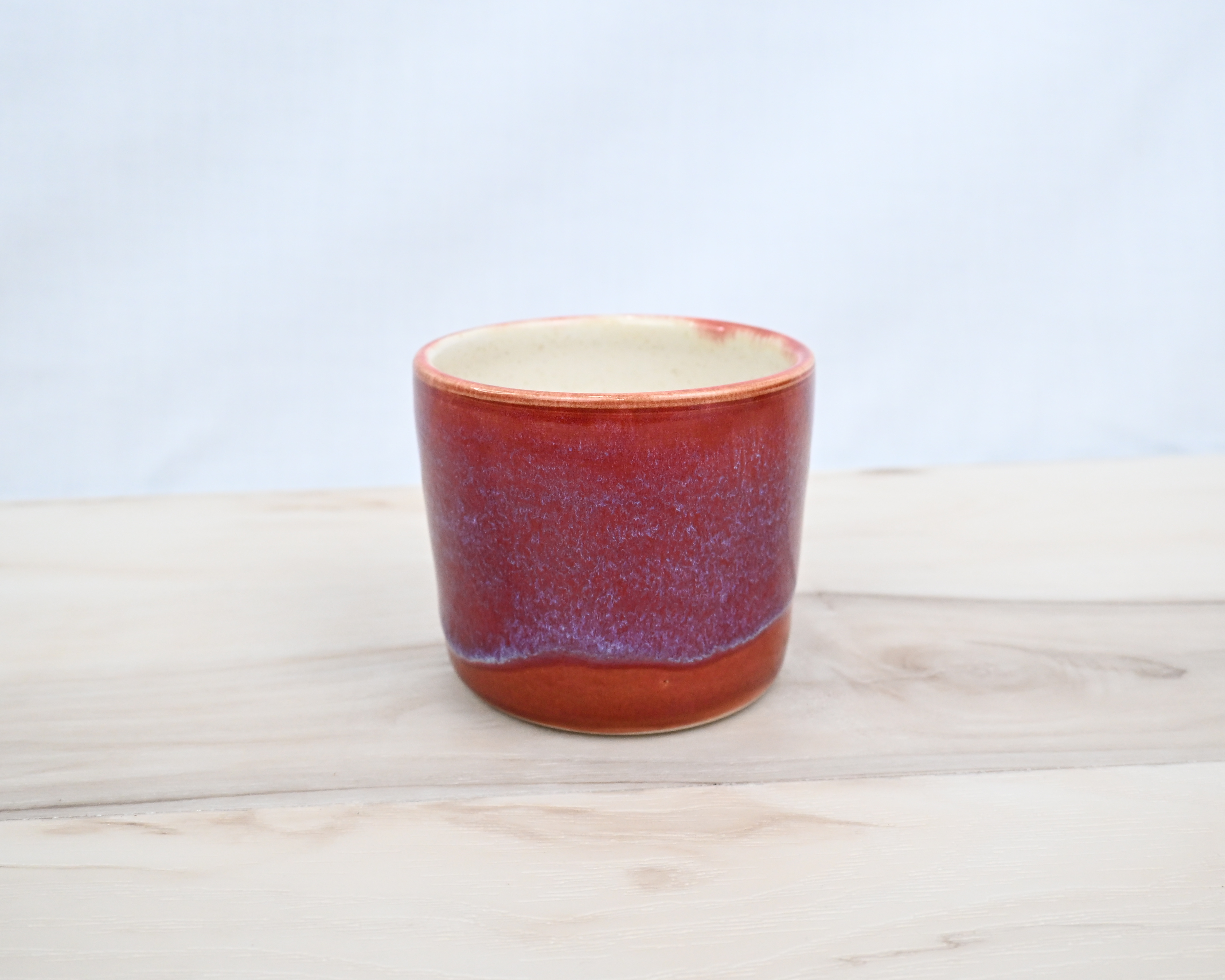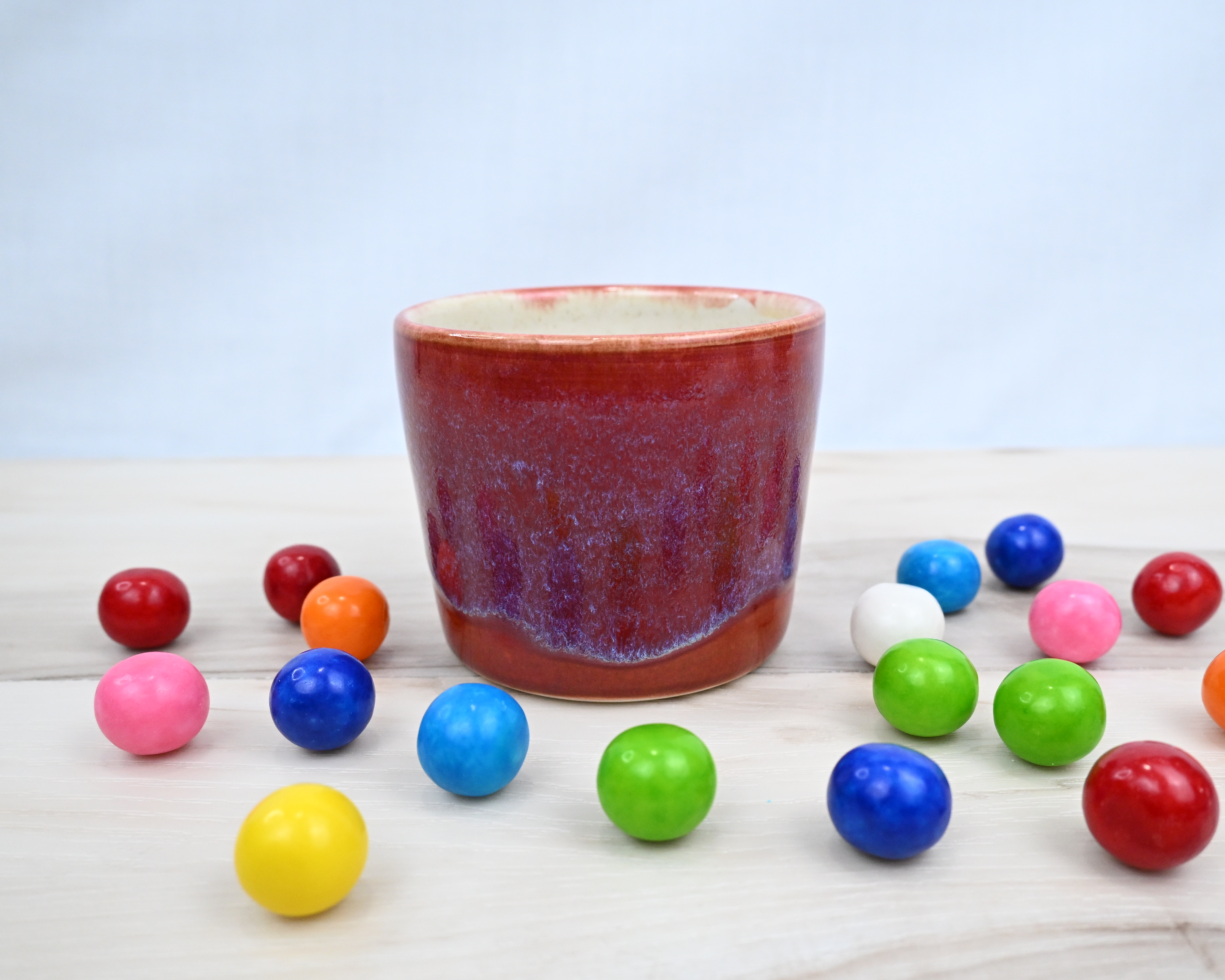 This little cup/trinket dish brings a warm pop of color to the table. The glaze is a rich red that softens into lavender near the base, while the inside is a smooth speckled cream. Whether you use it for tea, nuts, or trinkets, it’s going to be perfect. Not recommended for hot beverages.