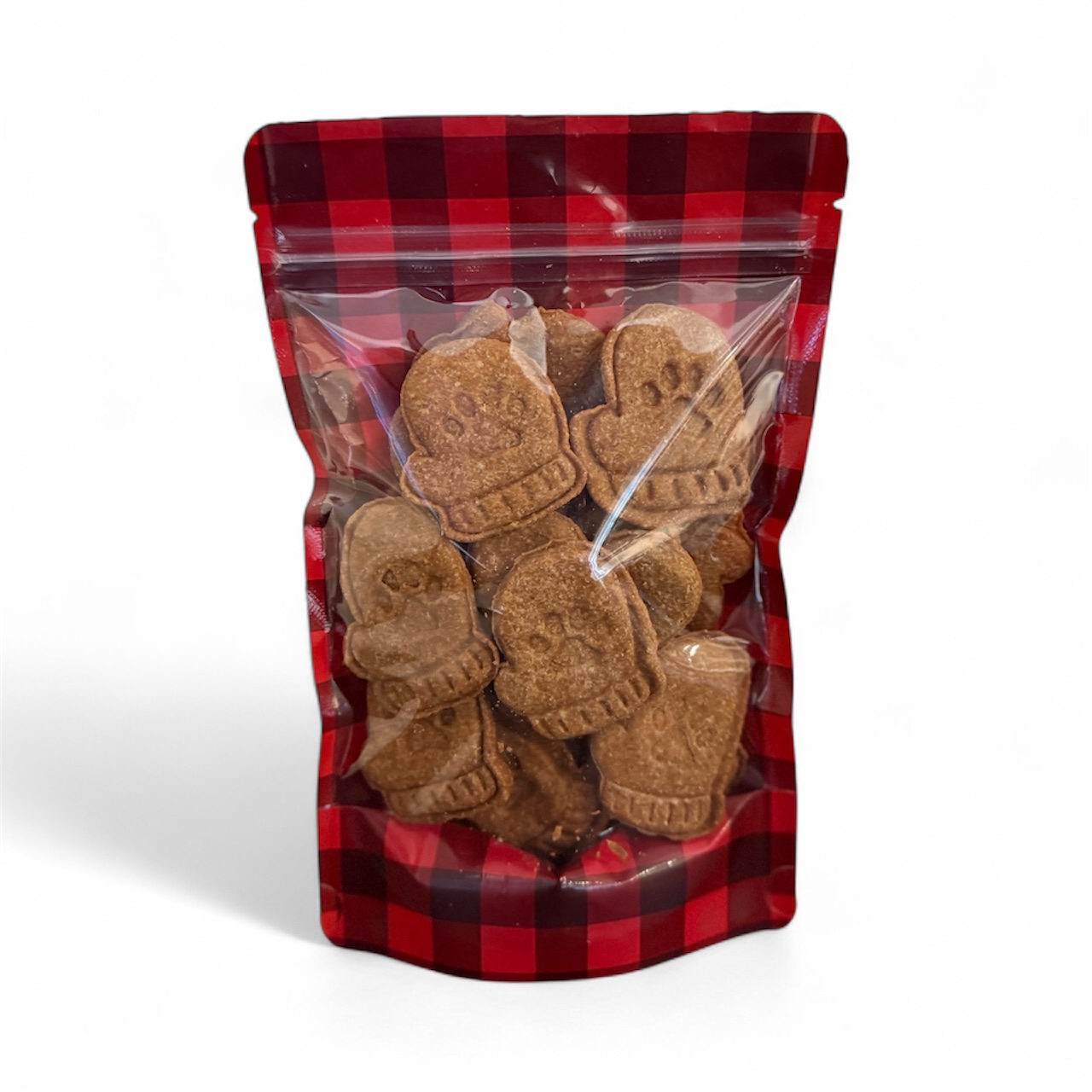 Available Now! - Our Happy Howlidays Peanut Butter dog treats are crafted with high-quality, human grade ingredients that are easy to recognize and pronounce. Each treat is made with whole wheat flour, peanut butter, eggs and honey. The red plaid package includes 20 pieces of assorted designs – snowmen, gingerbread, ornaments and trees. The pieces are approximately 1 - 2 inches wide, perfect for rewarding your dog with a tasty snack. To maintain freshness, store the package in a cool, dry place. Our commitment to quality is underscored by our licensure with the Tennessee Department of Agriculture. We list all the ingredients and the guaranteed analysis on each label. As each beloved dog is unique and may have specific dietary needs, please review the ingredient list carefully and consult with your veterinarian if you have concerns about any sensitivities. Each treat has 20 calories.