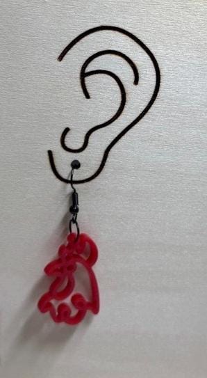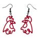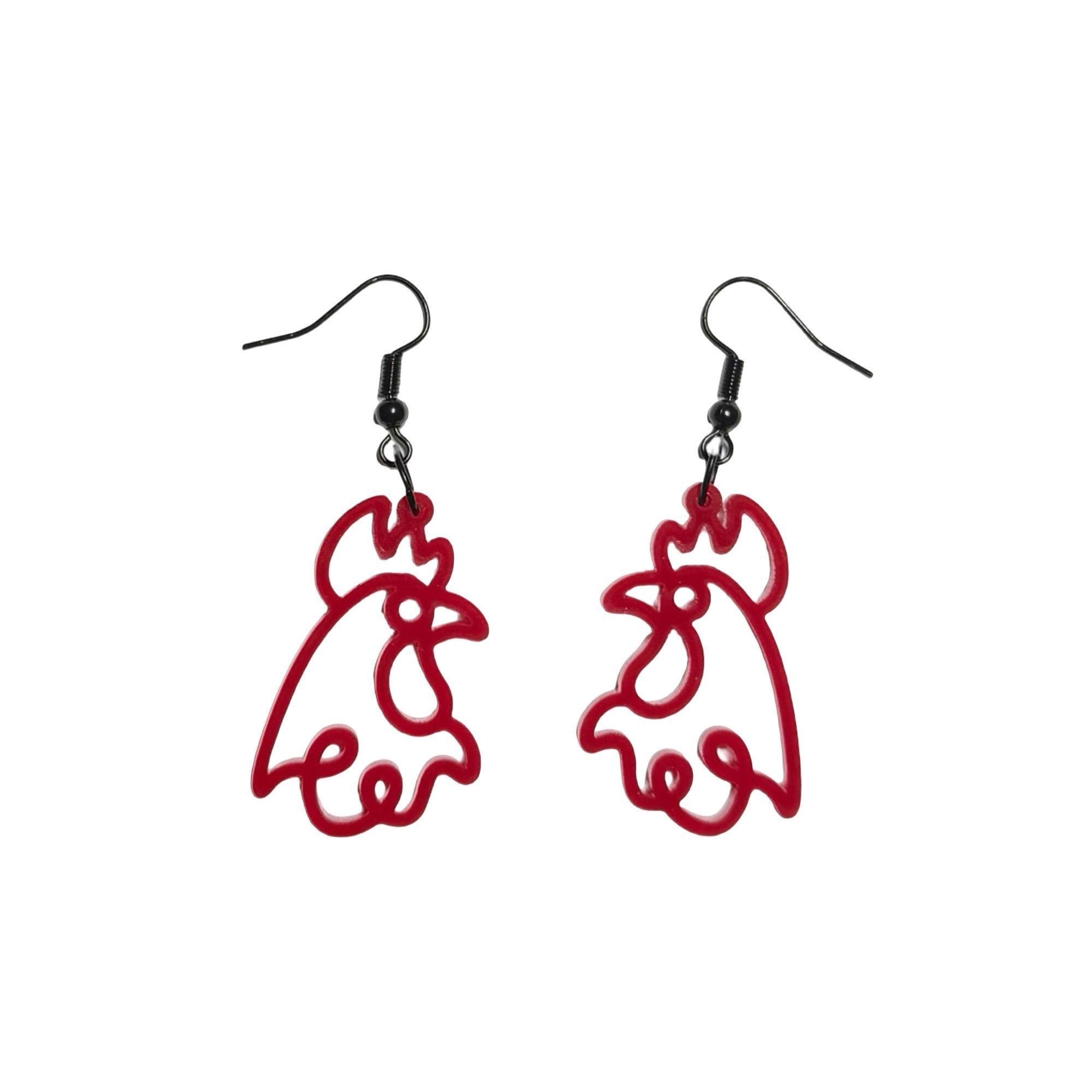 These are a pair of rooster laser cut lightweight acrylic earrings. They are made from 1/8 in thick medium red acrylic. They are on ear wires. All metal components are silver, gold, or brass plated, or black alloy, nickel & lead free, and hypoallergenic. They are approx. 1.25" long. Backs not included but available upon request.