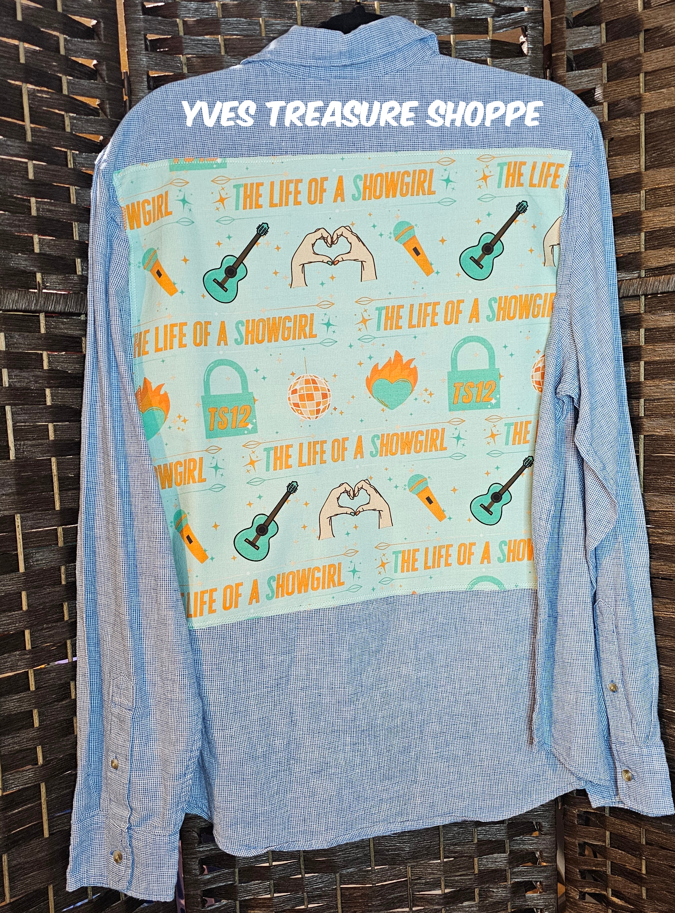 This is a new refashioned Old Navy Large Shirt. 25 inches across pit to pit. 30 inches long from top of shoulder to bottom of shirt. Embellished on back with a fabric Panel.