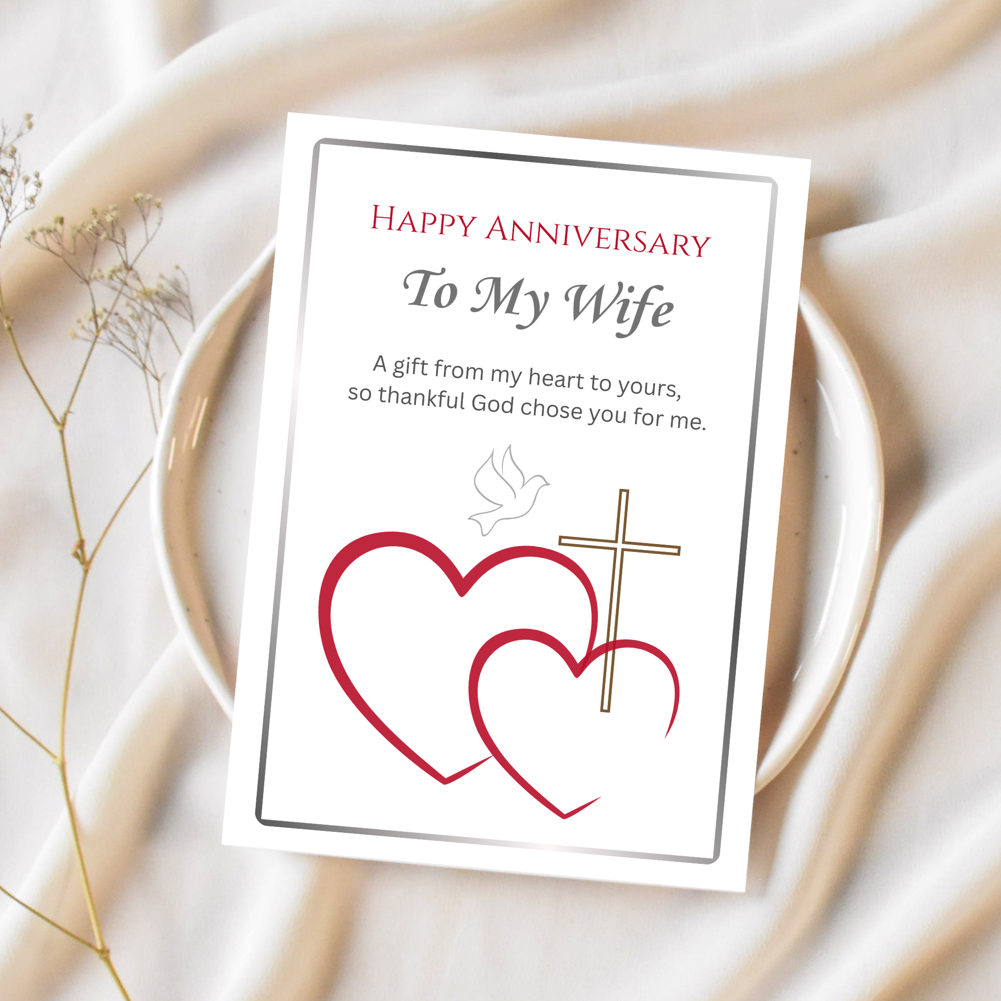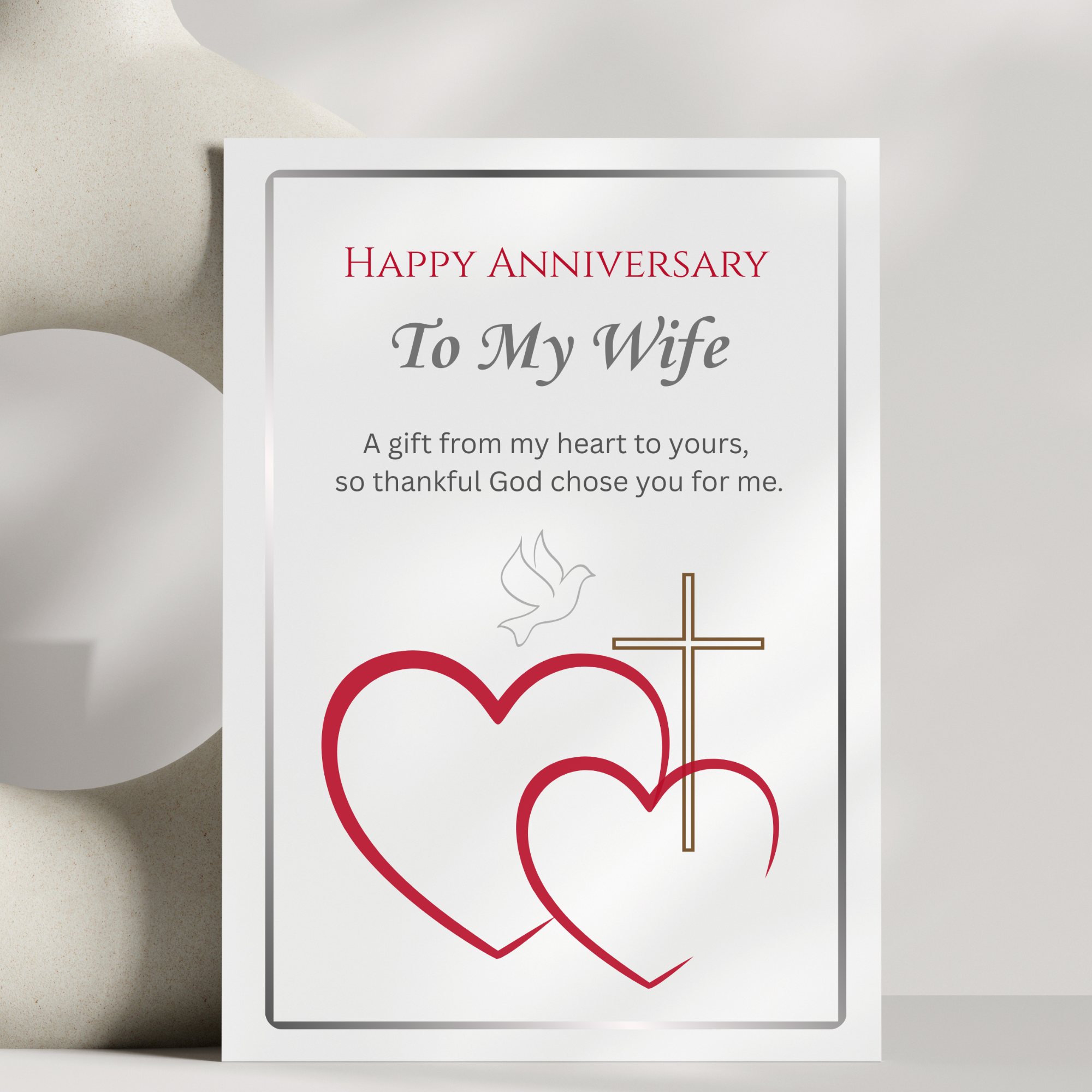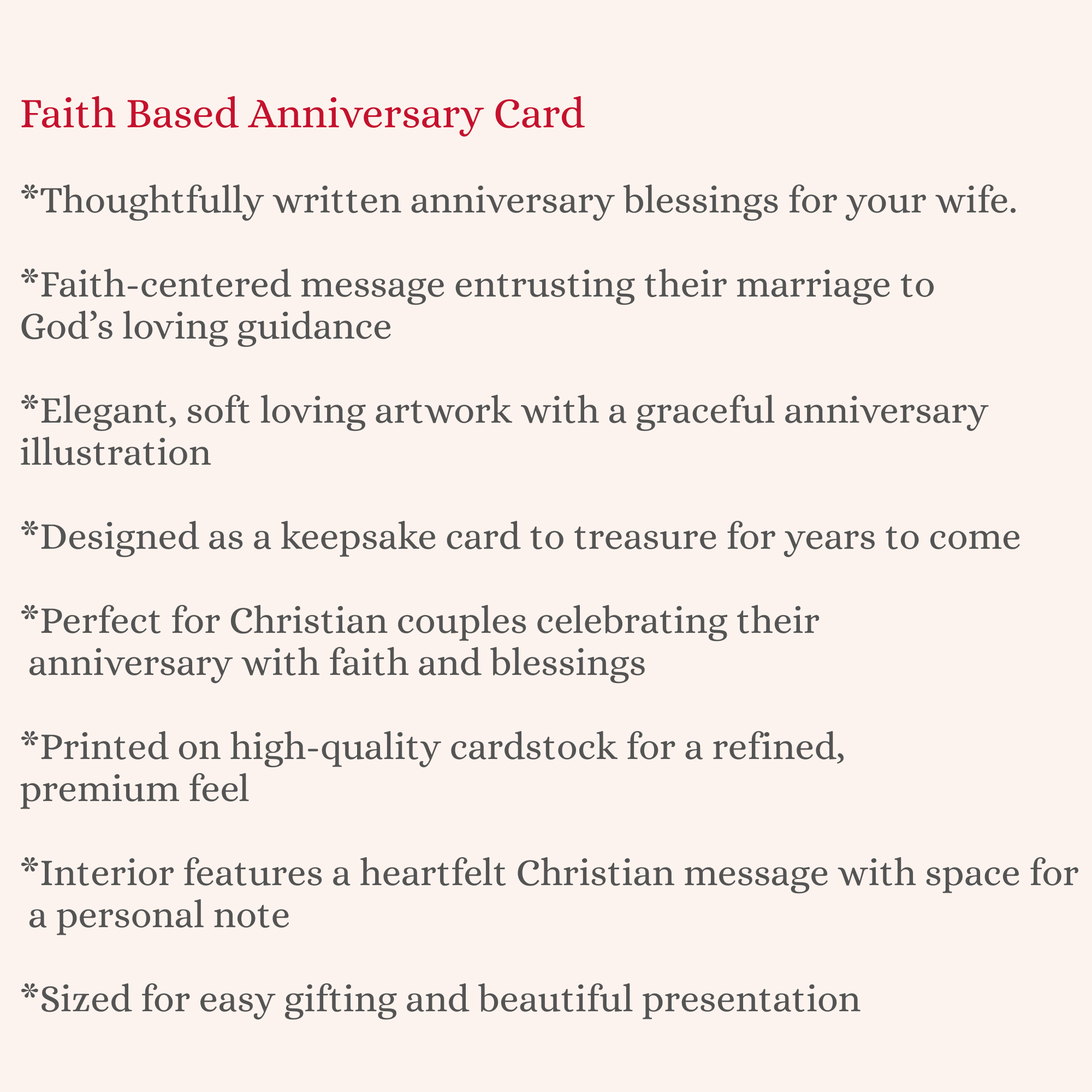 Celebrate the love you share and the faith that has guided your marriage with this Christian Anniversary Card for Wife. Thoughtfully designed with a timeless, reverent style, this card is a meaningful way to honor your wife and the life you continue to build together.