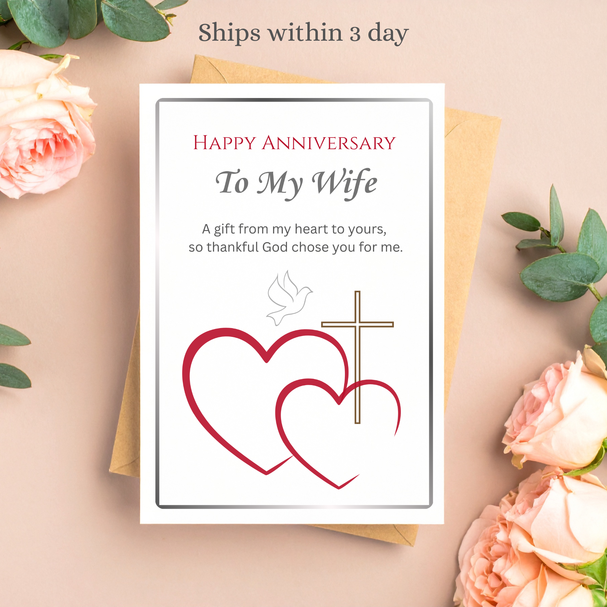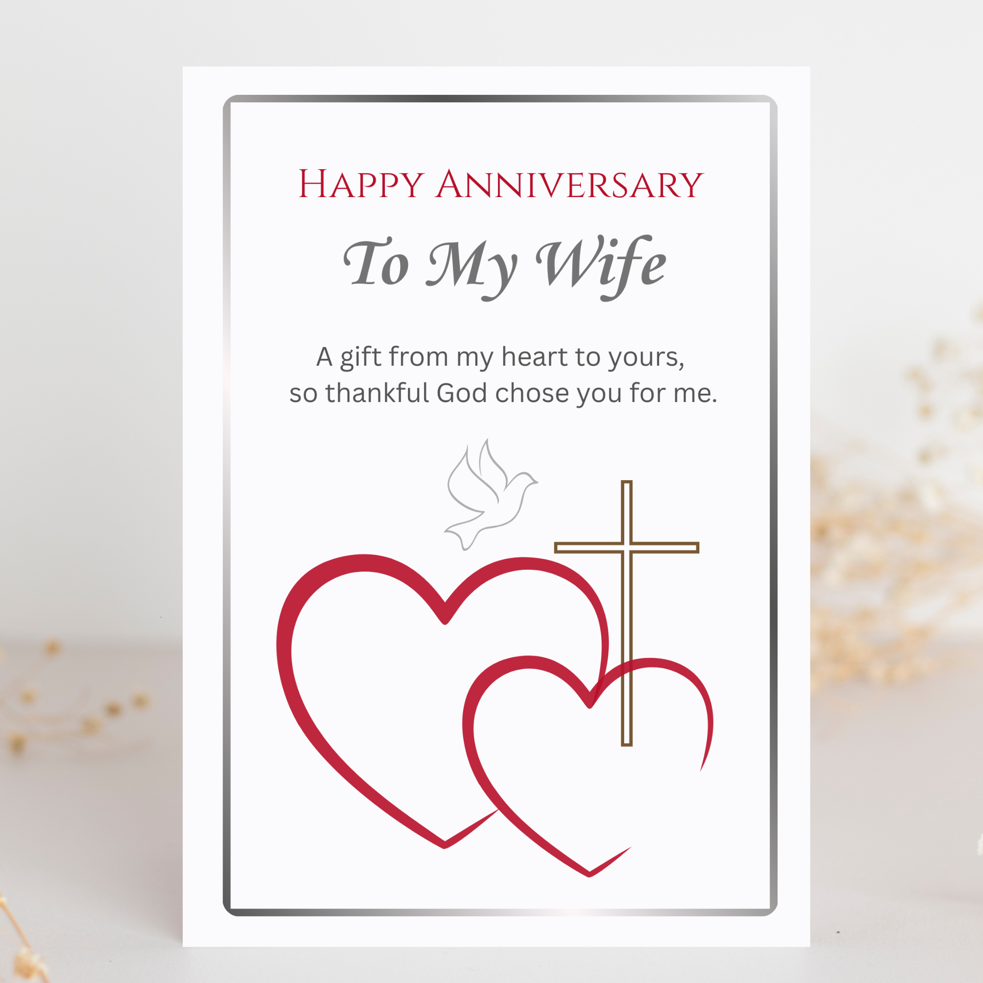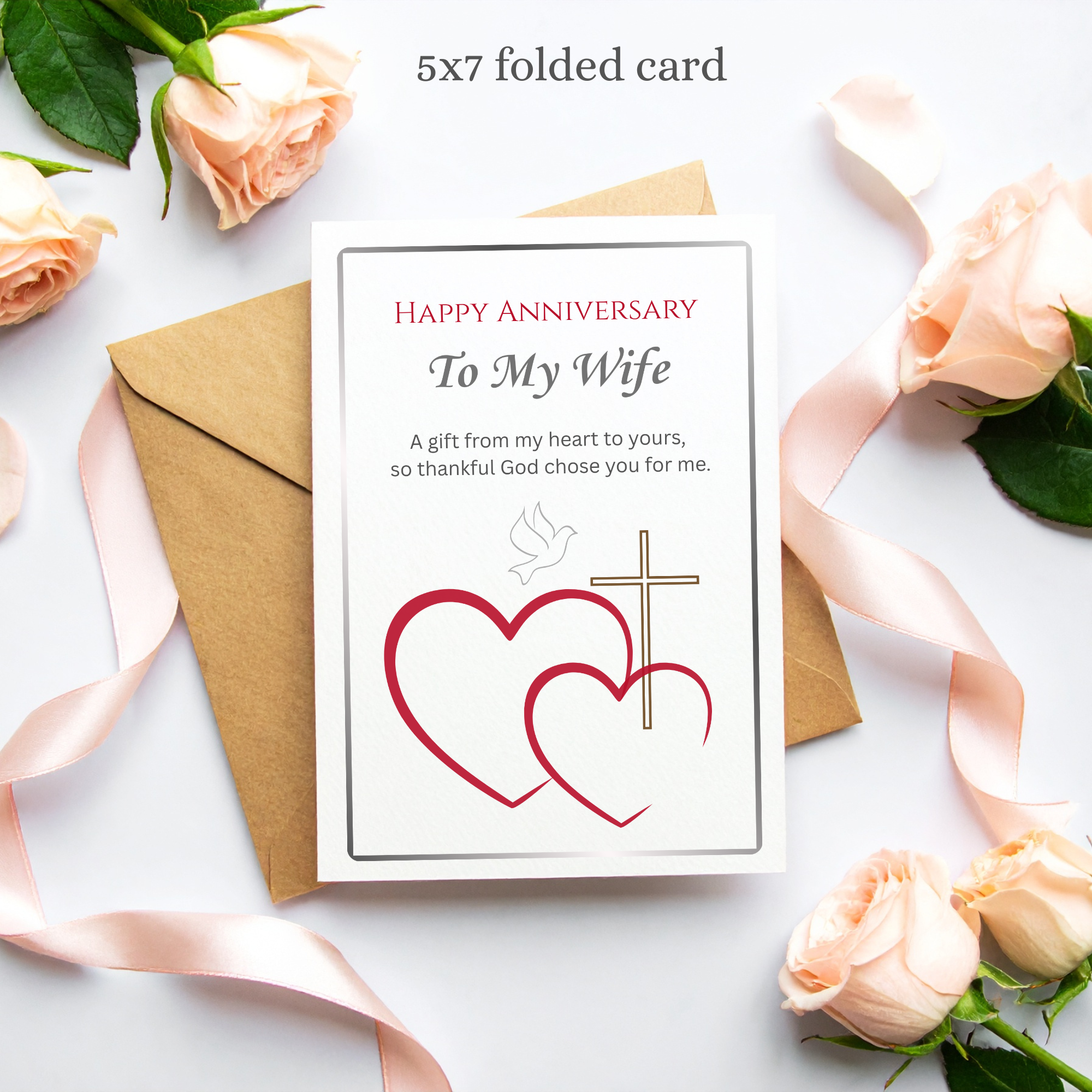 Celebrate the love you share and the faith that has guided your marriage with this Christian Anniversary Card for Wife. Thoughtfully designed with a timeless, reverent style, this card is a meaningful way to honor your wife and the life you continue to build together.