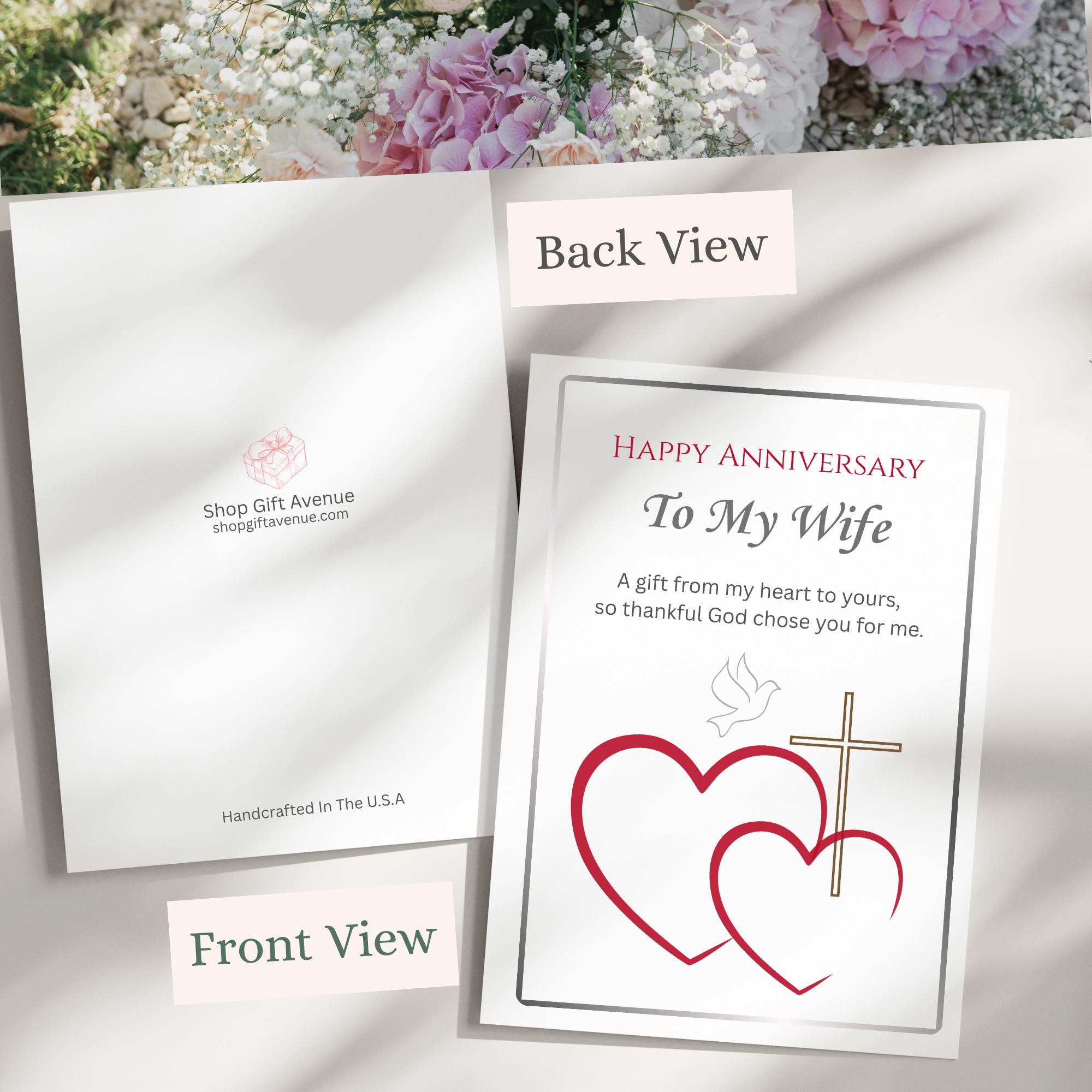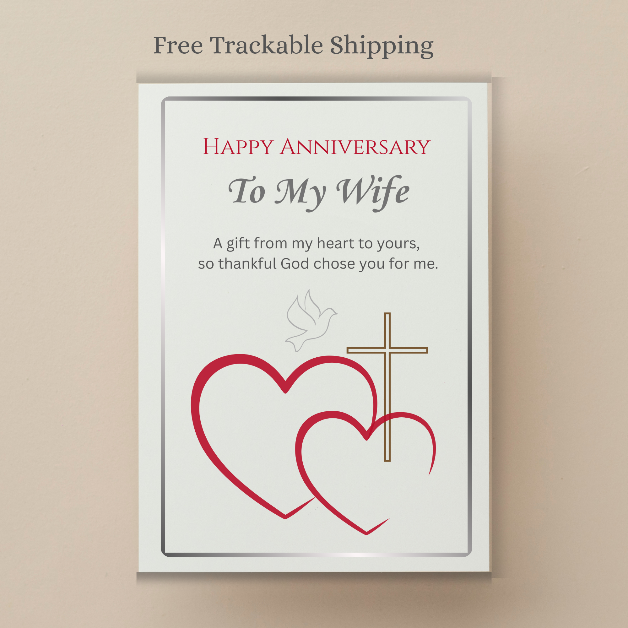 The front features elegant wording and classic religious symbolism, creating a keepsake she will treasure long after your anniversary day.