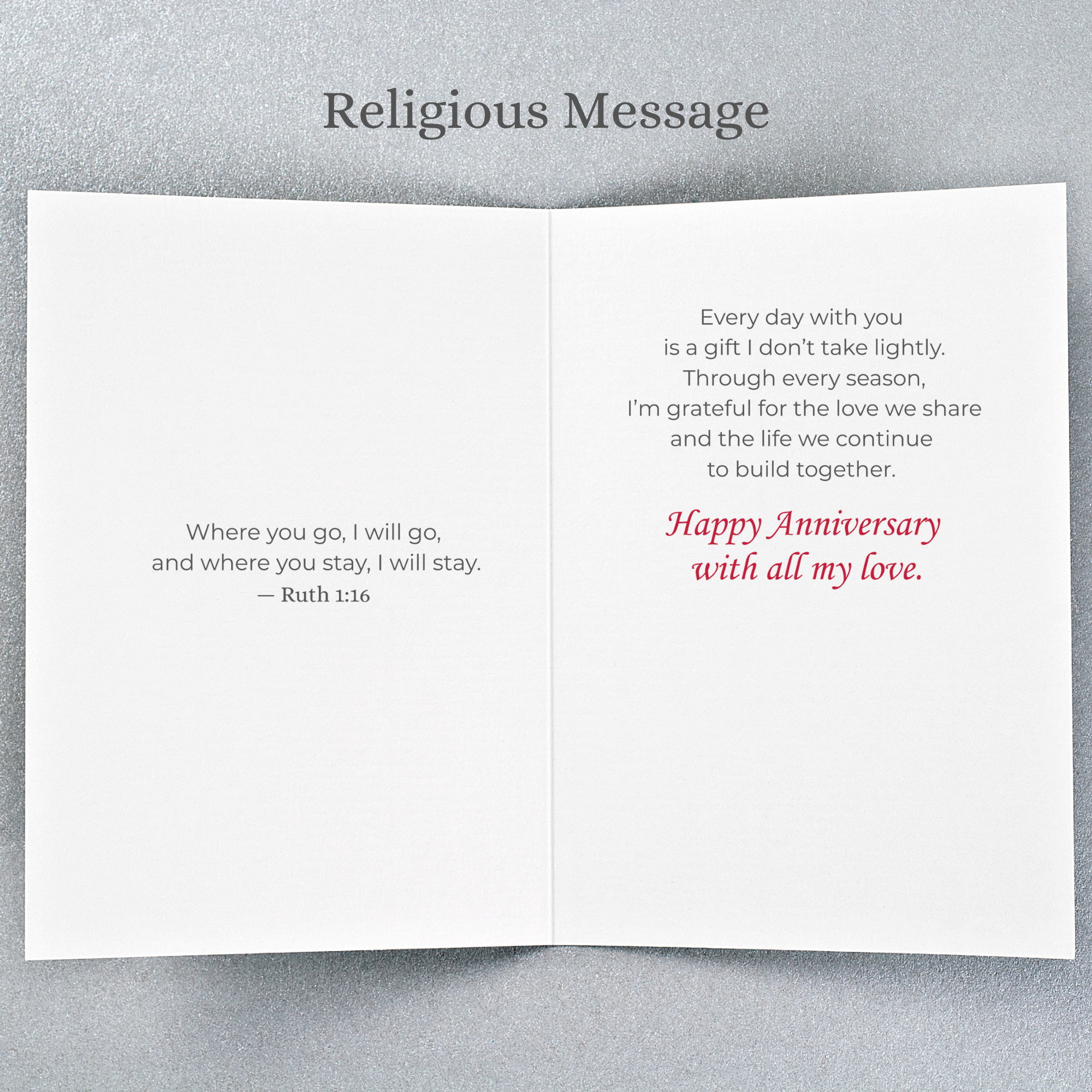 Inside the card, a heartfelt message is paired with a Bible verse that reflects devotion, commitment, and walking life’s journey side by side — a gentle reminder of love rooted in faith.