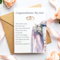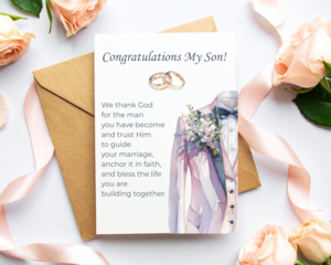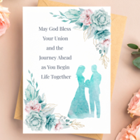 This Religious Wedding Card for Bride features delicate watercolor florals, soft greenery, and a graceful gold cross, creating a timeless design perfect for Christian weddings. Whether it’s given on the wedding morning, at a bridal shower, or tucked into a thoughtful gift, this Christian wedding card will be treasured for years to come.