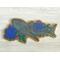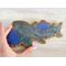 This resin wall hanging features a gray shark among purple flowers. The piece has a gold edge and is backed with blue glitter to give an extra shimmer. Each of these colors has some shimmer, and the flowers and leaves have a color shift. This piece measures 8 inches wide and 4 inches tall. It has a hook hidden in the back for hanging on a wall.