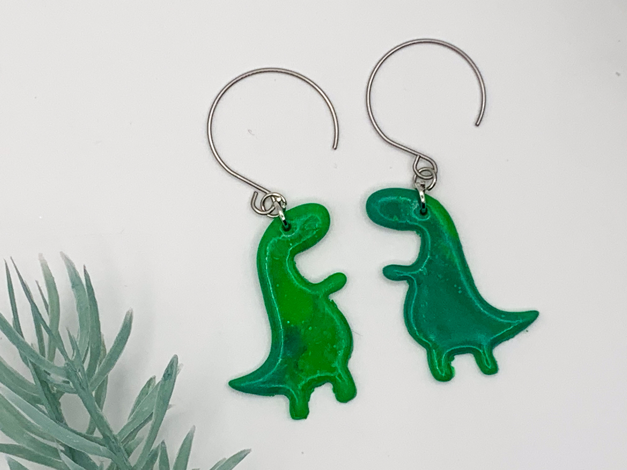 A fun twist on prehistoric chic! These green dinosaur earrings feature a marbled finish and sleek hoops for a trendy, playful vibe.