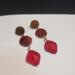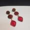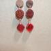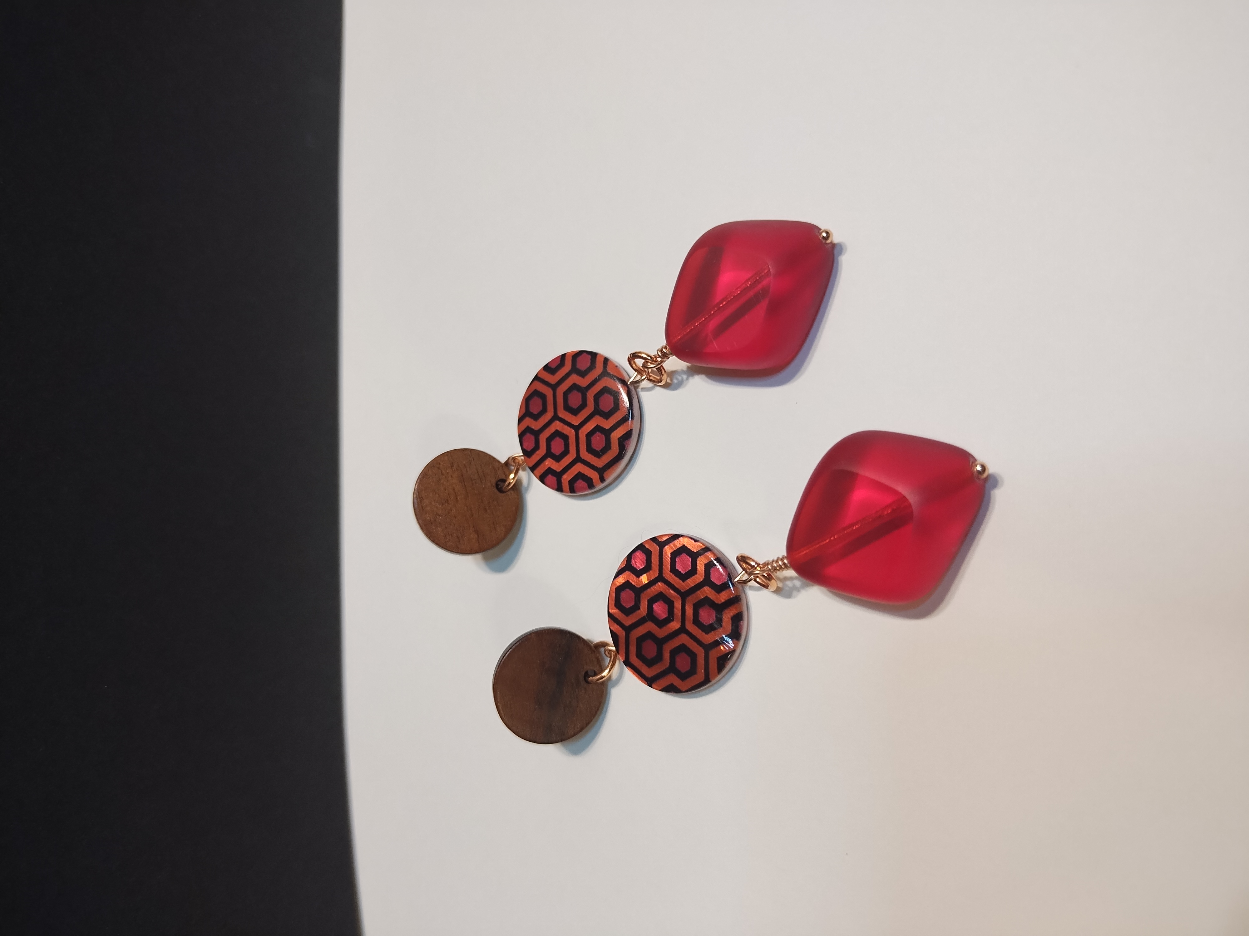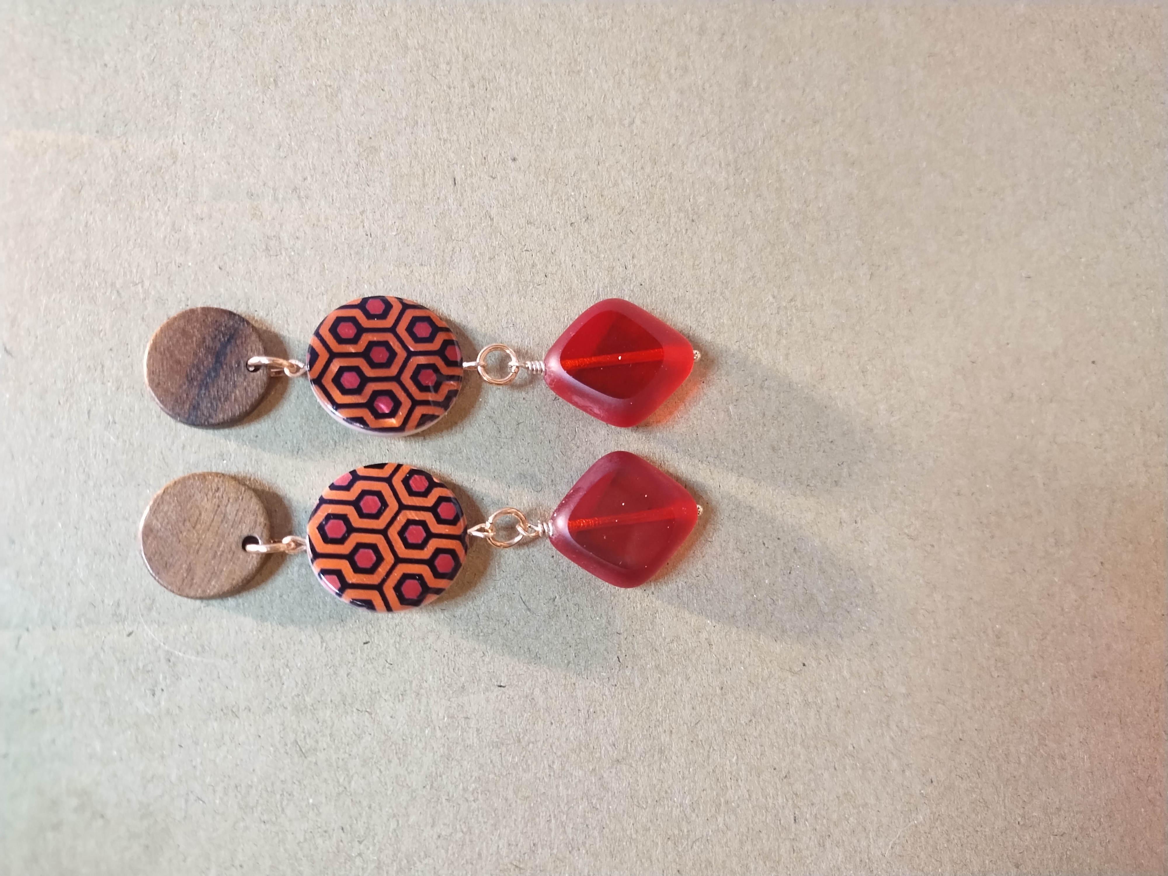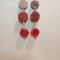 These striking, retro themed dangle earrings measure almost 3 inches long, feature red Czech glass retro diamond shaped drops, retro patterned discs, and a wooden disc with post ear hardware.