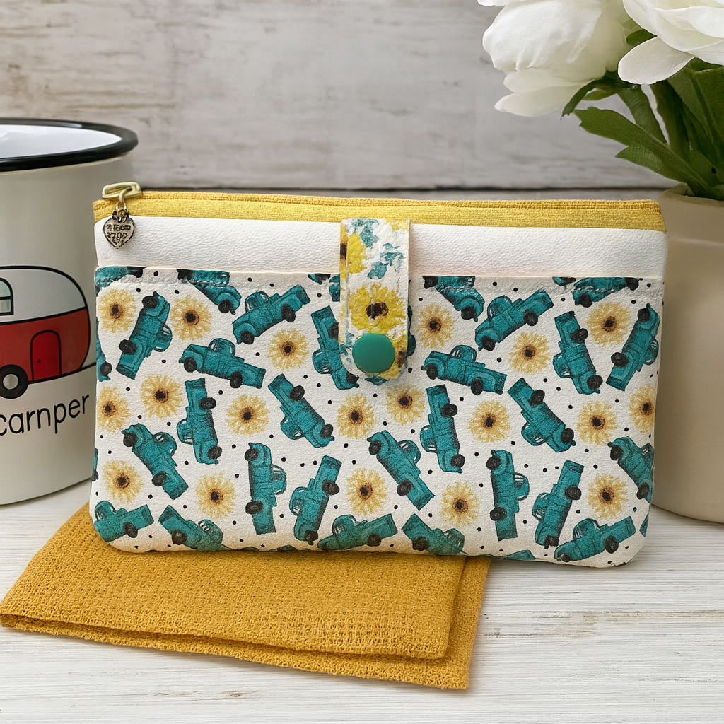 This adorable zippered bag featuring a charming retro truck design makes a great gift—or a fun treat for yourself! It features a cheerful yellow zipper on top for a playful splash of color.