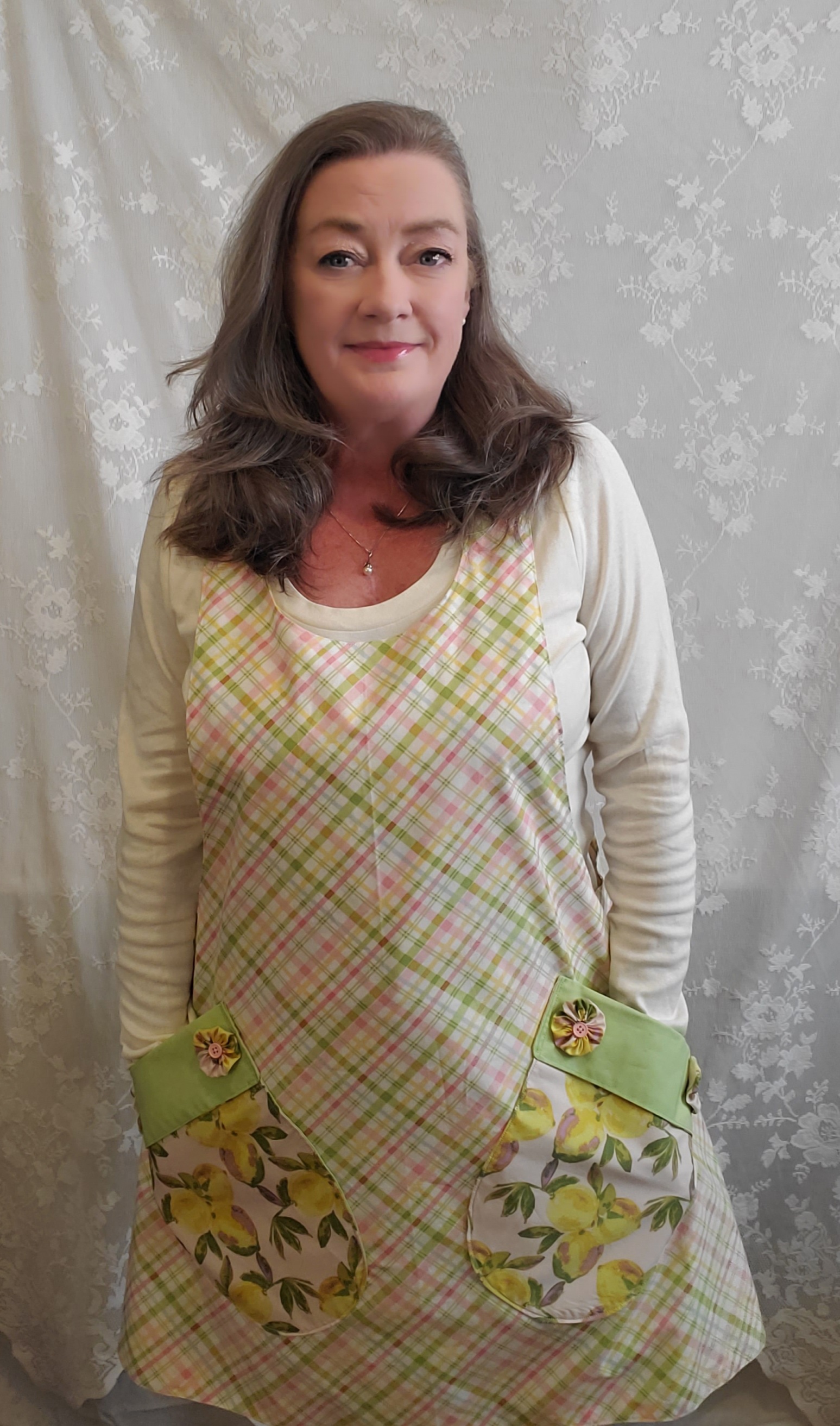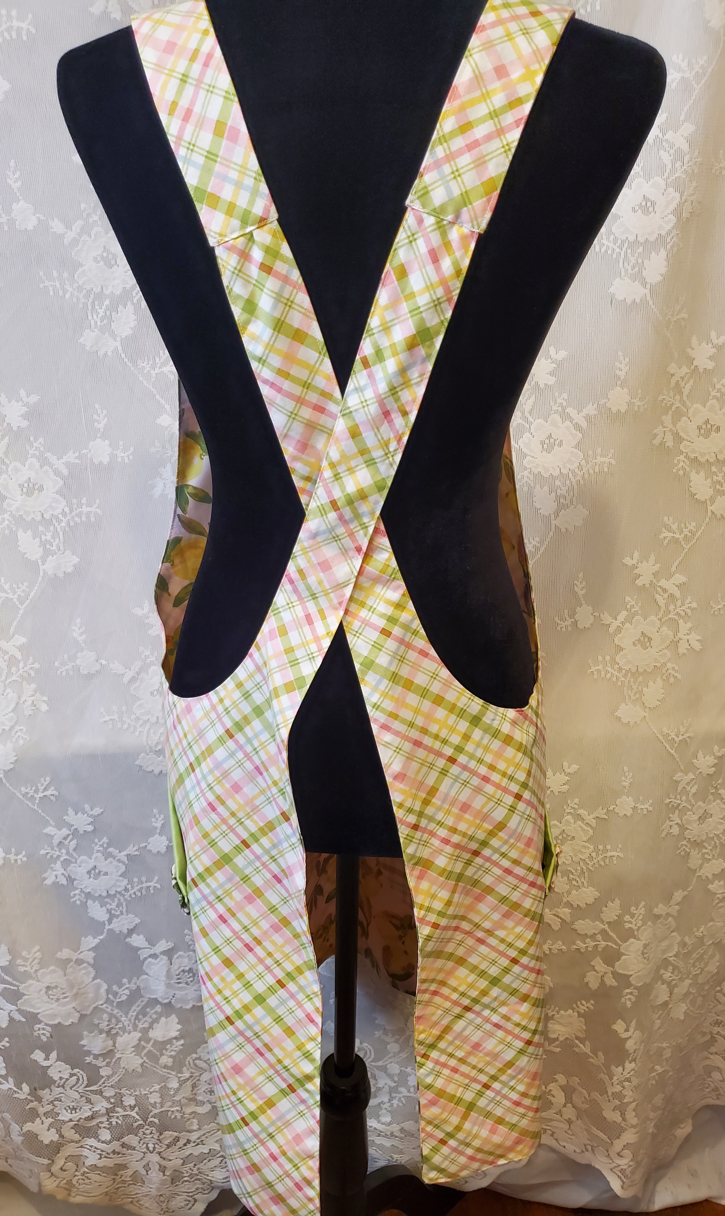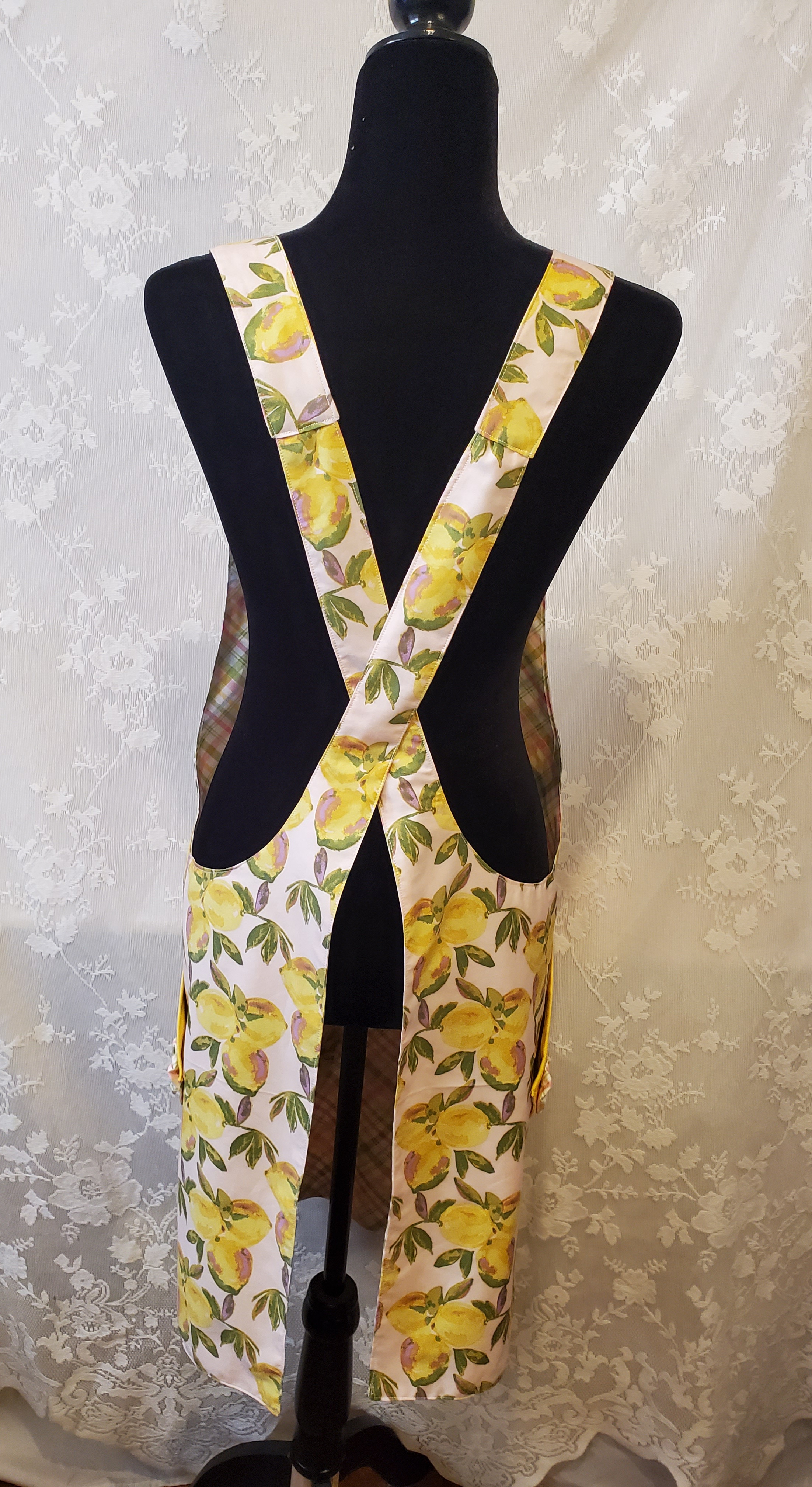This lemon motif apron is reversible, giving you 2 aprons for the price of one. Side one is a light pink background with yellow lemons and green leaves.. Side two is a beautiful plaid of pink, green, yellow, light blue, and white. Both sides feature coordinating pockets with handmade yo-yo flowers.