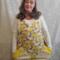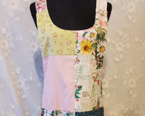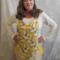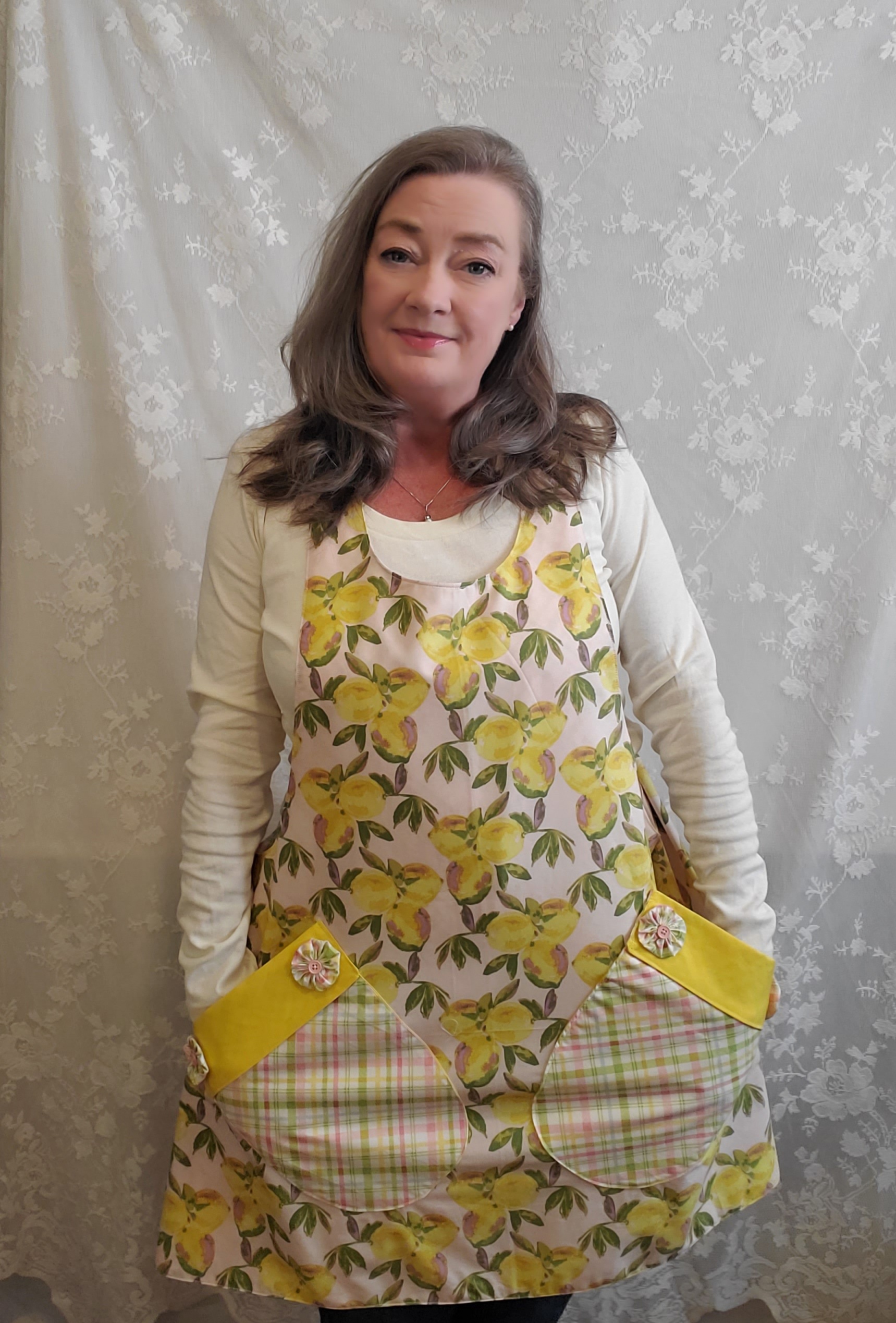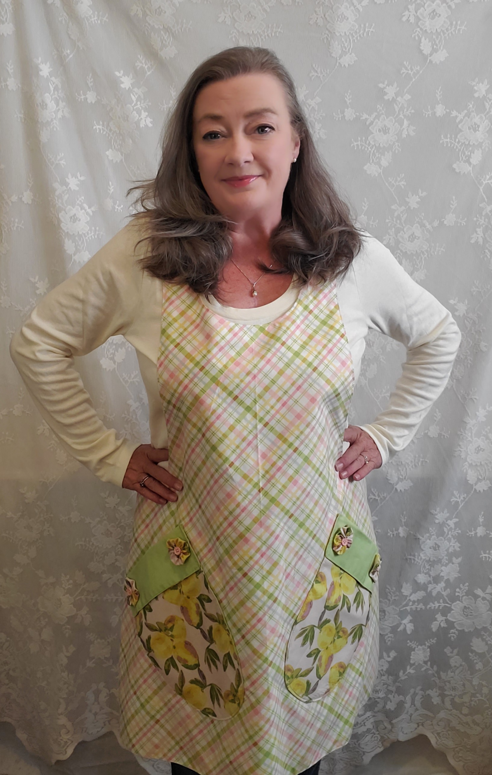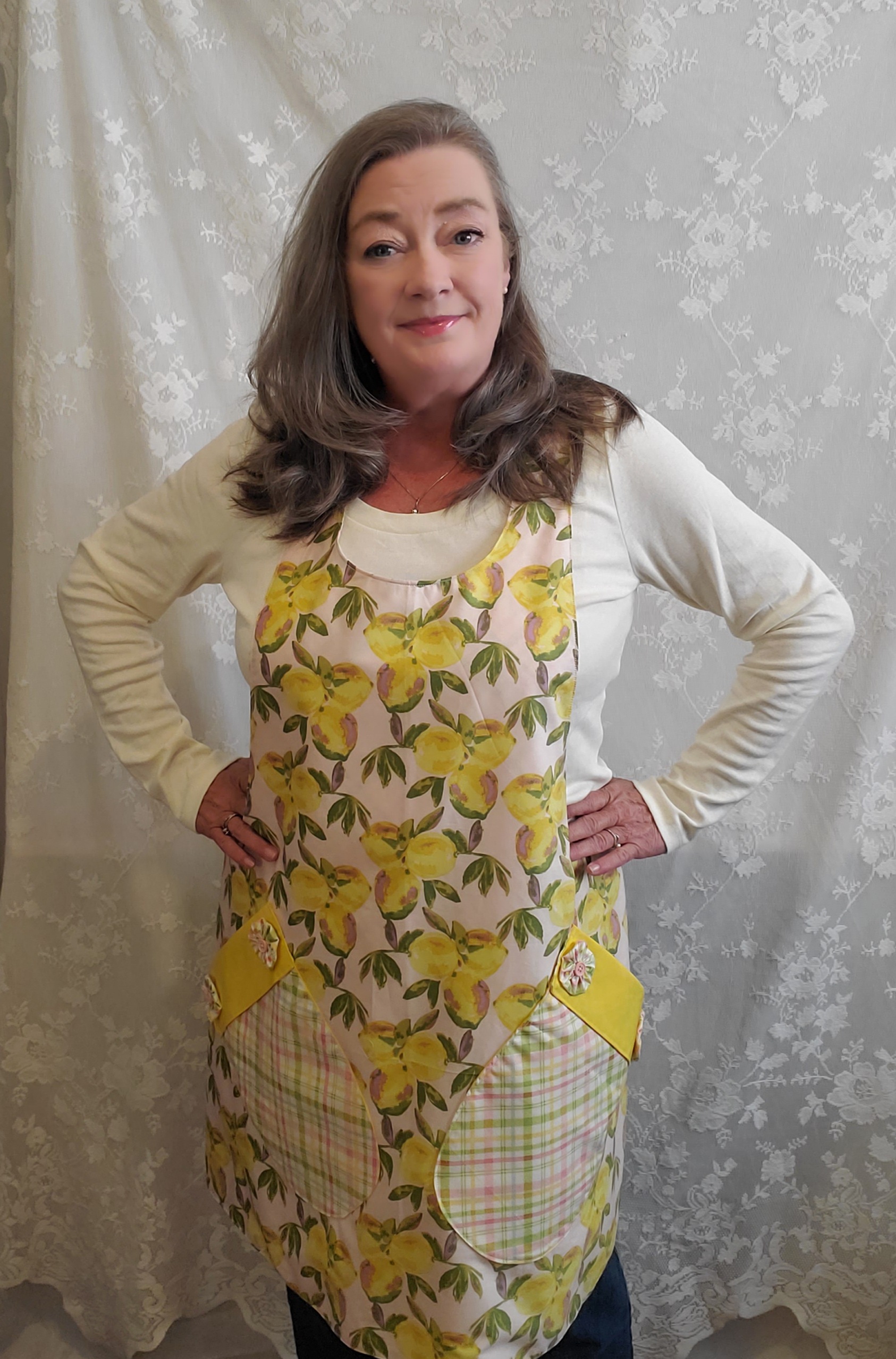 This lemon motif apron is reversible, giving you 2 aprons for the price of one. Side one is a light pink background with yellow lemons and green leaves.. Side two is a beautiful plaid of pink, green, yellow, light blue, and white. Both sides feature coordinating pockets with handmade yo-yo flowers.