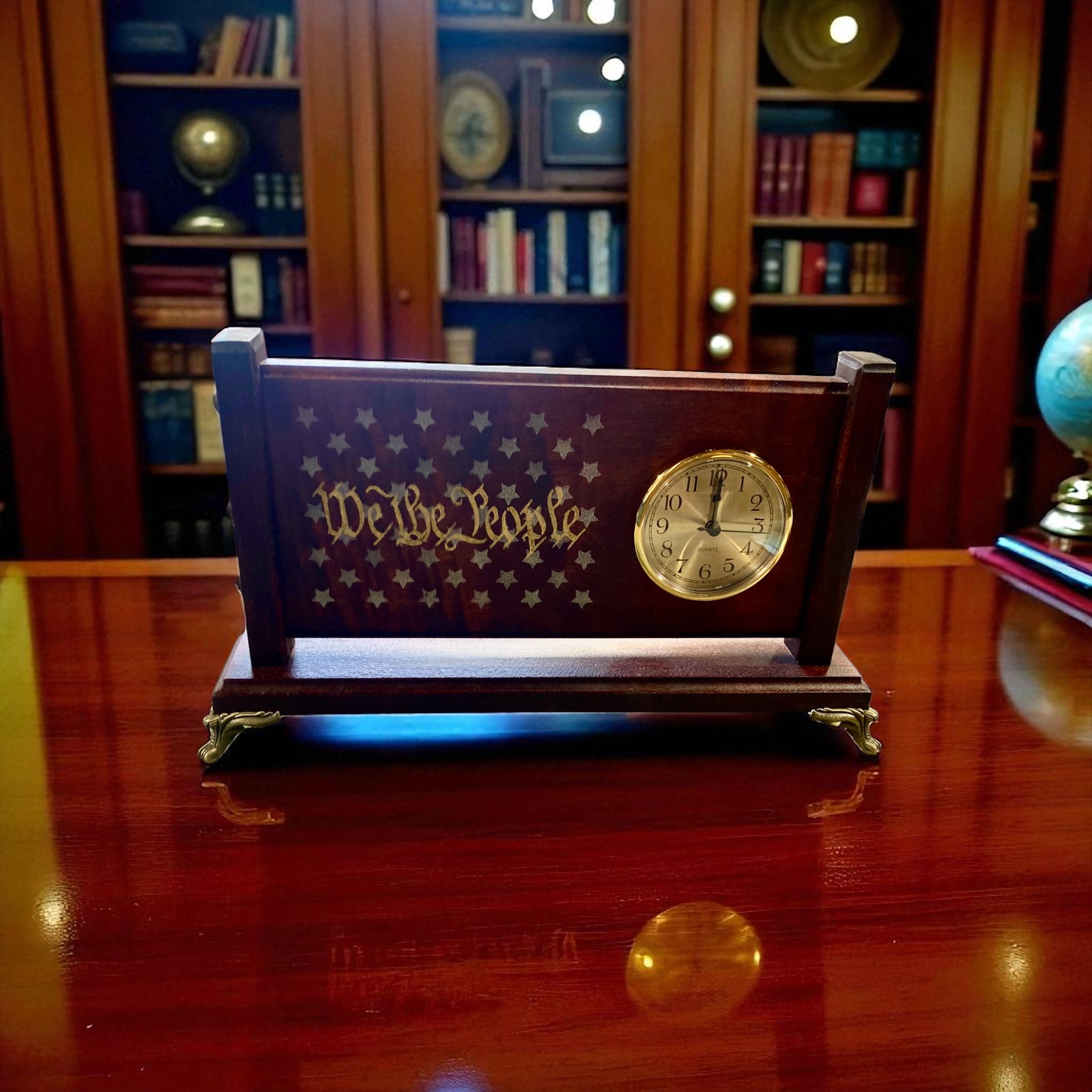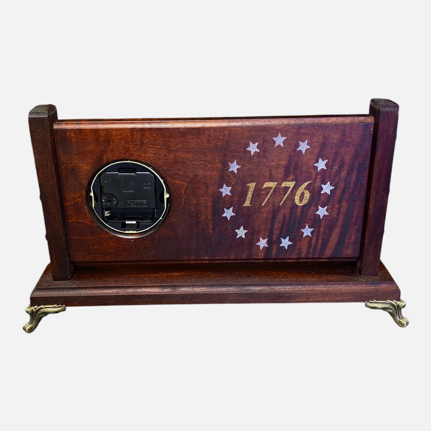 This Patriotic Clock is reversible with designs on both sides. The finish is a deep dark brown dyed on Curly Maple Hardwood and s danish oil is applied, There has been 4 clear coats applied and sanded to a very fine smooth finish.