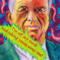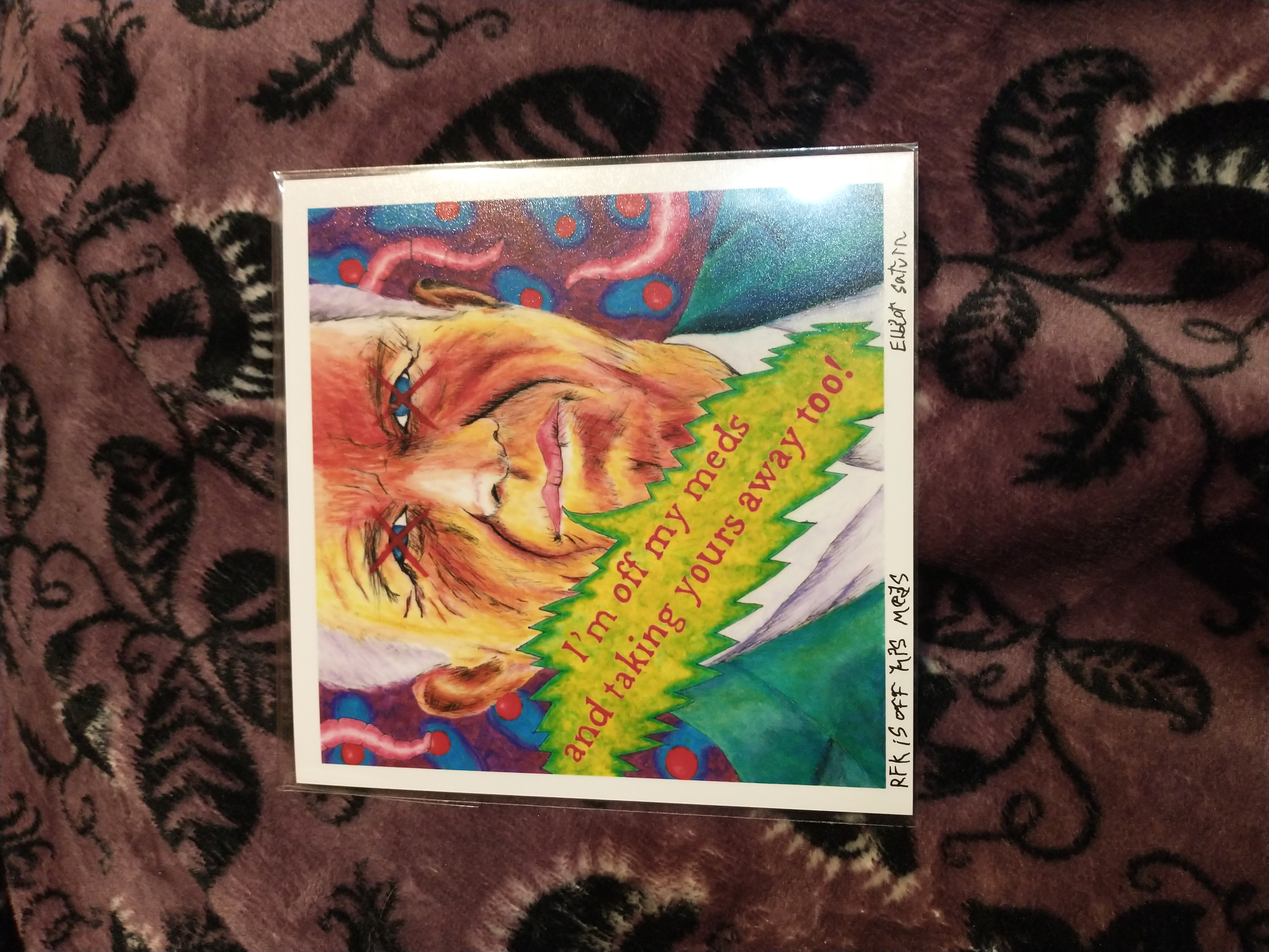 a 5 inch by 5 inch photo paper print of a watercolor painting of RFK jr with his eyes crossed out saying "i'm off my meds and taking yours away too" while worms and amoebas dance in the background.