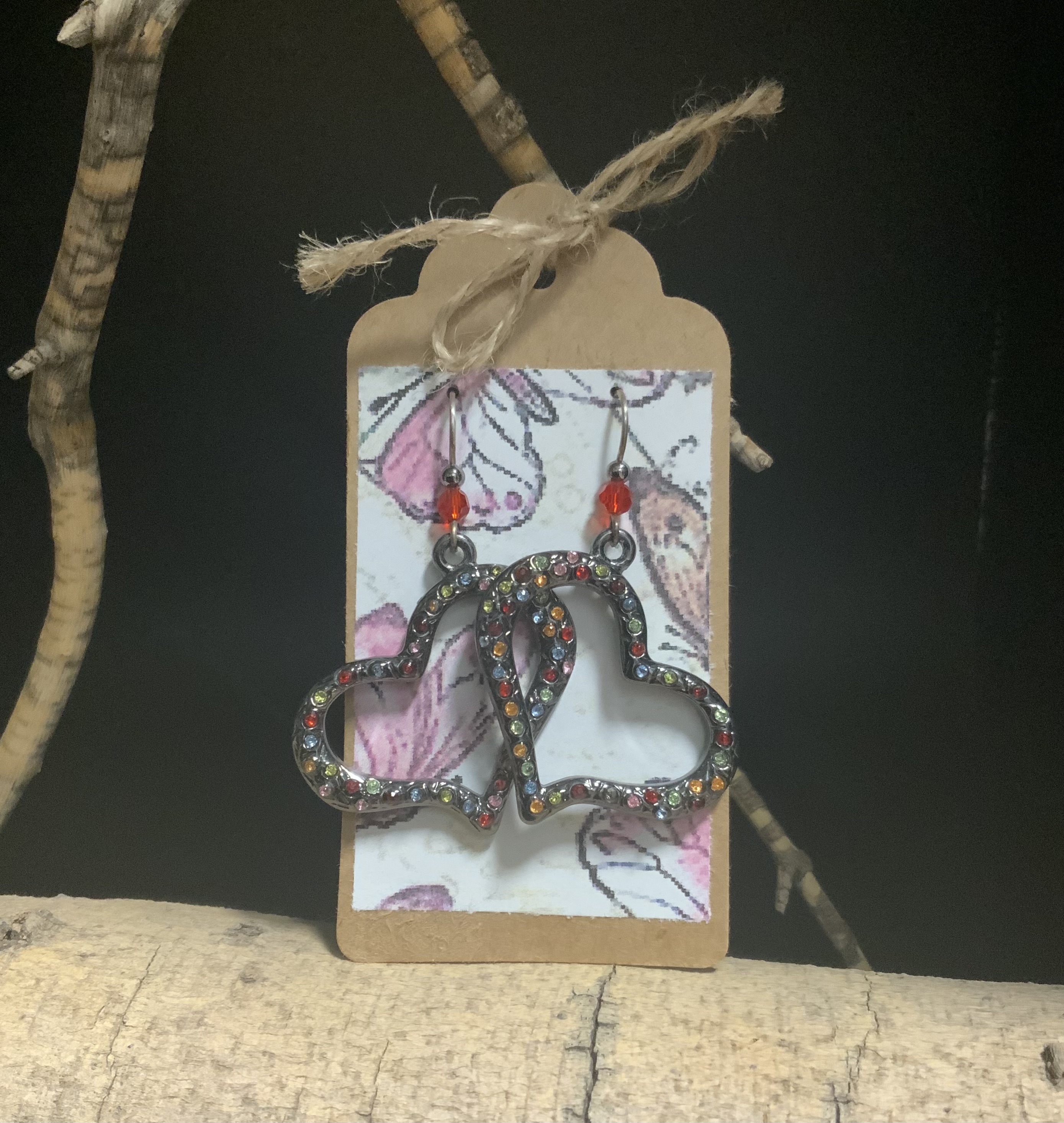 These heart shaped earrings have handmade silver fill ear wires with 4mm red crystle beads. The heart shaped dangle is a plated gunmetal color with multi color rhinestones placed all around. These earrings would be great for Valentines, Spring and beyond. Each pair of earrings comes displayed on a handmade card.
