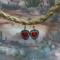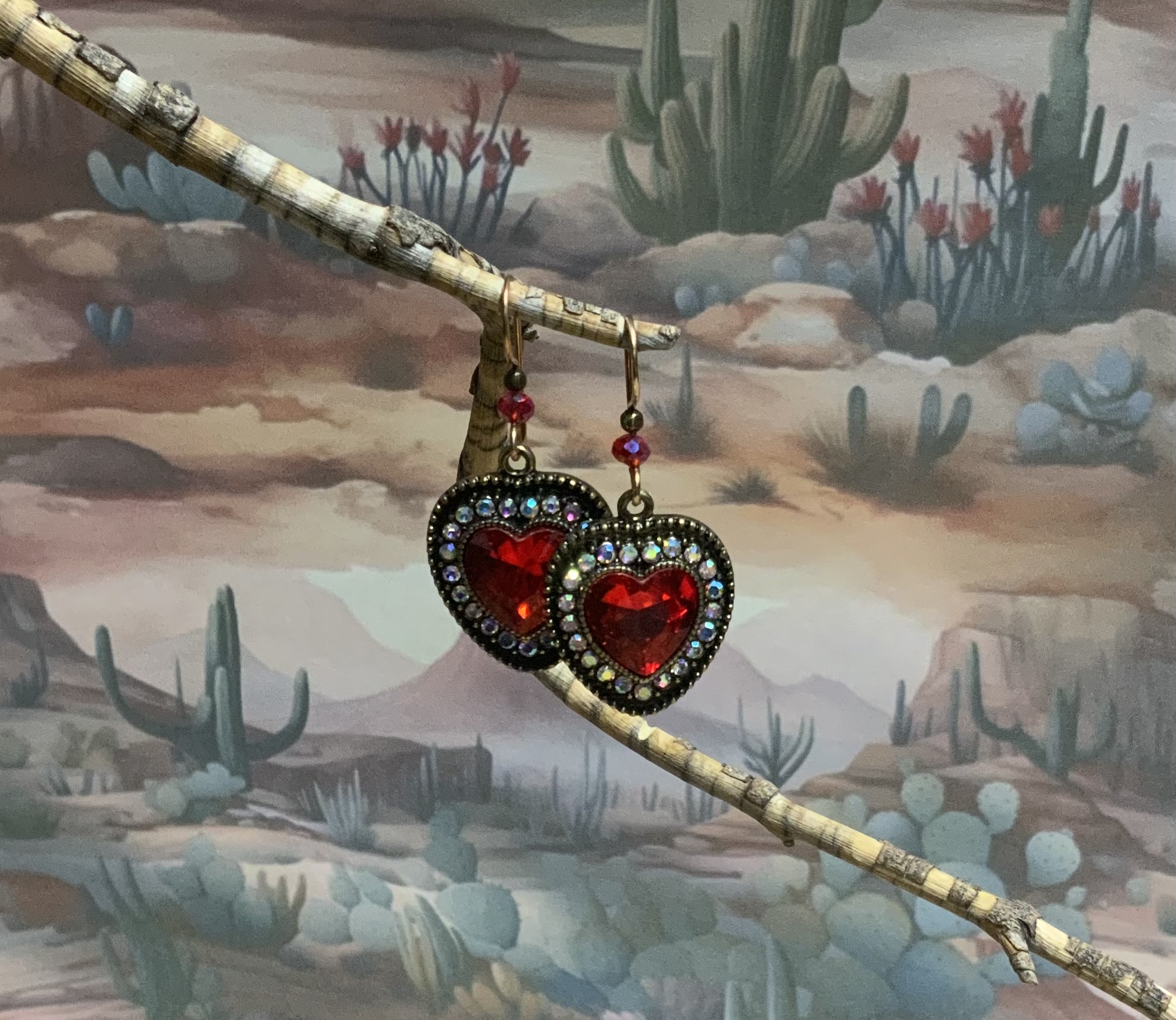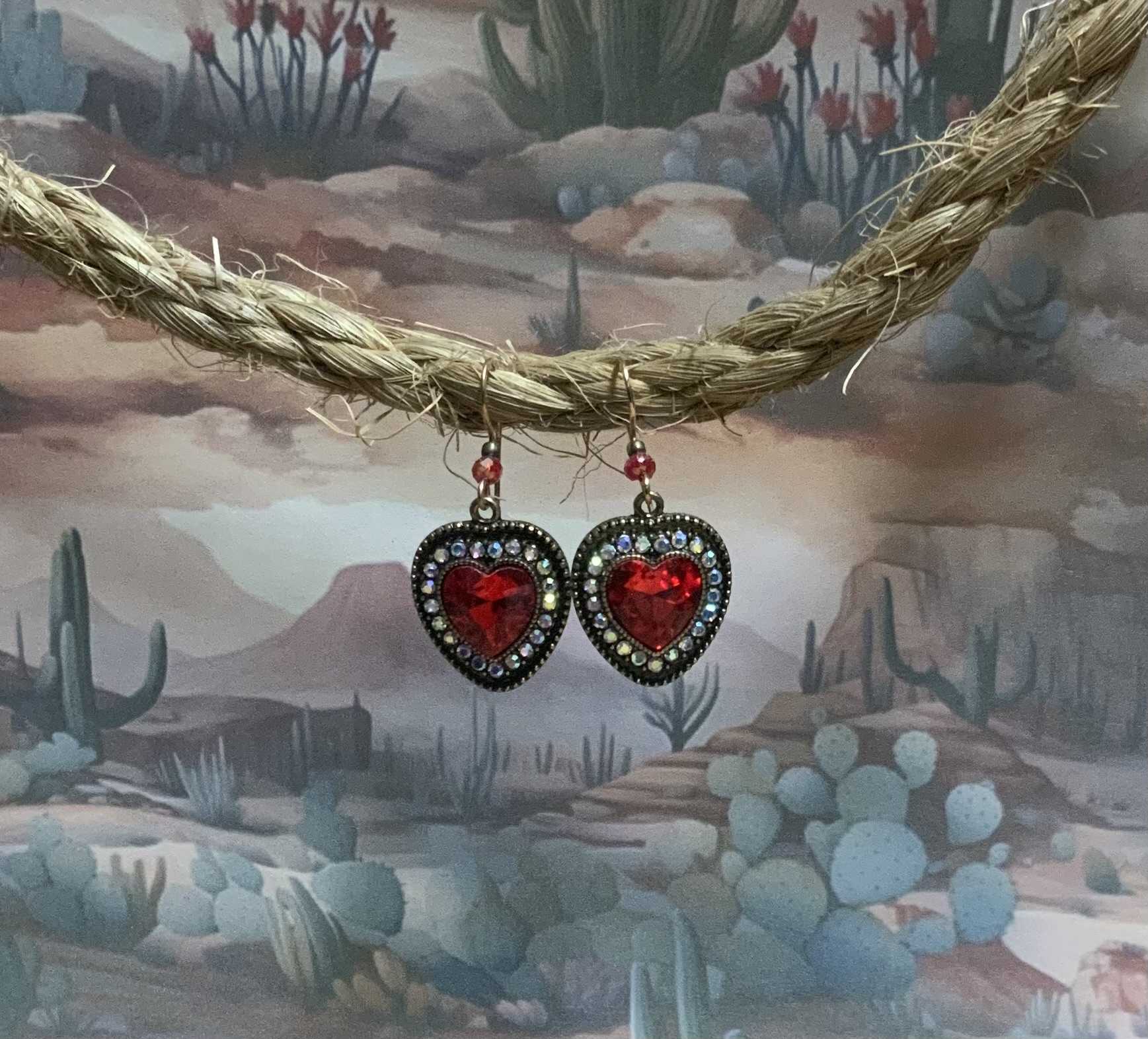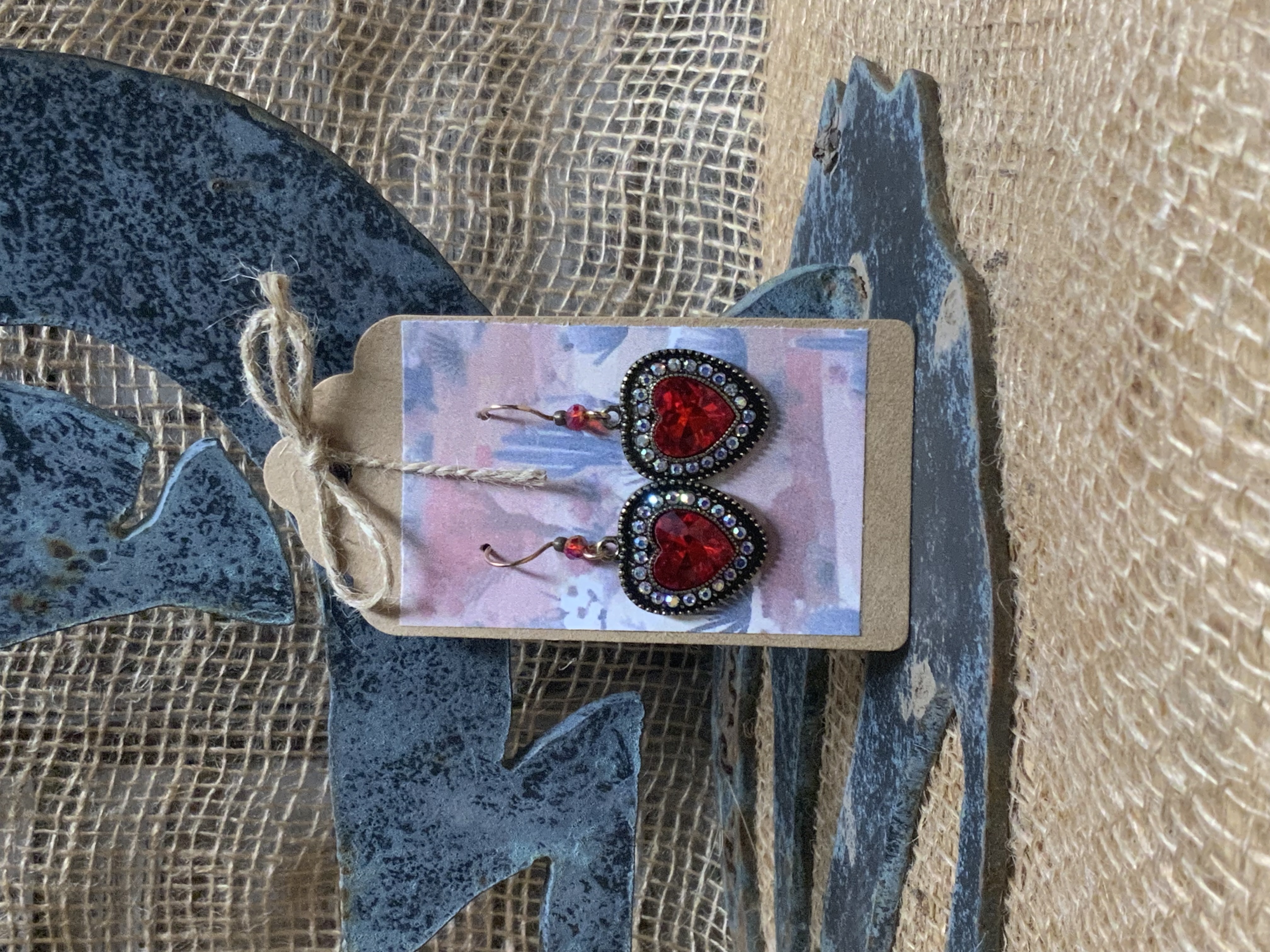 These heart earrings have handmade bronze ear wires with 4mm red crystal beads. The large red heart dangle is surrounded by smaller multi color rhinestones with an antique gold border. These are great pair of earrings for February and beyond. Each pair of earrings comes displayed on a handmade card.