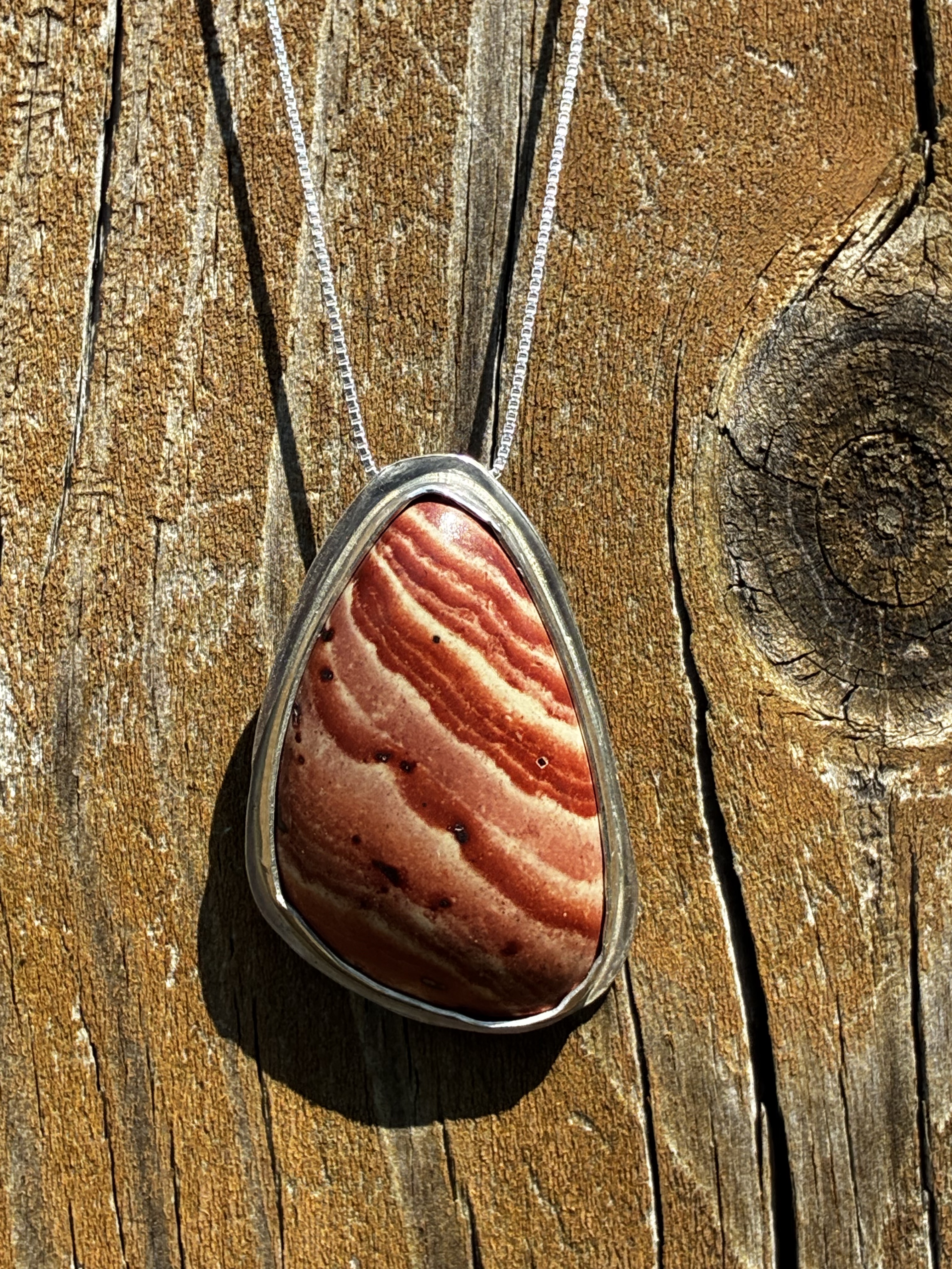 The Rhodochrosite in this pendant was hand-cut and polished by me. It was then set in sterling silver and hangs from a sterling silver chain.