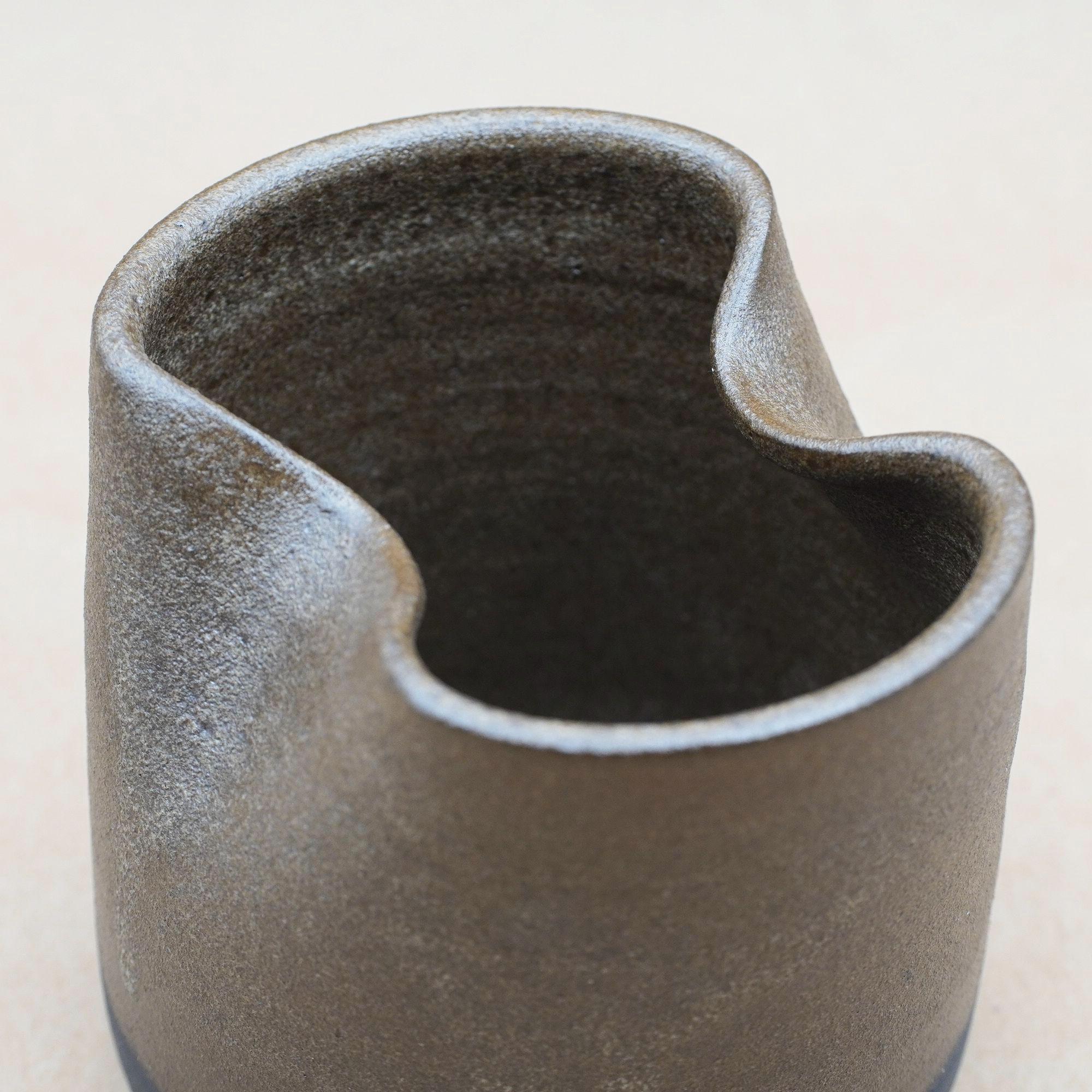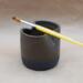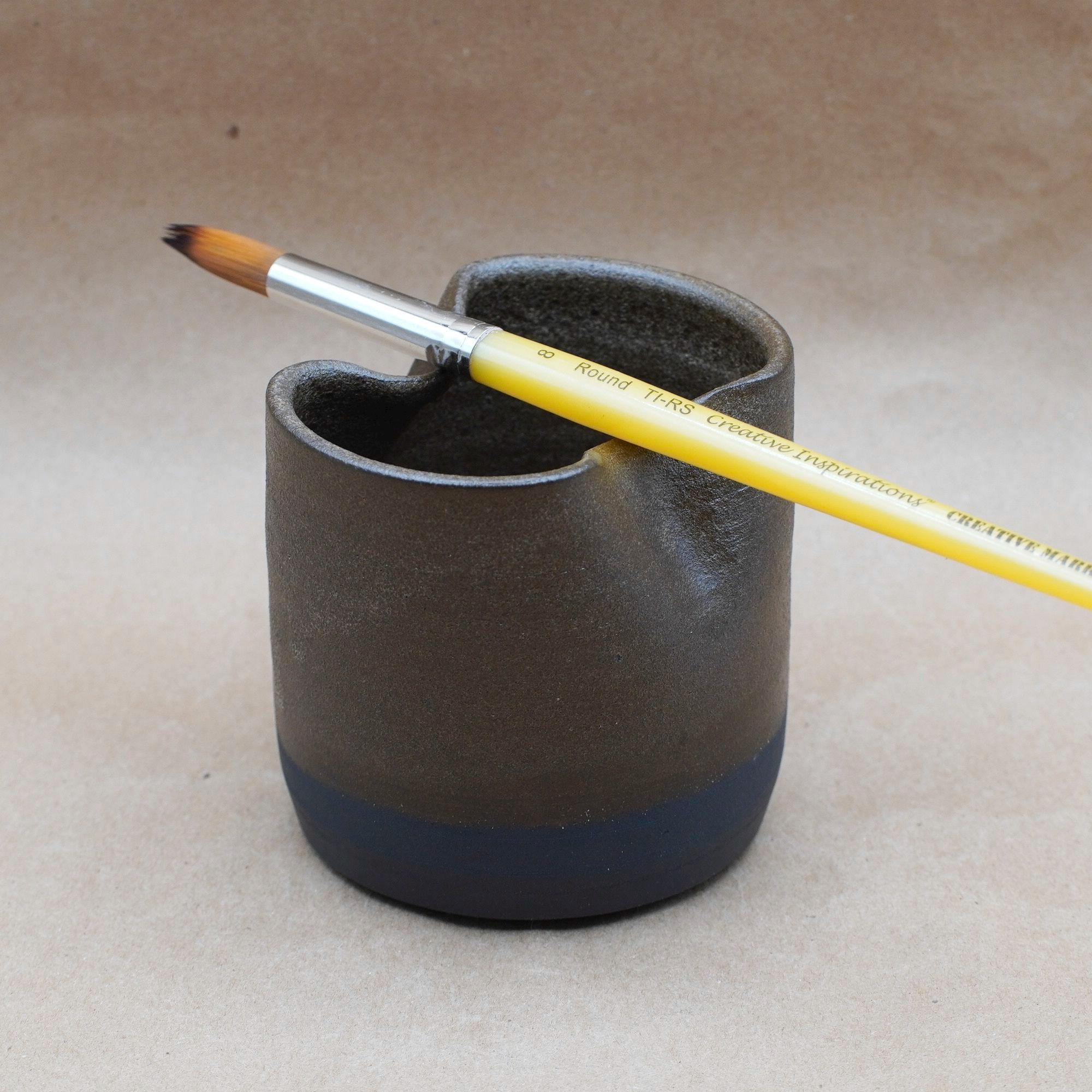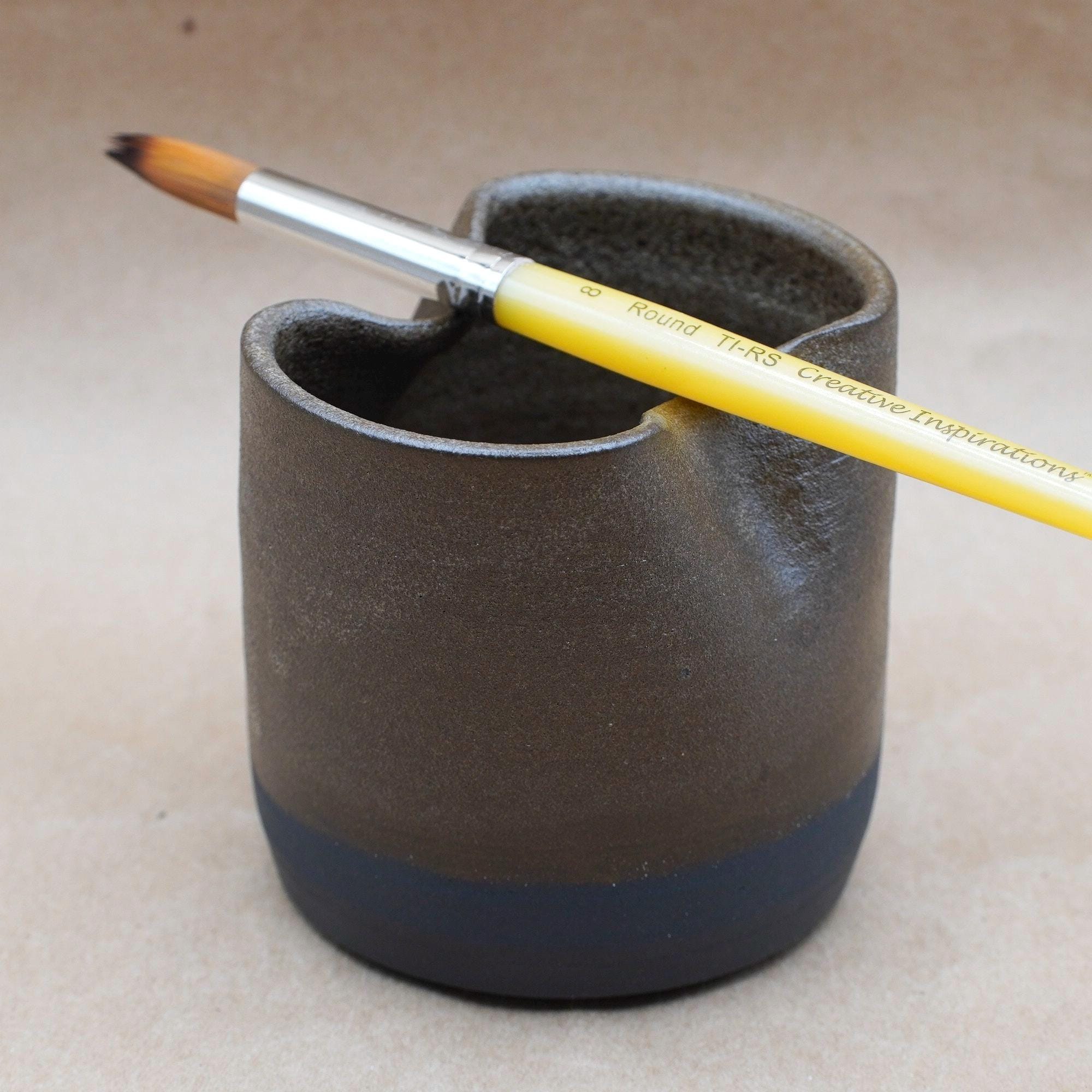 Bring beauty and functionality to your creative space with this handmade ceramic rinse cup. Designed with artists in mind, it features a folded rim that doubles as a paintbrush rest and ridges at the base to help clean paint from your brushes. Crafted from black stoneware clay and finished with a dark brown glaze. This piece is both practical and inspiring—perfect for painters, watercolorists, and even makeup brush cleaning.