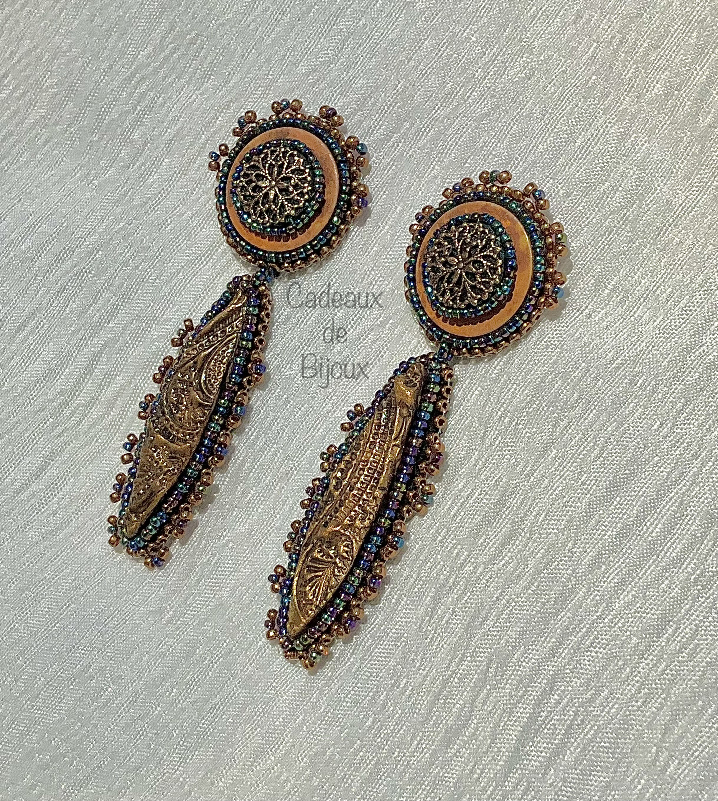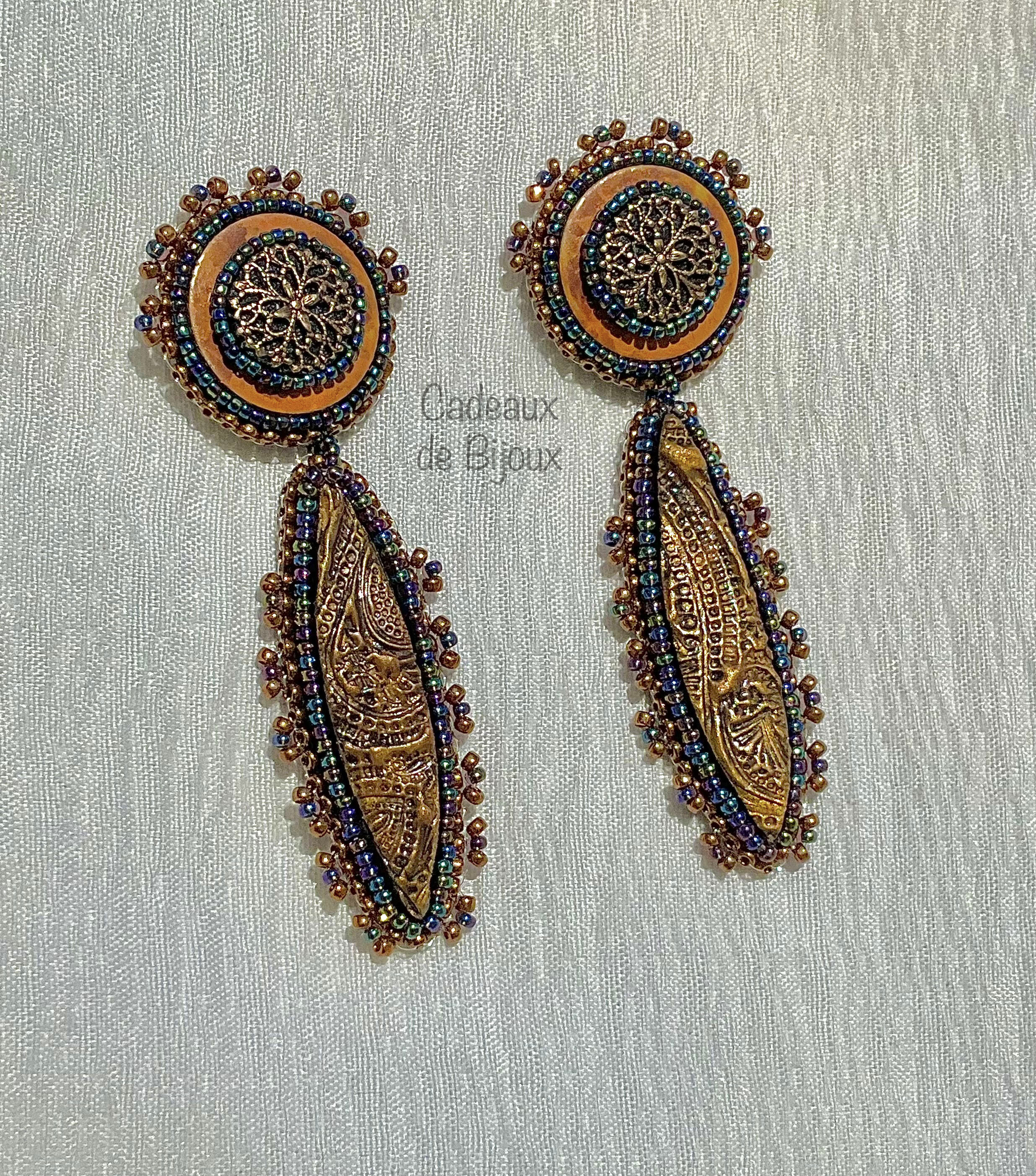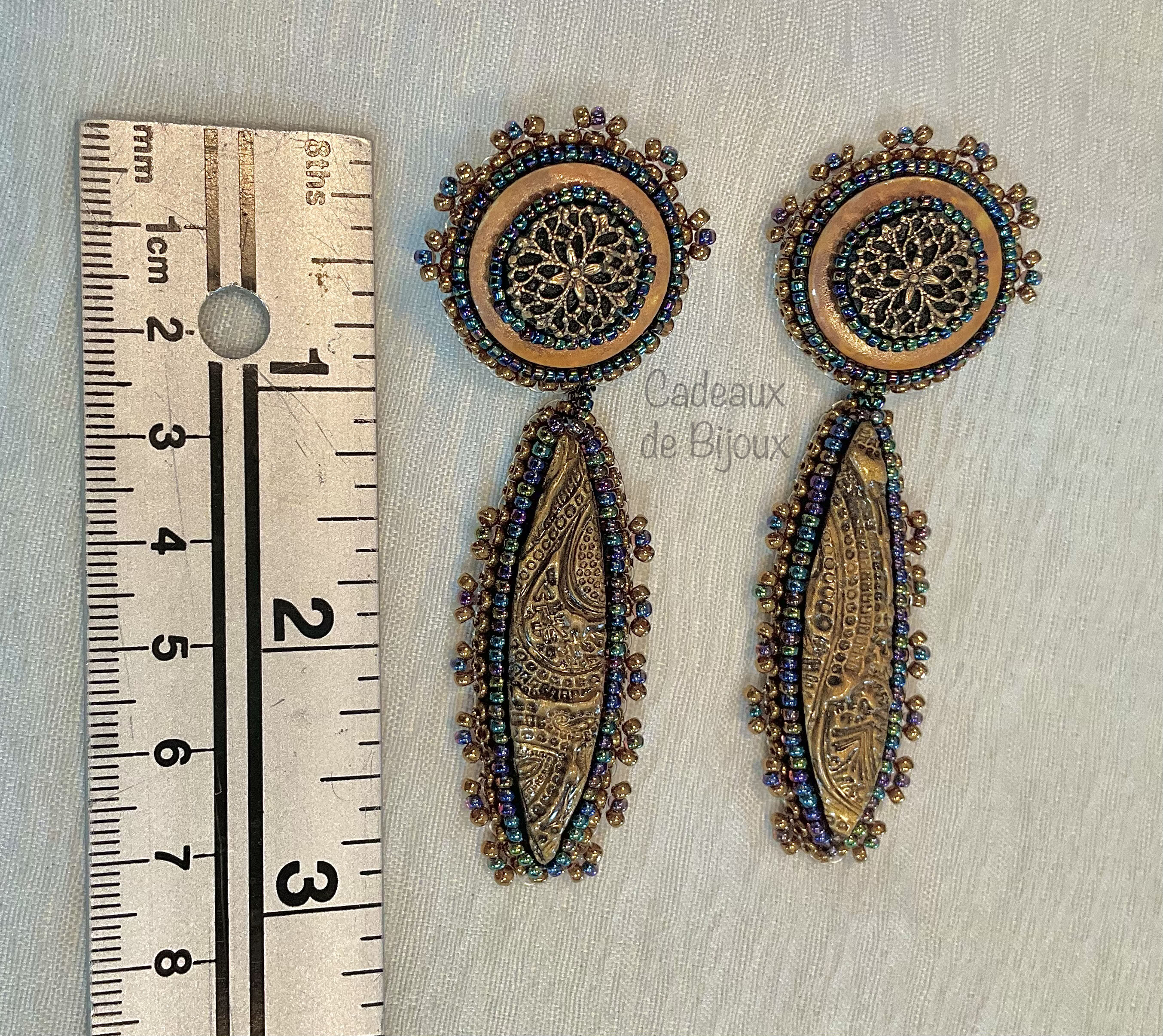 An intriguing juxtaposition of sealed rusty washers and delicate filigree. Hand cast polymer clay, Czech and Japanese glass beads in bronze and iridescent blues. Much lighter than they look at .712g / .251oz. each and 3” total length. Entirely hand beaded. Hypoallergenic surgical steel posts. No animal products used. Lined in soft ultra suede. Created in a smoke free and animal free environment.