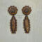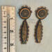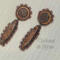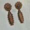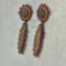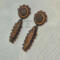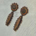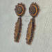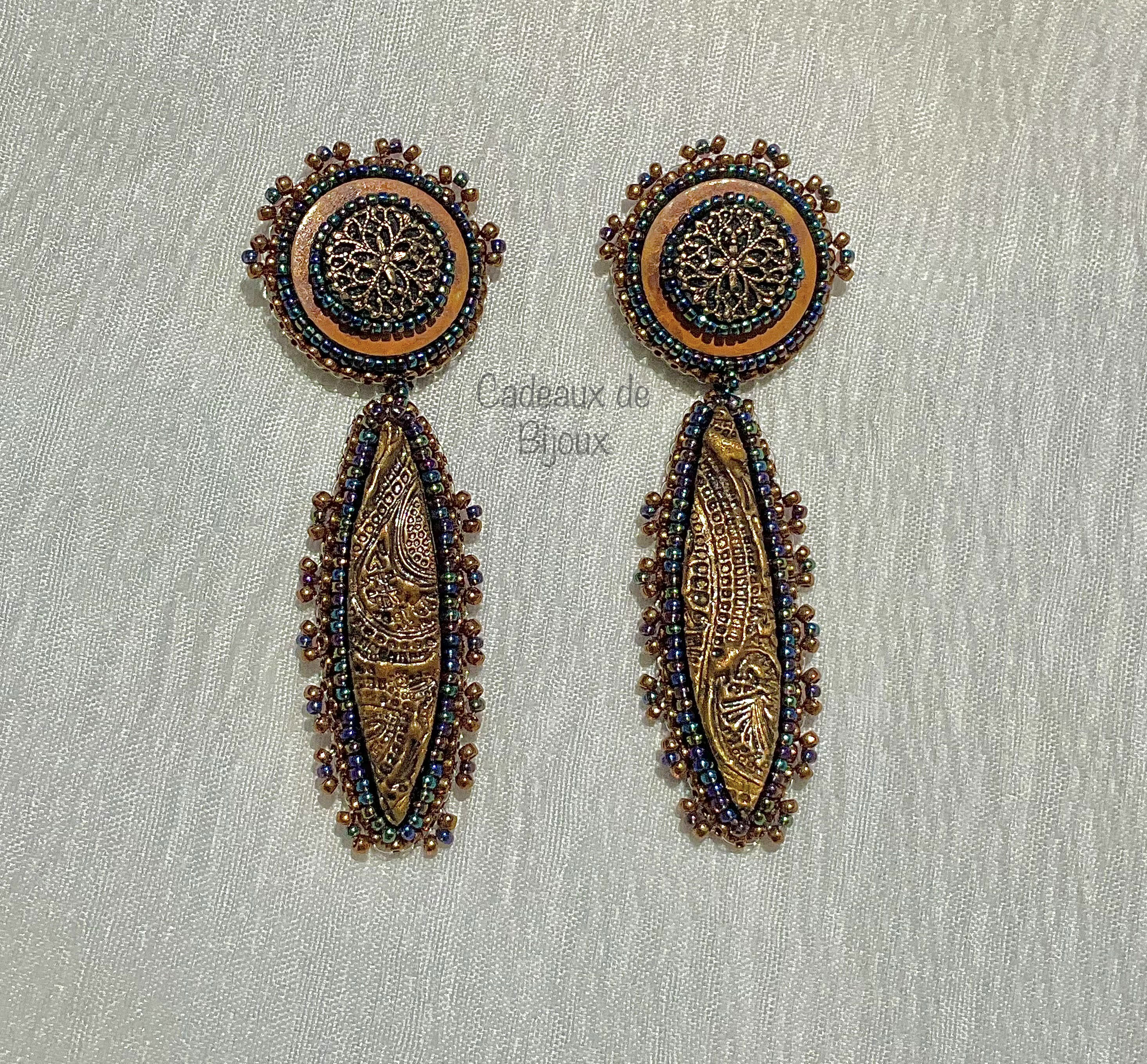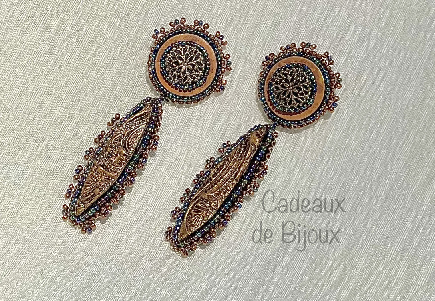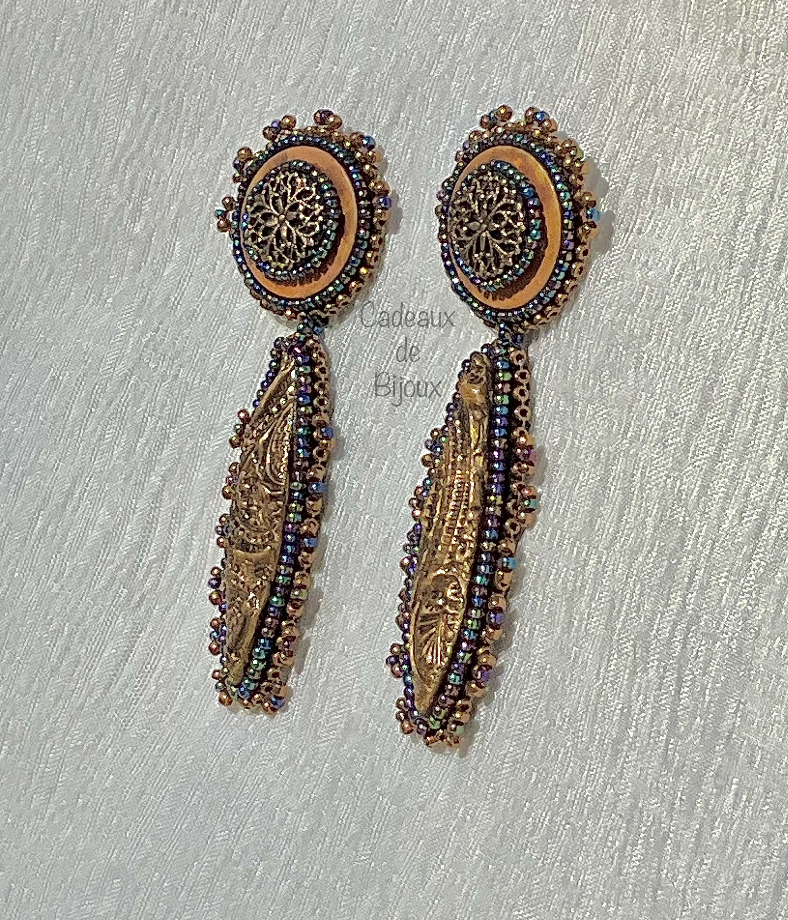 An intriguing juxtaposition of sealed rusty washers and delicate filigree. Hand cast polymer clay, Czech and Japanese glass beads in bronze and iridescent blues. Much lighter than they look at .712g / .251oz. each and 3” total length. Entirely hand beaded. Hypoallergenic surgical steel posts. No animal products used. Lined in soft ultra suede. Created in a smoke free and animal free environment.