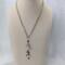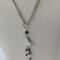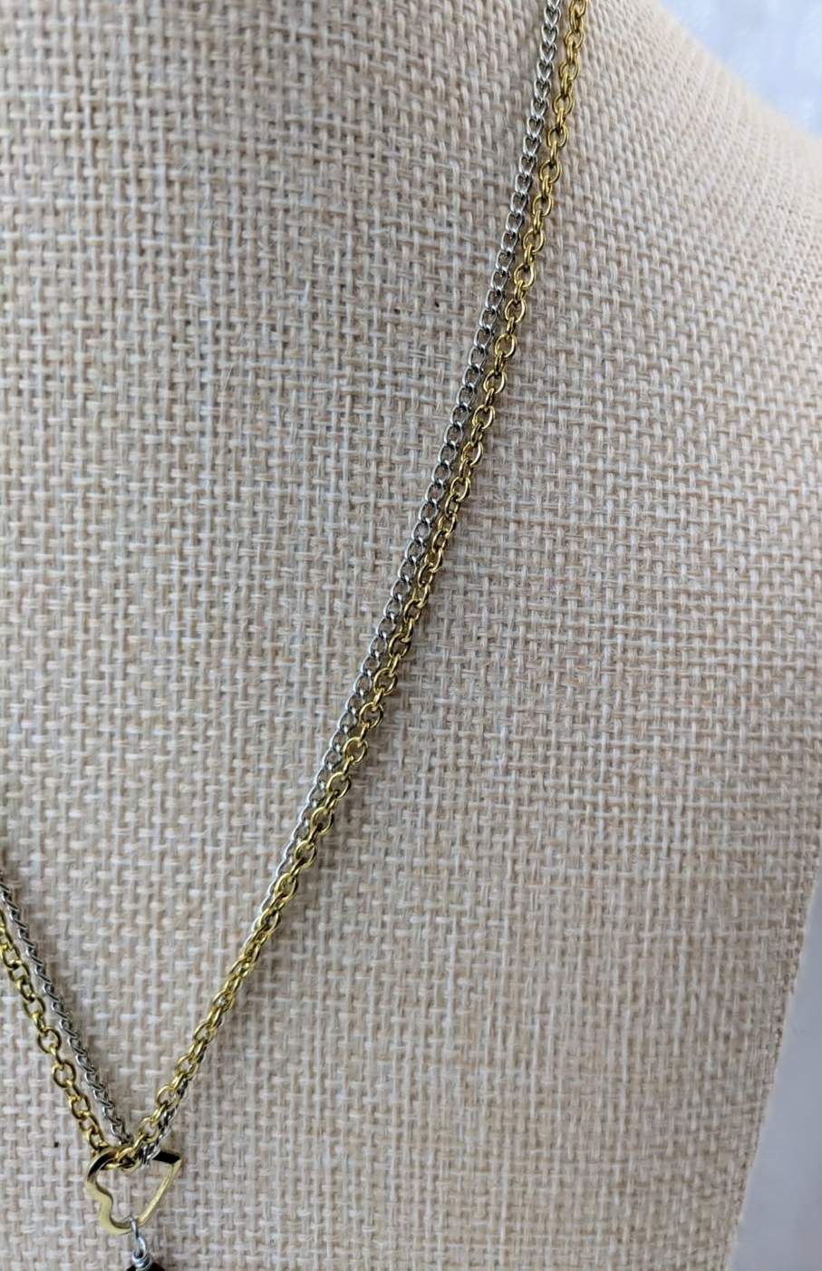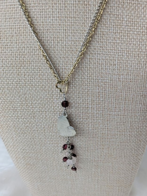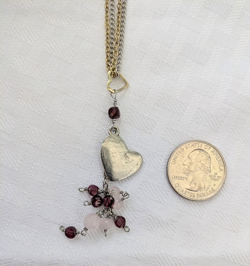 Romantic Silver-plated Heart Necklace with Garnet and Rose Quartz beads. This sweet necklace with double chains in gold and silver measures approximately 16" Long with a 1 and 1/2" extender. The bail is made up of a tiny (1/4") open heart with a faceted Garnet bead (6 mm). The silver heart dangles at an angle and measures approximately 3/4" long and wide. From the top of the bail to the bottom of the last bead is approximately 3" in length from the top of the silver heart to the bottom of the last bead is approximately 2" in length.