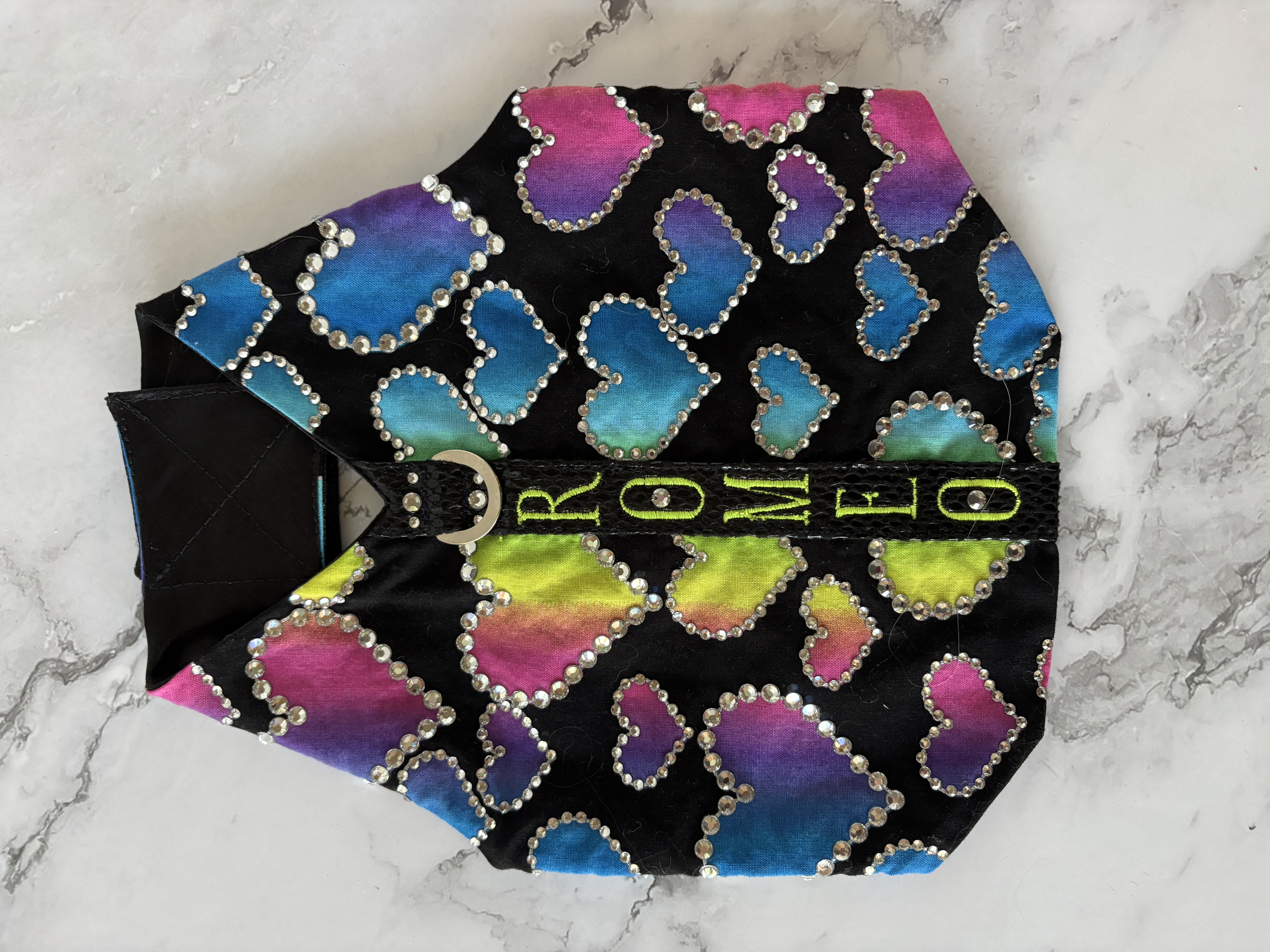 The harness is made with beautiful rainbow hearts cotton, and it has a solid cast D-ring to use for a leash. I made this using pure Austrian Crystals (I can no longer use the name brand of the crystals because I am no longer a brand partner with them), and they are stunning and capture the light so beautifully. I have no idea how many there are, but it's in the hundreds or more.