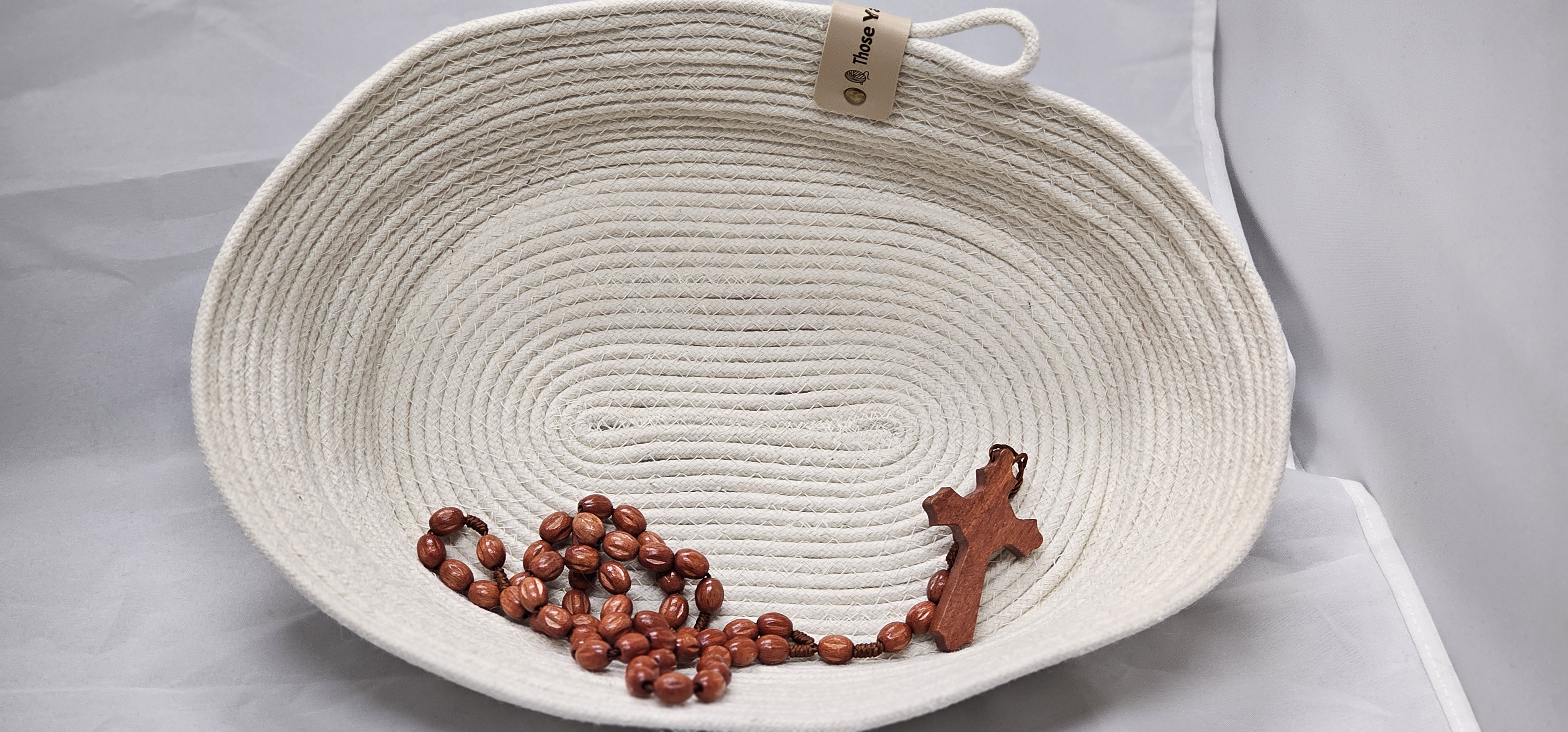This medium oval rope bowl is sewn with soft cotton rope, thread and finished with a leather tag and a rivet.. This will be beautiful for display or to store any number of trinkets or candies. Bowl measures approximately 8.5 inches by 3 inches.
