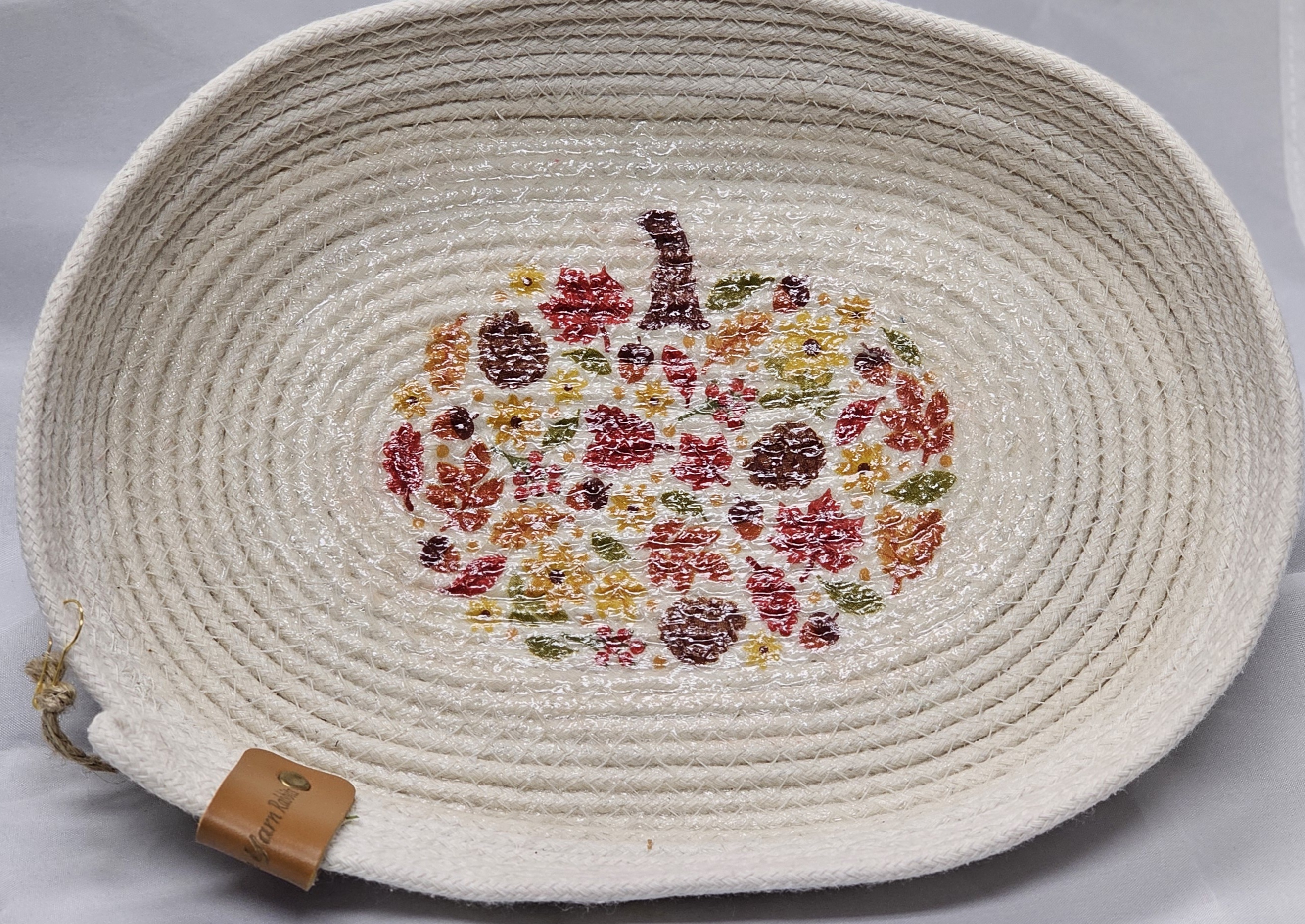 This small oval rope bowl is sewn with cotton rope and thread. The bottom is decorated with a fall themed pumpkins from leaves, berries and pinecones. This will be beautiful for display or to store any number of trinkets or candies. Bowl measures approximately 8 inches by 1.25 inches.