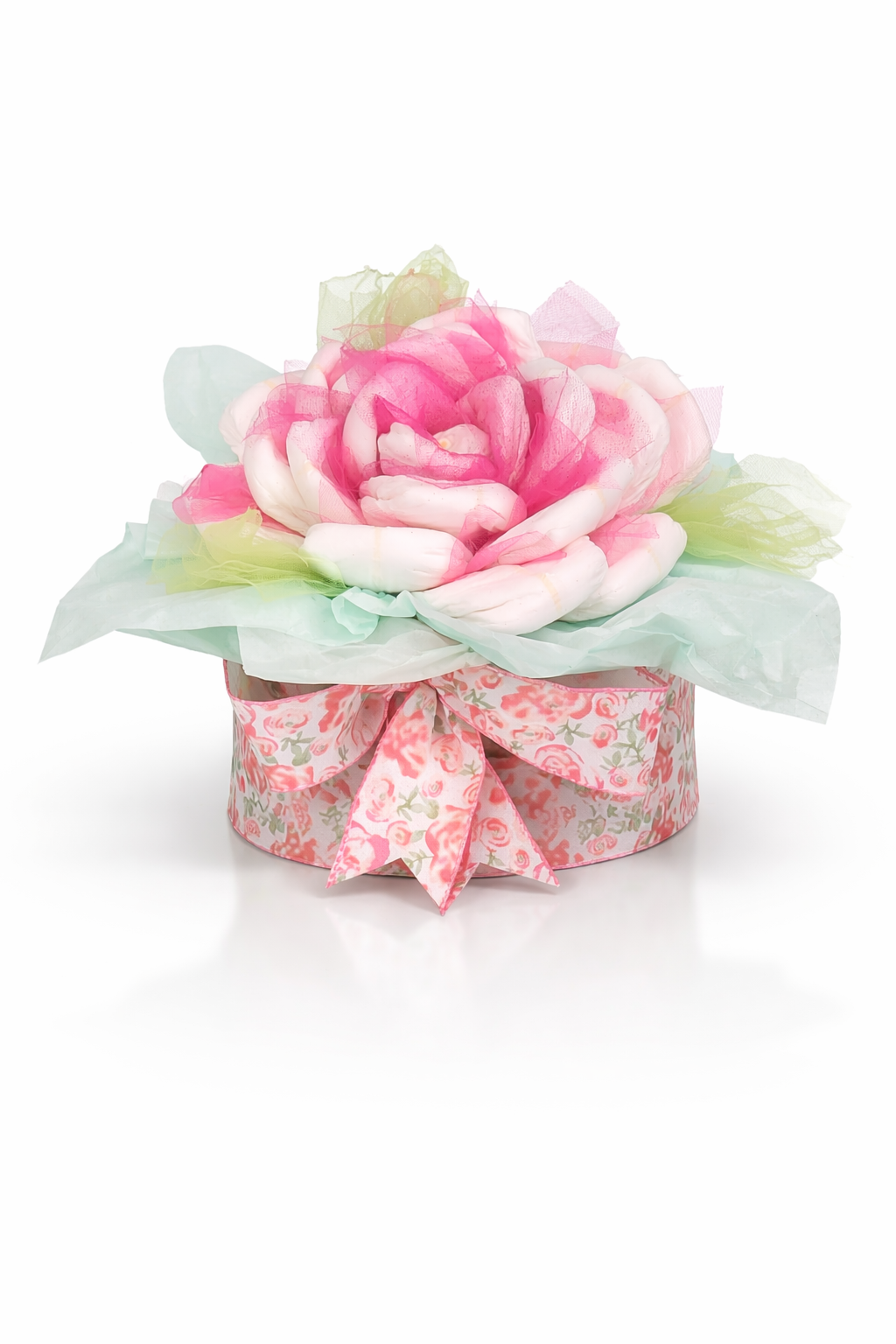 Celebrate a sweet new arrival with this beautifully handcrafted floral diaper cake. Designed in soft pink and white tones, this elegant piece features a delicate flower-style topper accented with airy tulle and finished with a coordinating floral ribbon around the base. It’s both a charming centerpiece and a practical baby gift.