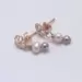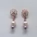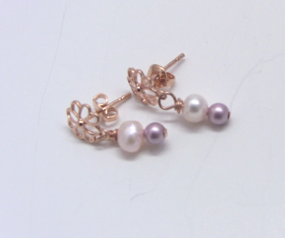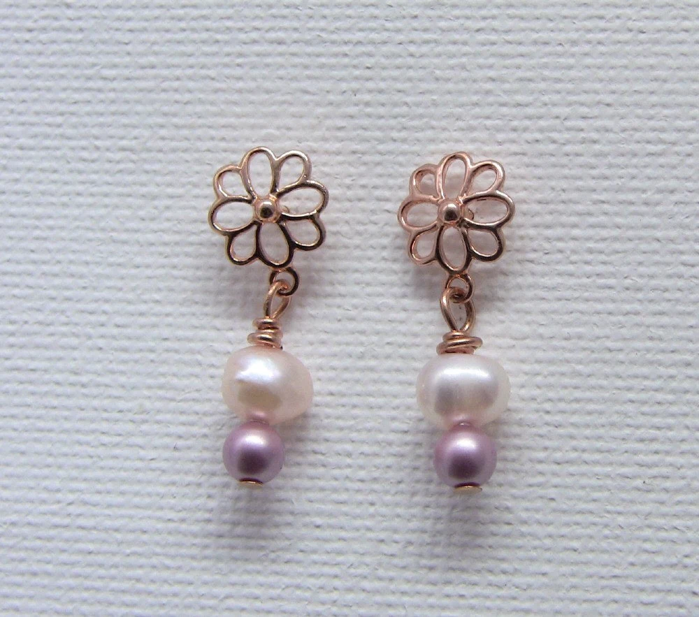 These cute rose gold-plated post earrings feature a flower with a light pink potato pearl and small rose Swarovski pearl attached below it. The flower measures approx 3/8" in diameter. Each earring is approx 1" in length from the top of the flower.