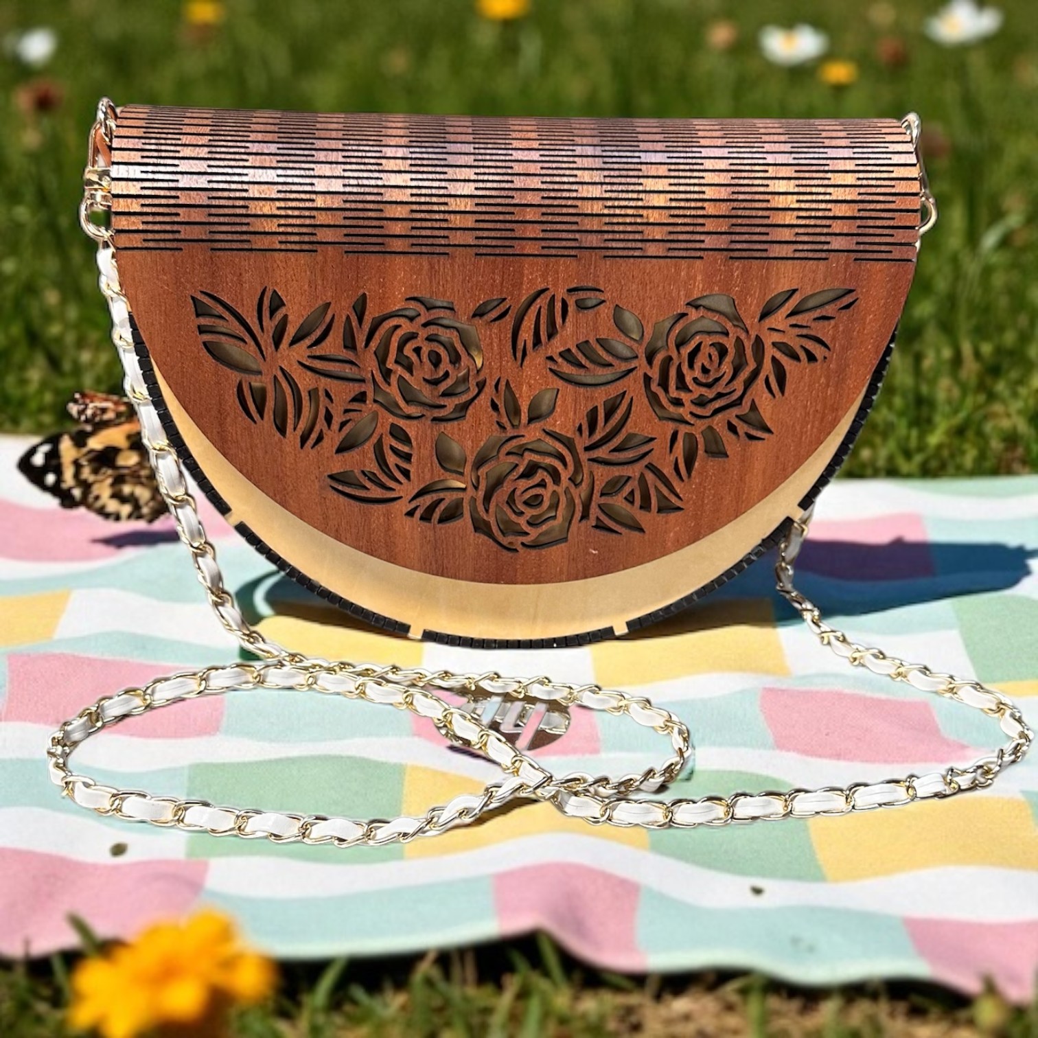 Each piece that makes up the purse is cut to size on a laser machine. Slats are cut into portions of the wood to create unique flexibility allowing the opening flap to bend as needed in a smooth fashion. Some include designs that have been laser engraved into the wood Once all pieces are done, it is then crafted and glued together for the final product.