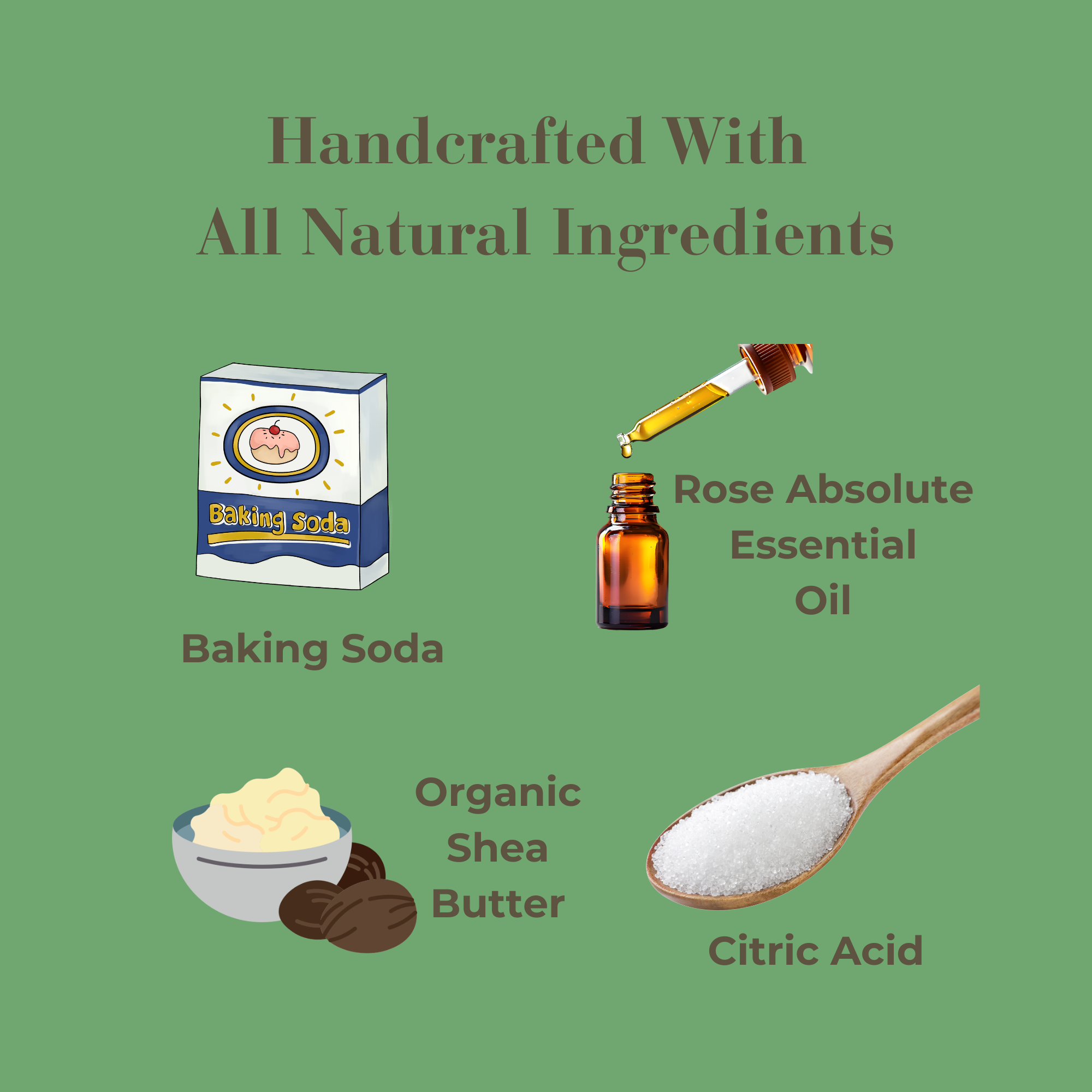 Ingredients: Baking Soda, Citric Acid, Organic Shea Butter, Polysorbate 80, Rose Absolute Essential Oil, Pink Clay