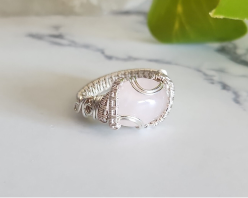 This ring was made with a Rose Quartz gemstone cabochon and Sterling Silver wires.