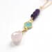 A colorful combination with three beautiful crystals, this rose quartz drop necklace is a darling piece. The rose quartz teardrop is paired with a pretty green chrysoprase connector and deep, rich amethyst. Suspended from gold filled cable chain, this multistone necklace is adjustable from 14 to 16 inches with the 2 inch extender. Finished with a gold filled lobster clasp.