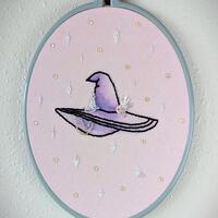 The piece is 6.5" wide, with a black plastic hoop. The stitching is on two layers of cotton fabric, with watercolor and rhinestone embellishments. The hat features tiny roses and a cluster of iridescent beads.