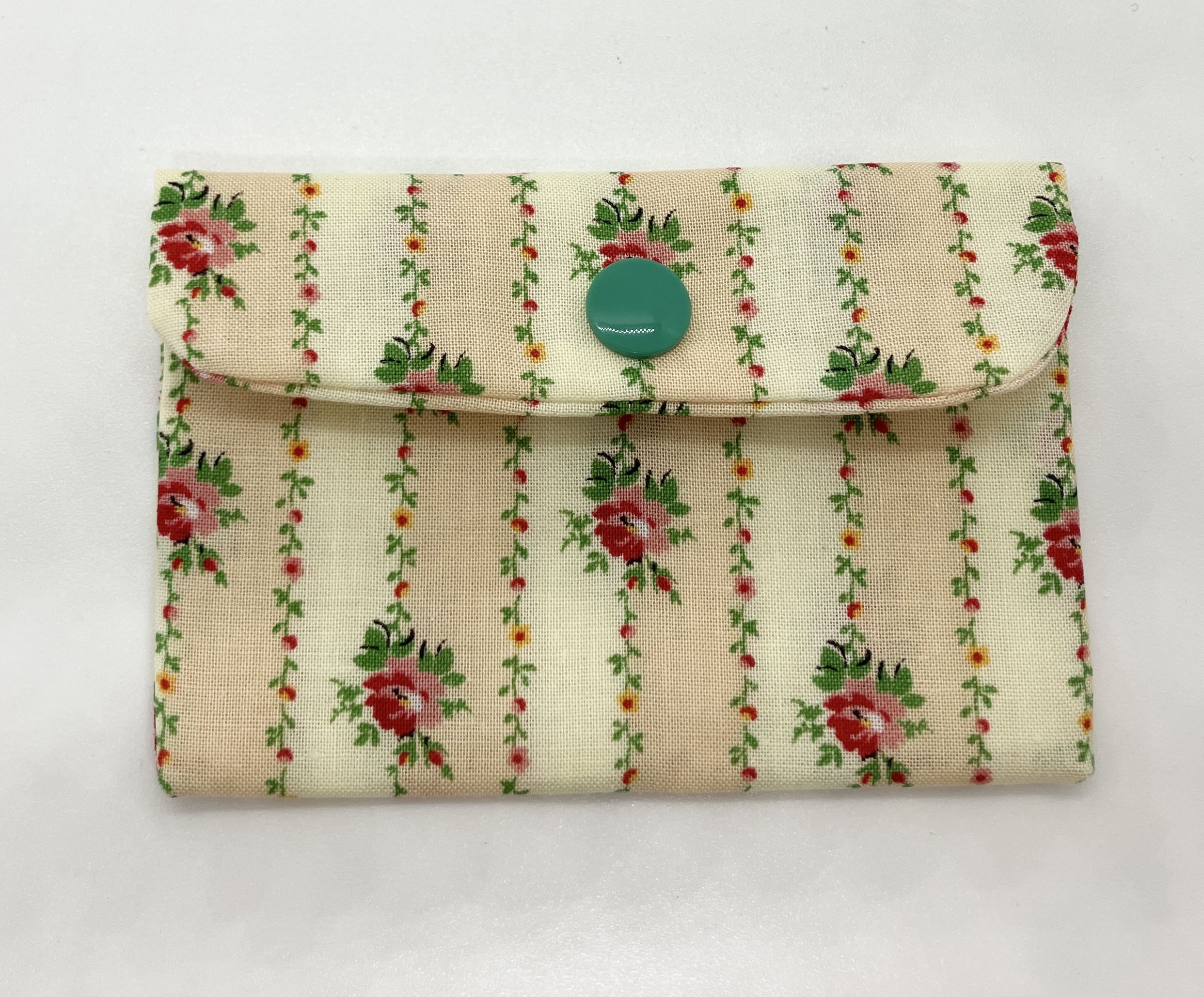 Roses on cream stripe mini wallet with snap closure.