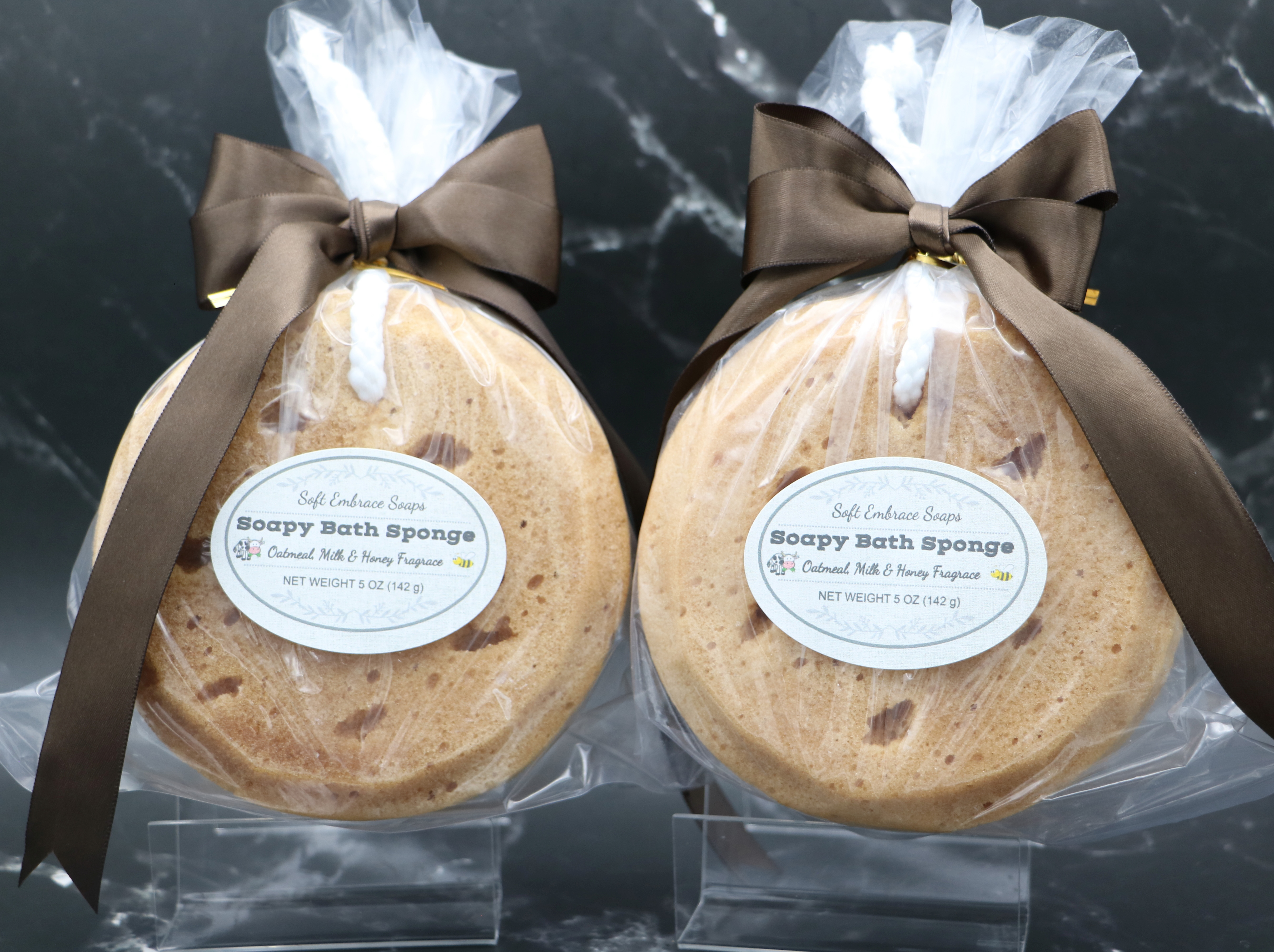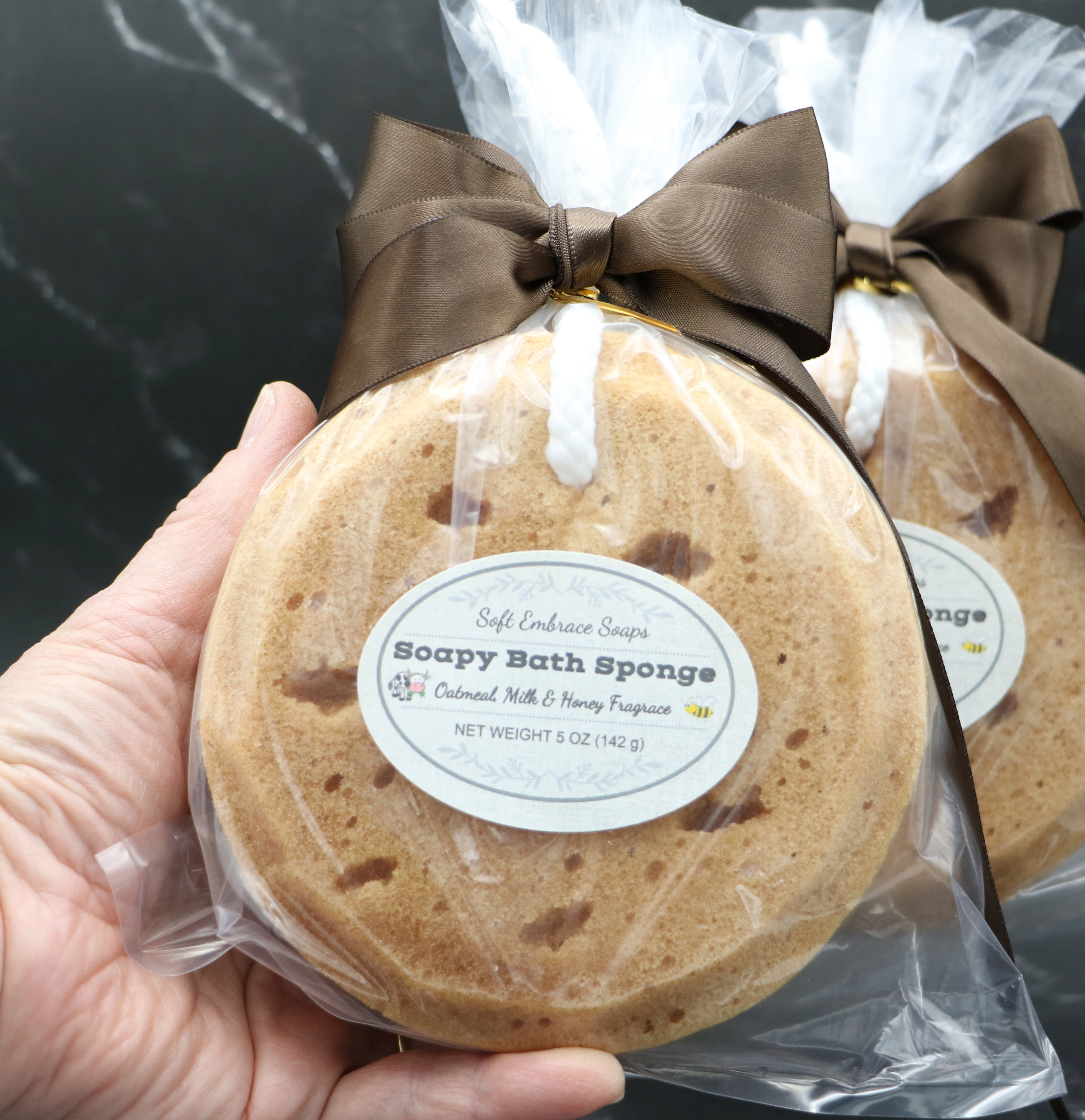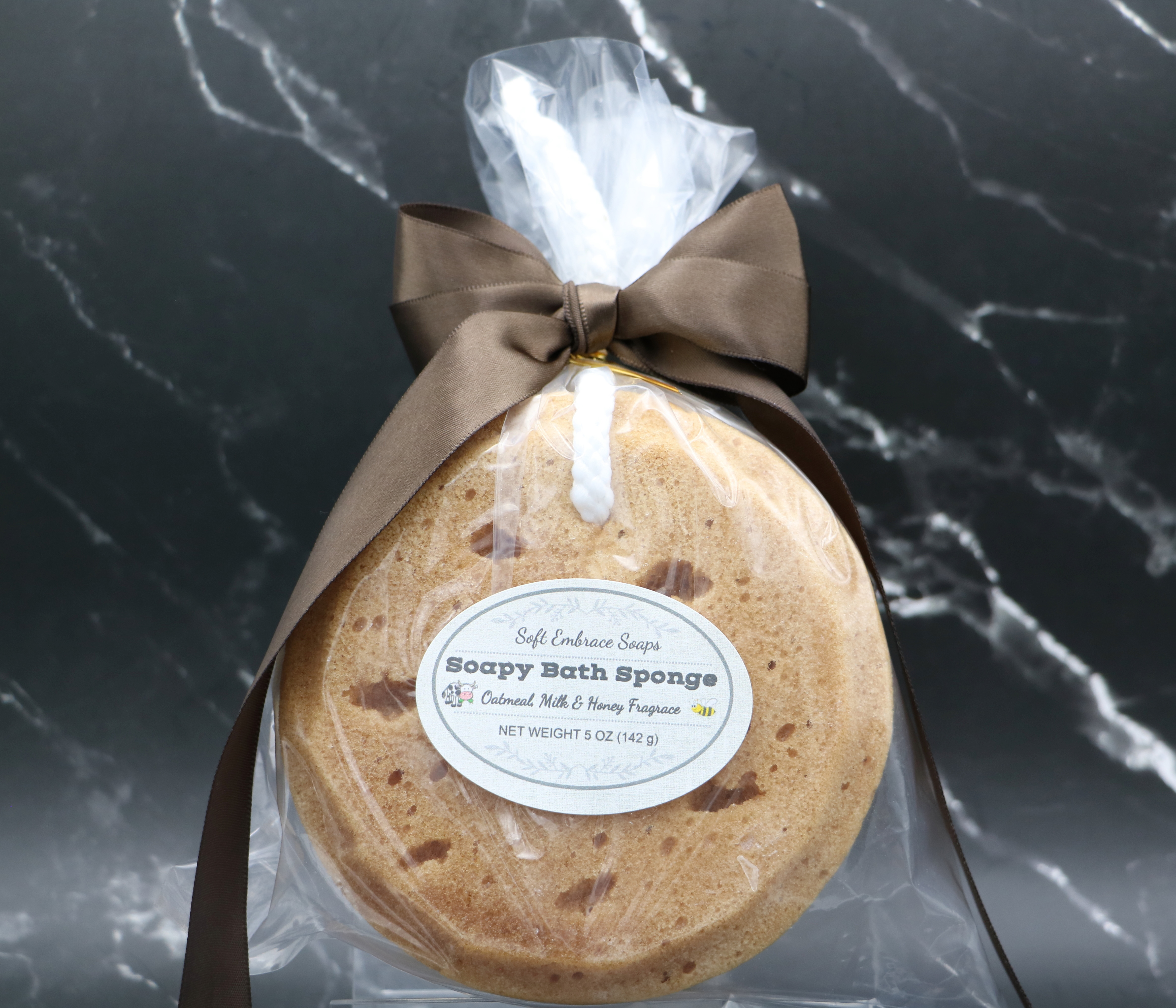 This plush bath sponge is scented with a very popular fragrance oil: Oatmeal, Milk & Honey. This scent is described as a delicious blend of pure, sweet honey, creamy milk, & warm oats. Bringing back memories of cold winter mornings while mom was making breakfast. Soapy Bath Sponges envelop your skin in a rich, foam-filled lather that feels silky smooth & luxuriously soft, while the aromatic notes of the scented oils awaken your senses & elevate your bathing ritual.
