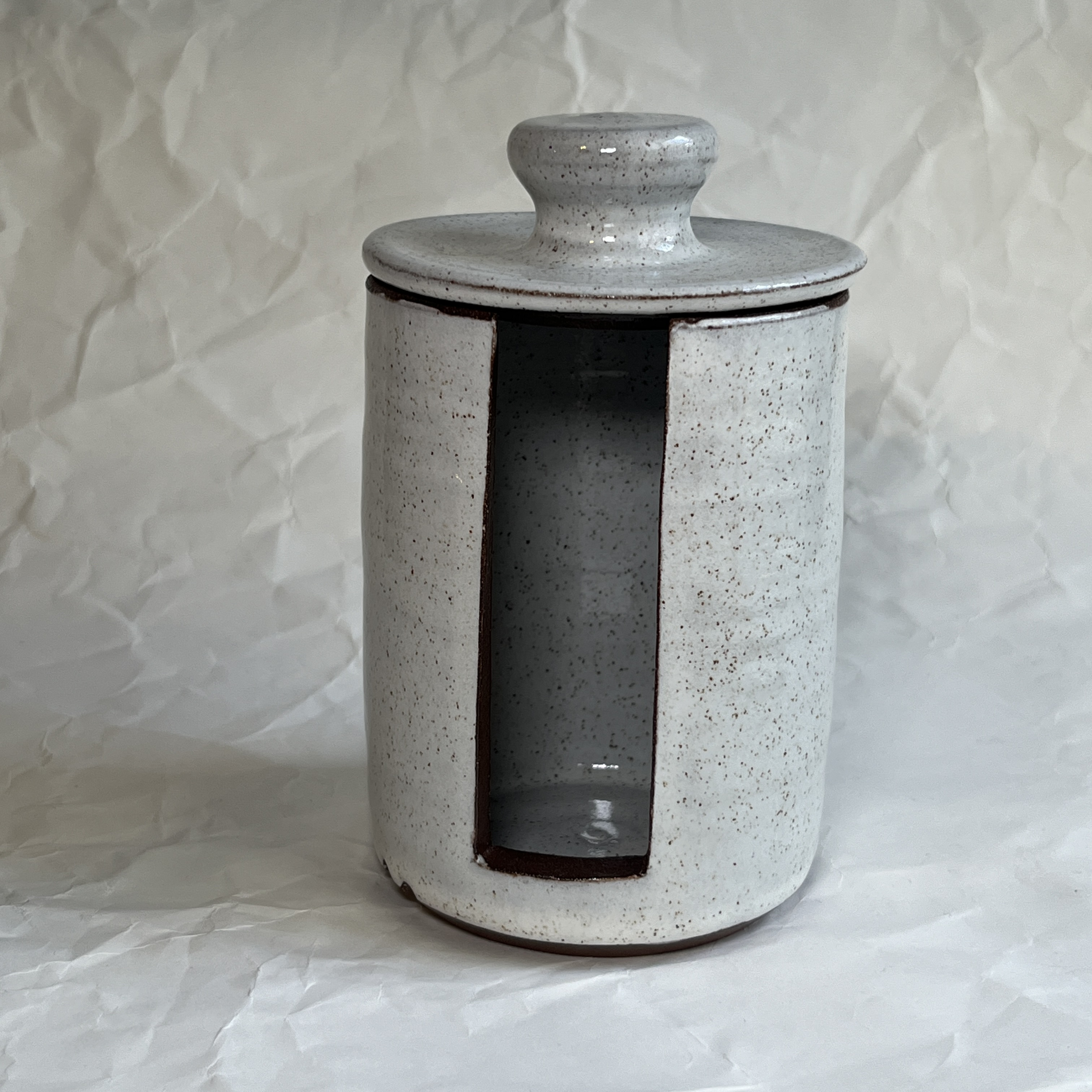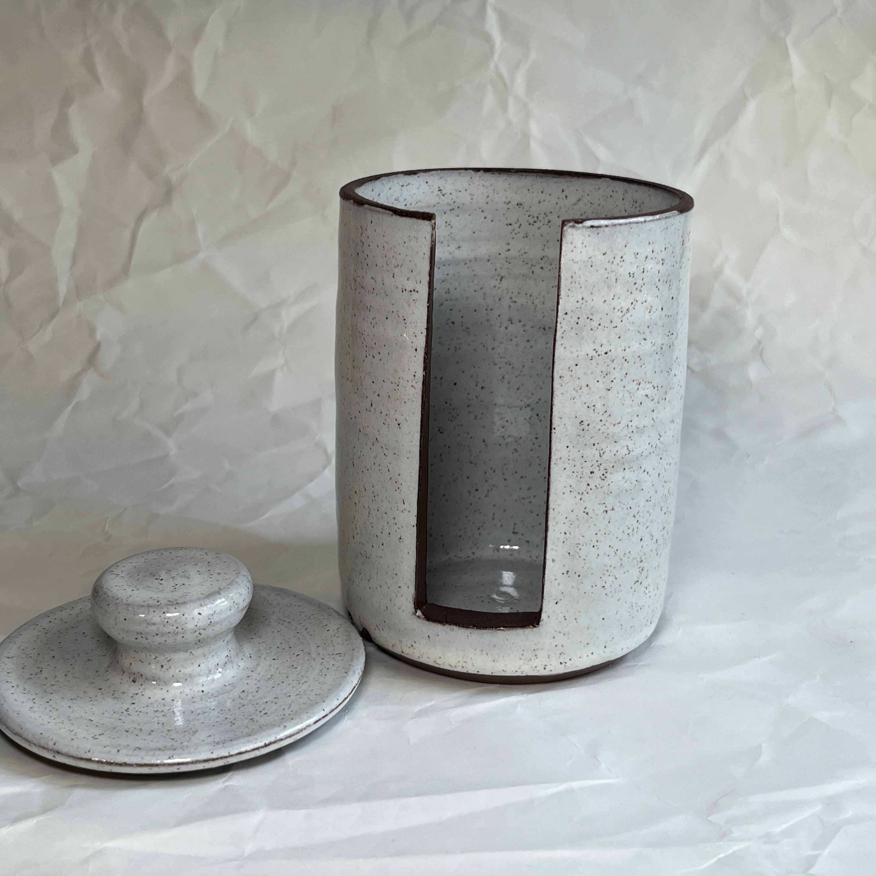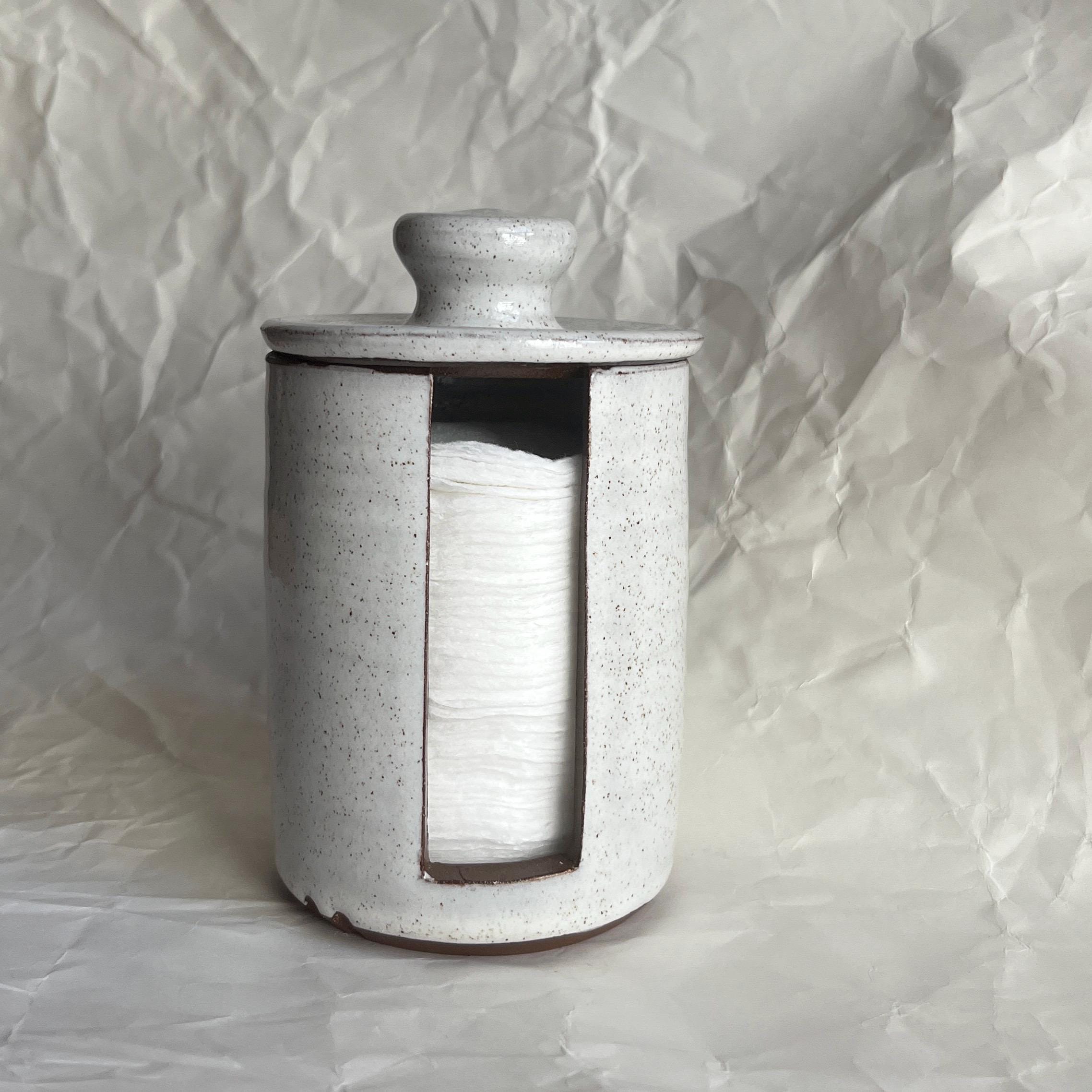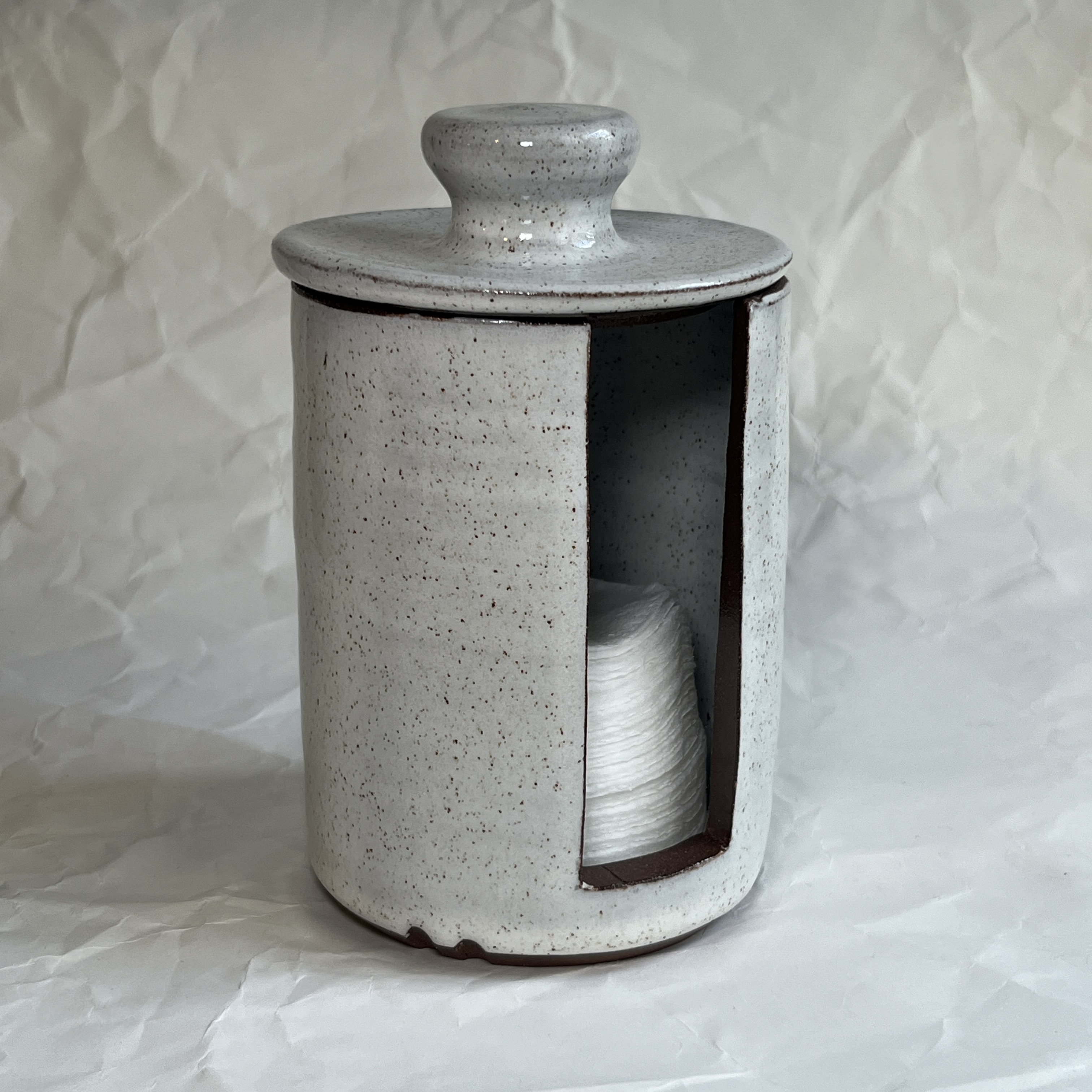 Add elegance to your bathroom or vanity with this handmade ceramic cotton pad caddy. Designed with a front slit for easy access, this piece makes it simple to store, refill, and grab fresh cotton rounds. Crafted from red stoneware clay and finished with a soft speckled white glaze, it’s a practical yet beautiful way to keep your essentials close at hand.