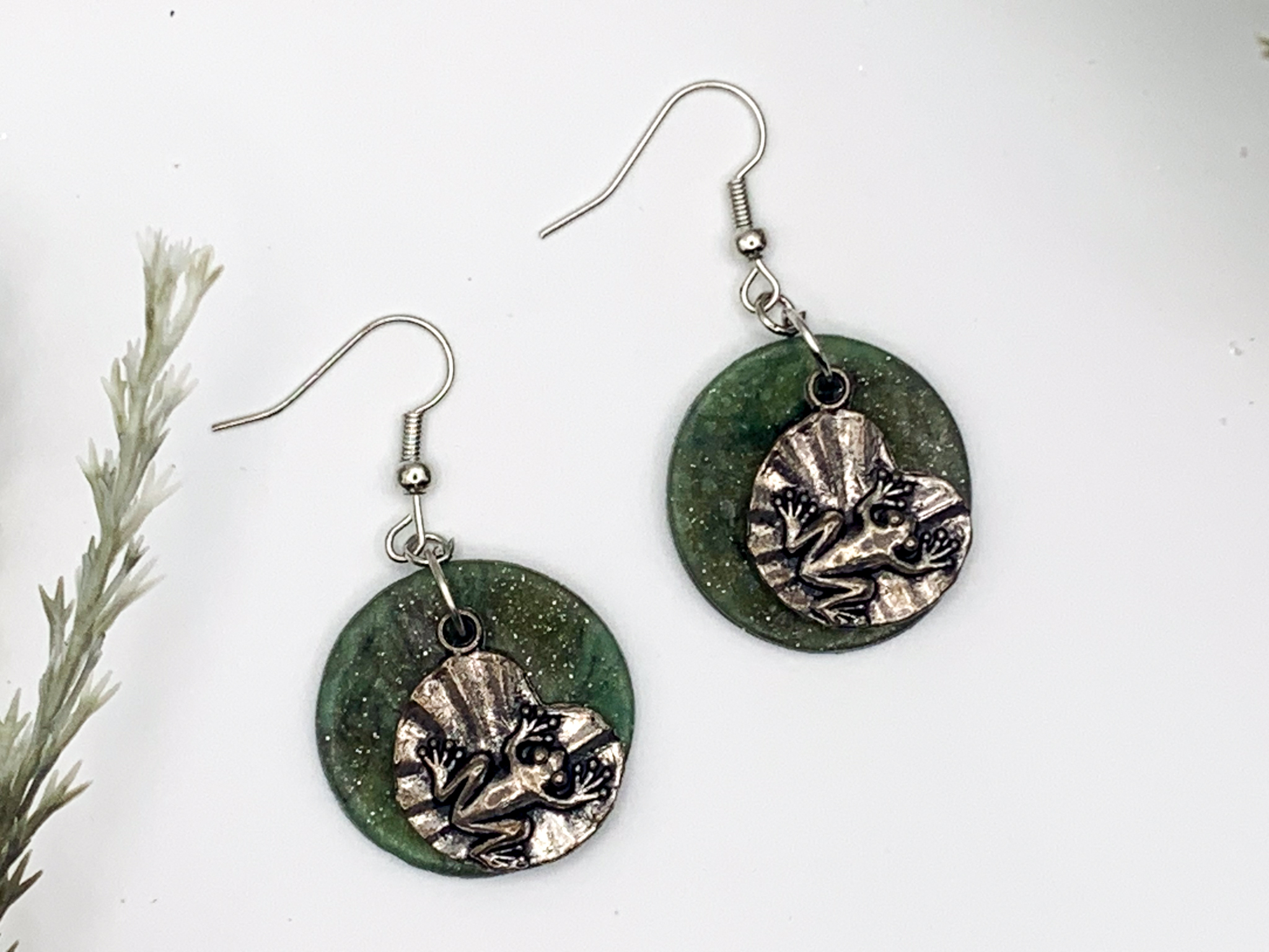Hop into style! These round green clay earrings are accented with a silver frog charm for a playful, nature-inspired accessory that’s lightweight and fun.