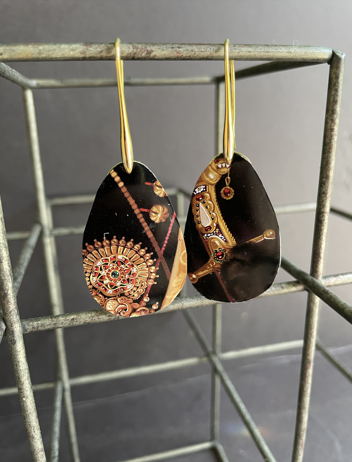 A dark kitty cat draped in royal finery sat on this tea tin. These earrings feature close ups of the feline's paw on the hilt of a sword and some jewelry on it's jacket, but the secret is the word "cats" dangling from the back of the larger pieces. The earring findings are gold plated.