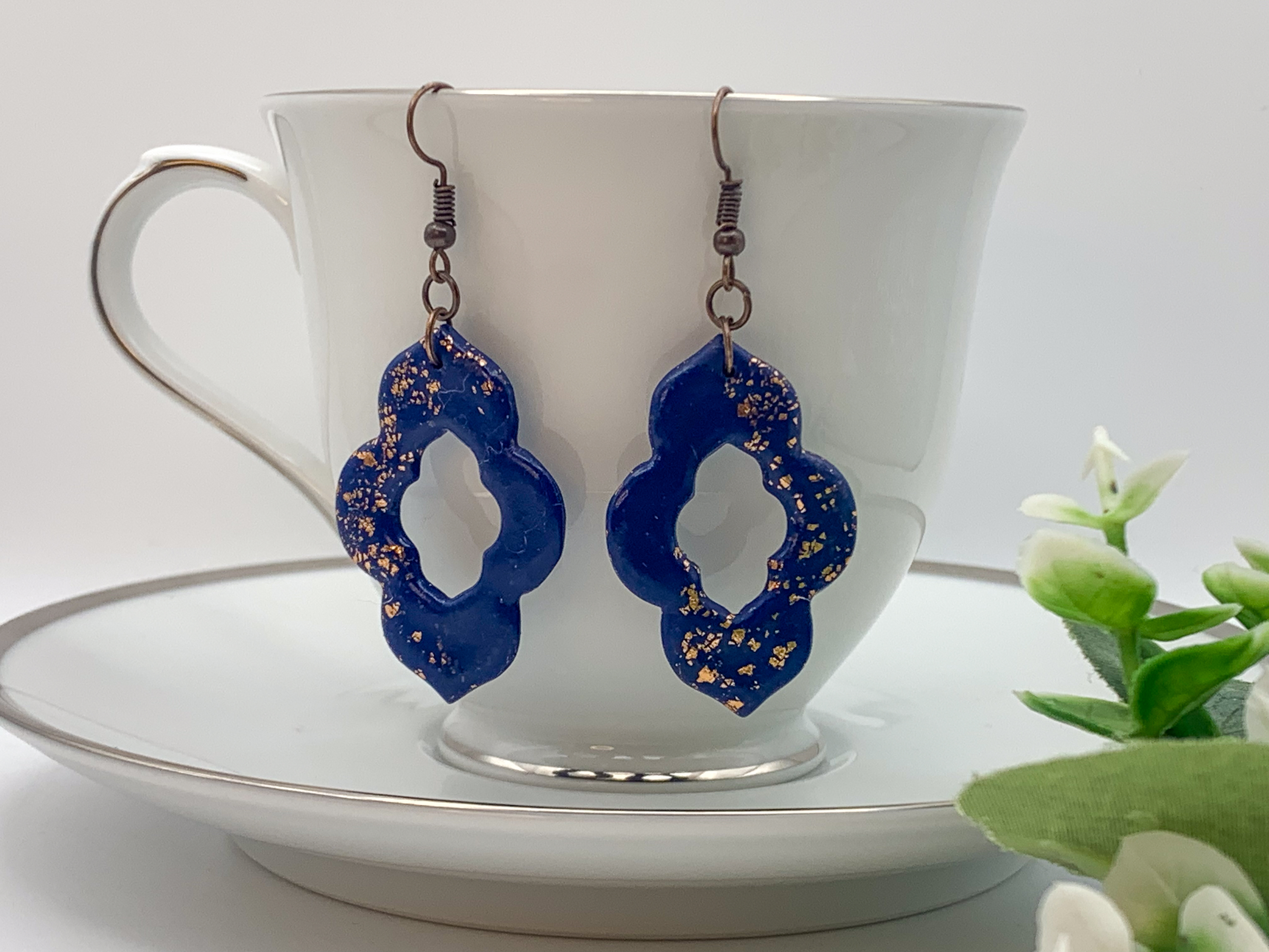 These bold navy quatrefoil earrings are sprinkled with golden flecks for a luxurious, timeless look. Lightweight and perfect for making a statement! ✨