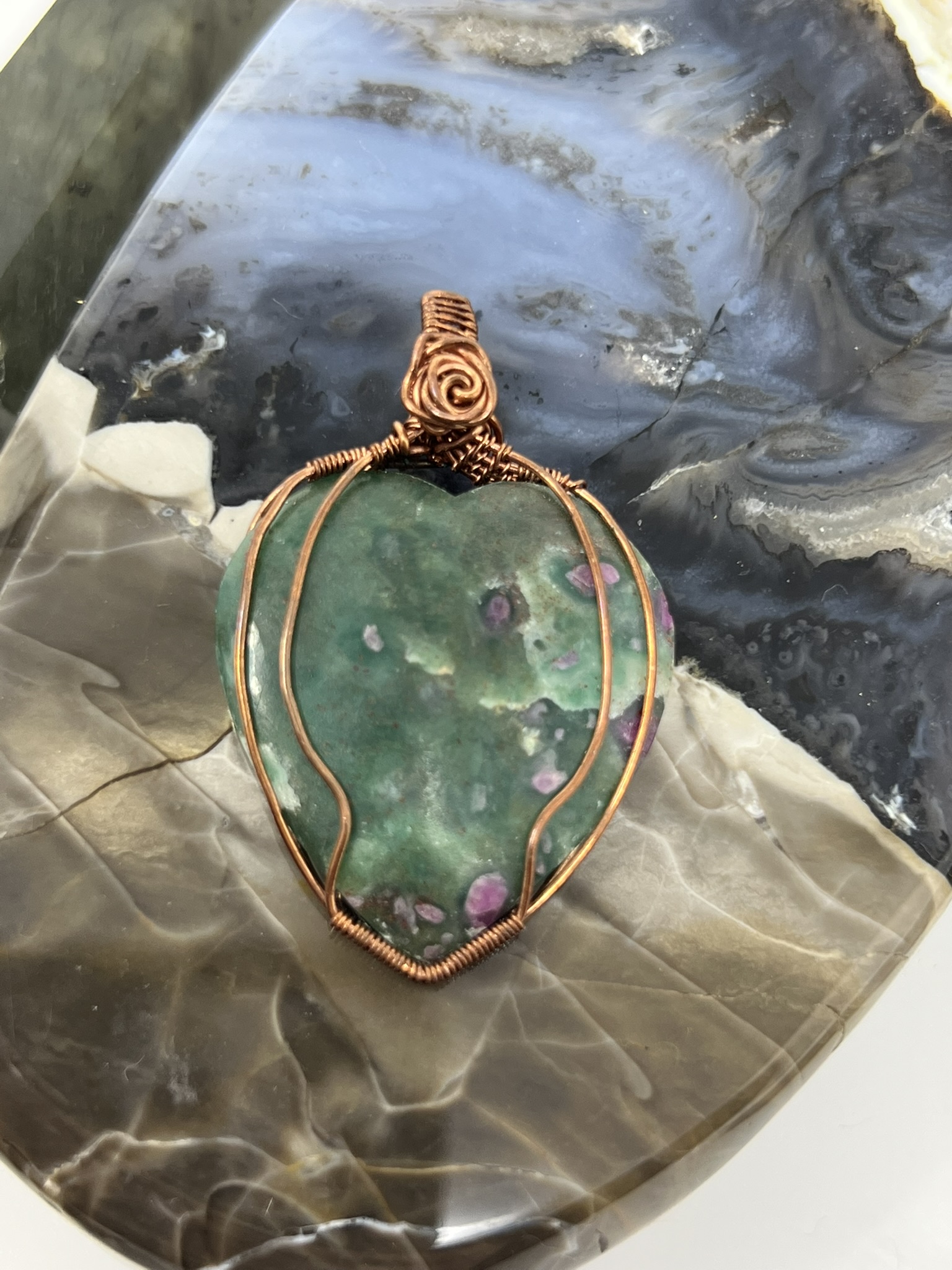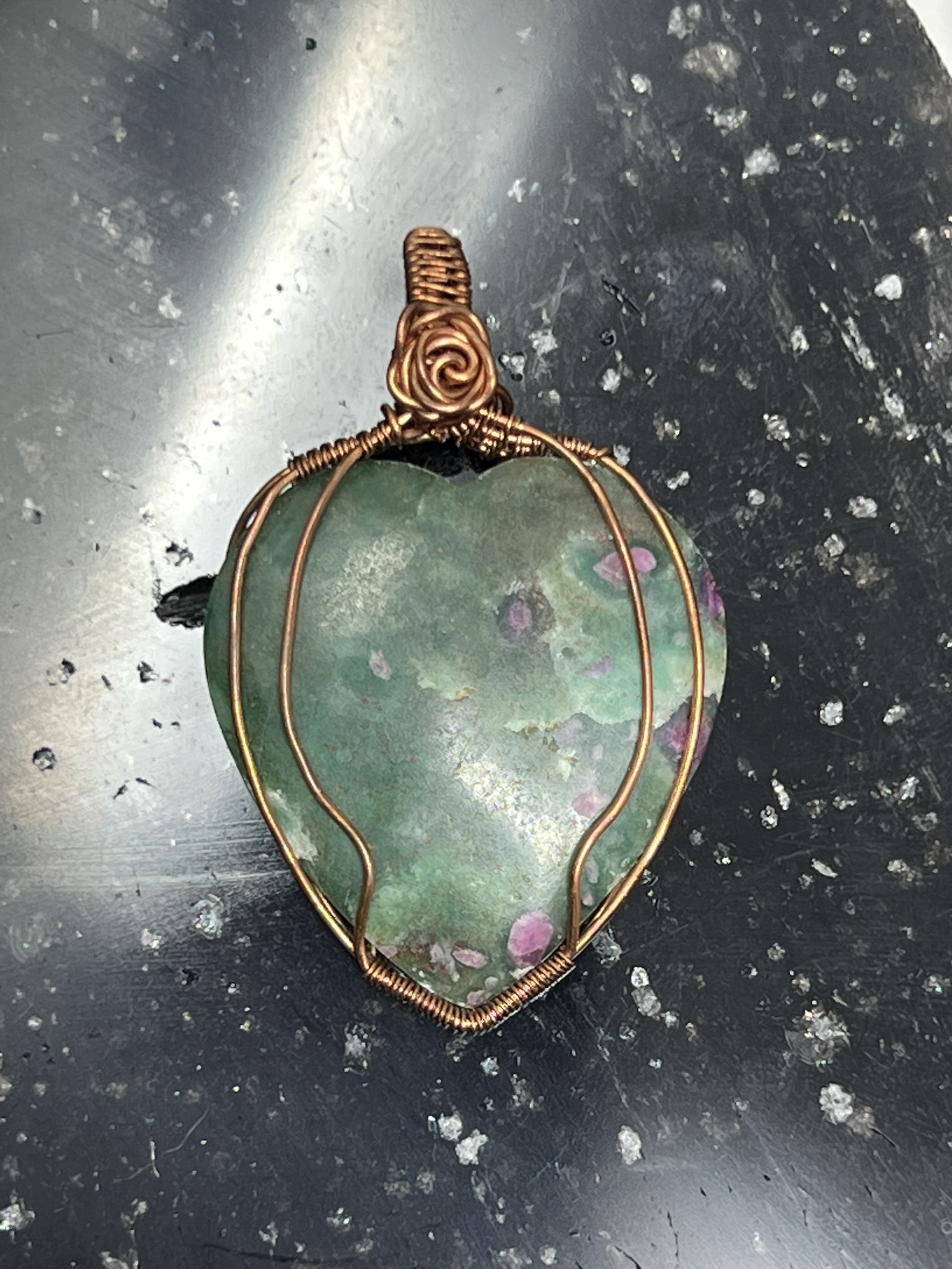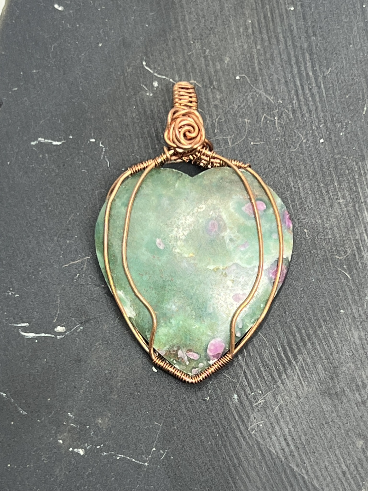 This cute pendant features a ruby in fuchsite heart cabochon that has been wrapped in copper wire. I created this piece by taking 4 pieces of 20 gauge round copper wire and connecting them at the bottom with 28 gauge round copper wire. The bail is made by weaving 28 gauge round copper wire around 2 pieces of 20 gauge round copper wire. The rose detail at the top is made by wrapping 2 pieces of the 20 gauge round copper wire around each other. This piece is handmade in Minnesota.