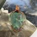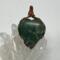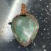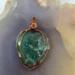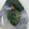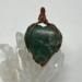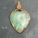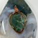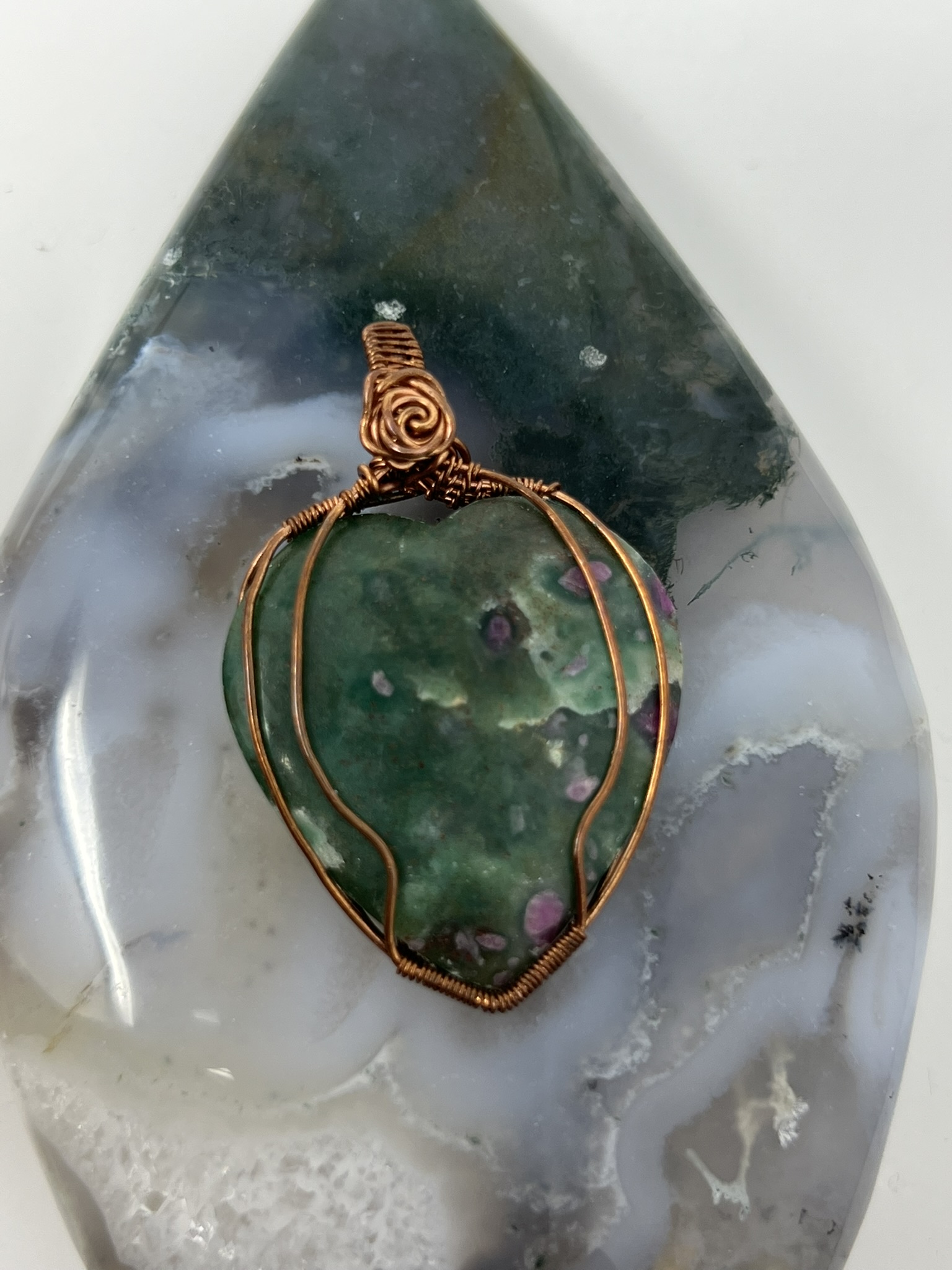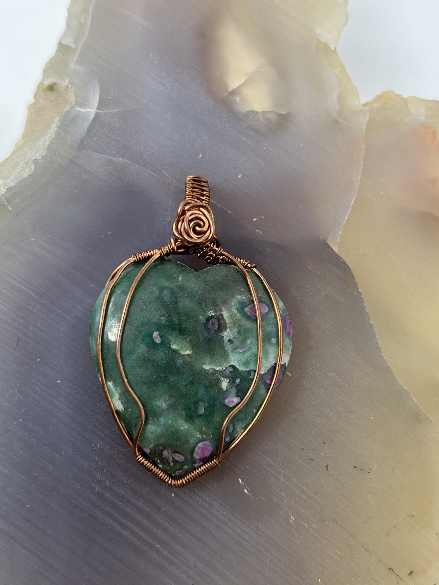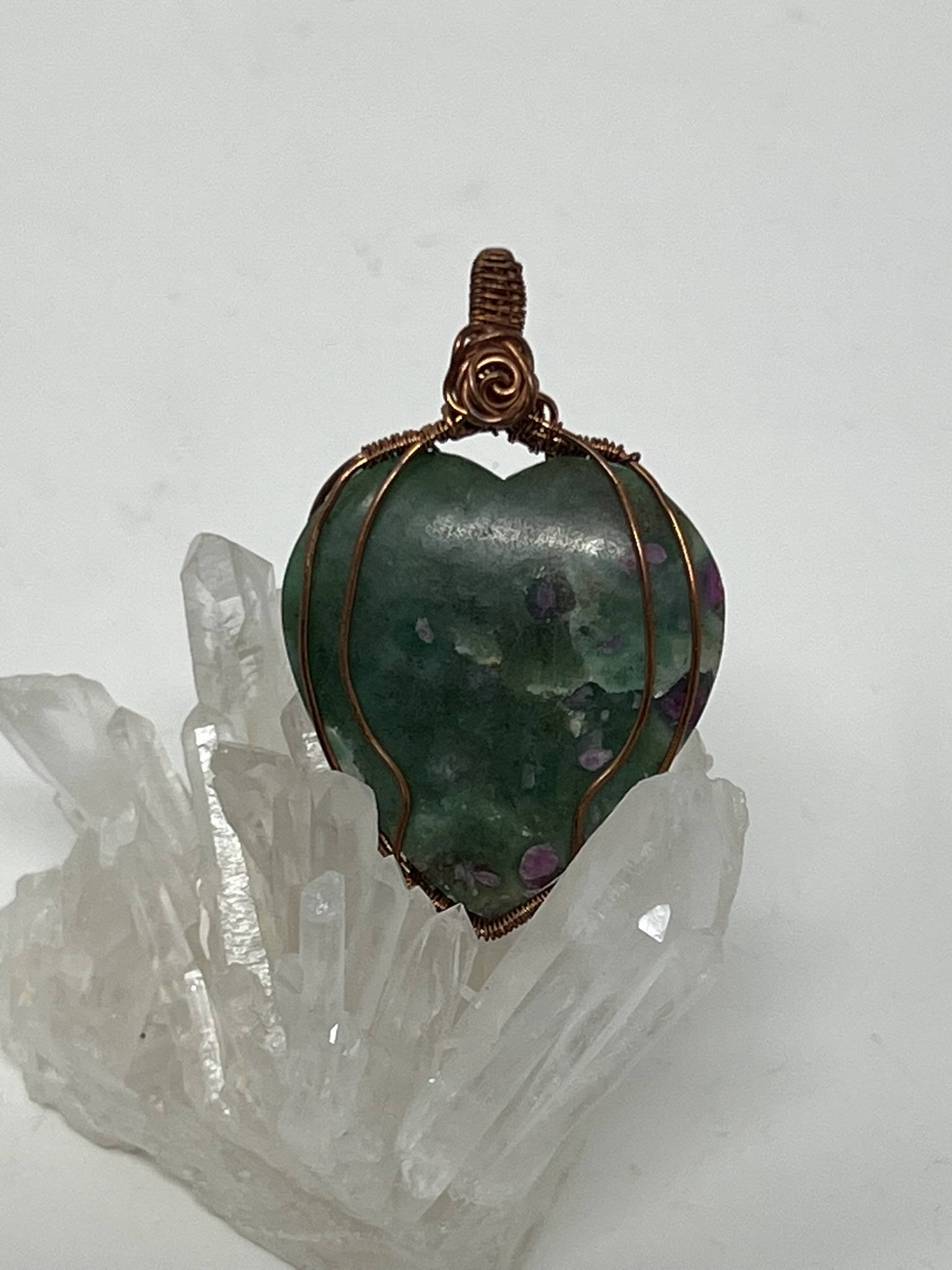 This cute pendant features a ruby in fuchsite heart cabochon that has been wrapped in copper wire. I created this piece by taking 4 pieces of 20 gauge round copper wire and connecting them at the bottom with 28 gauge round copper wire. The bail is made by weaving 28 gauge round copper wire around 2 pieces of 20 gauge round copper wire. The rose detail at the top is made by wrapping 2 pieces of the 20 gauge round copper wire around each other. This piece is handmade in Minnesota.
