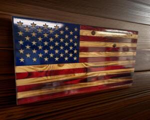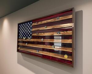 Shot Glass Shelf Display Rustic American Flag!!! Display your collection of Shot Glasses from all your experiences in a Patriotic Display. These Shelves can be used not only for Shot Glasses, but for all different types of items you wish to display. The best part of this Rustic American Flag display is the inlay shelve design! These shelves are inlayed into the wood which gives it much more strength and is actually imbedded into the flag....not to mention the best part, it looks absolutely Amazing!!