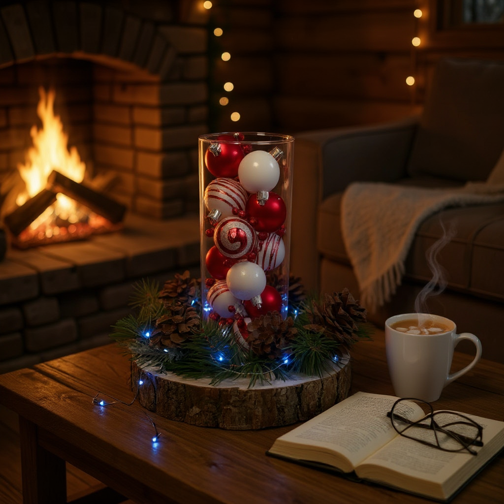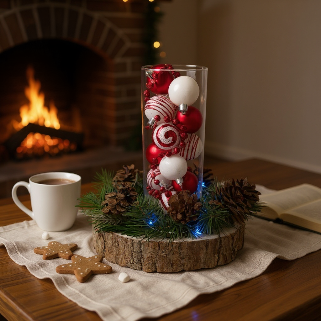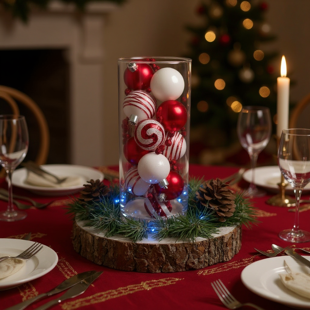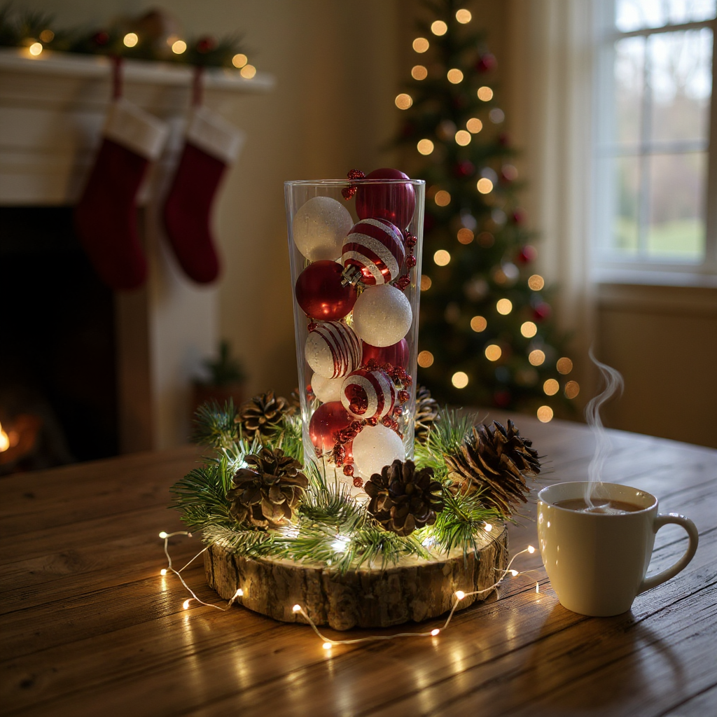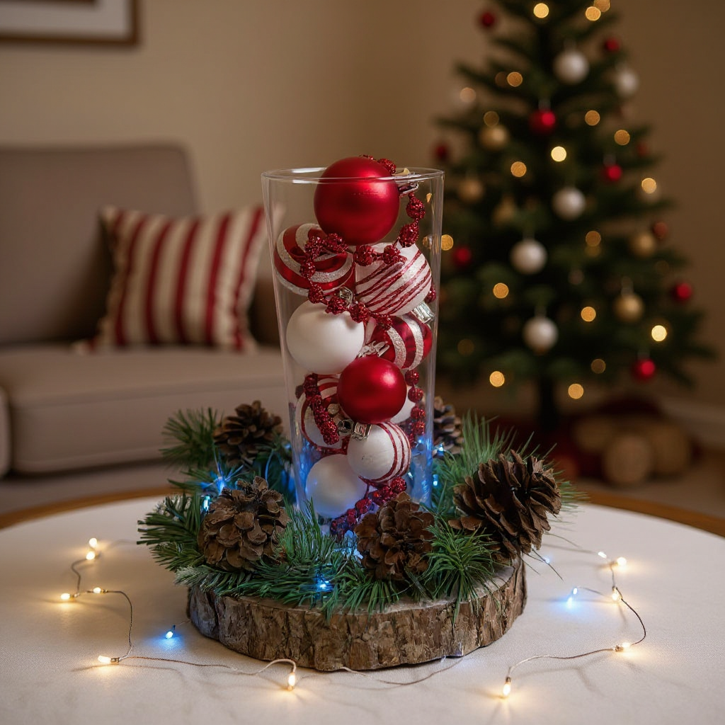 • Festive Glow – red-and-white ornaments paired with warm fairy lights for holiday sparkle.